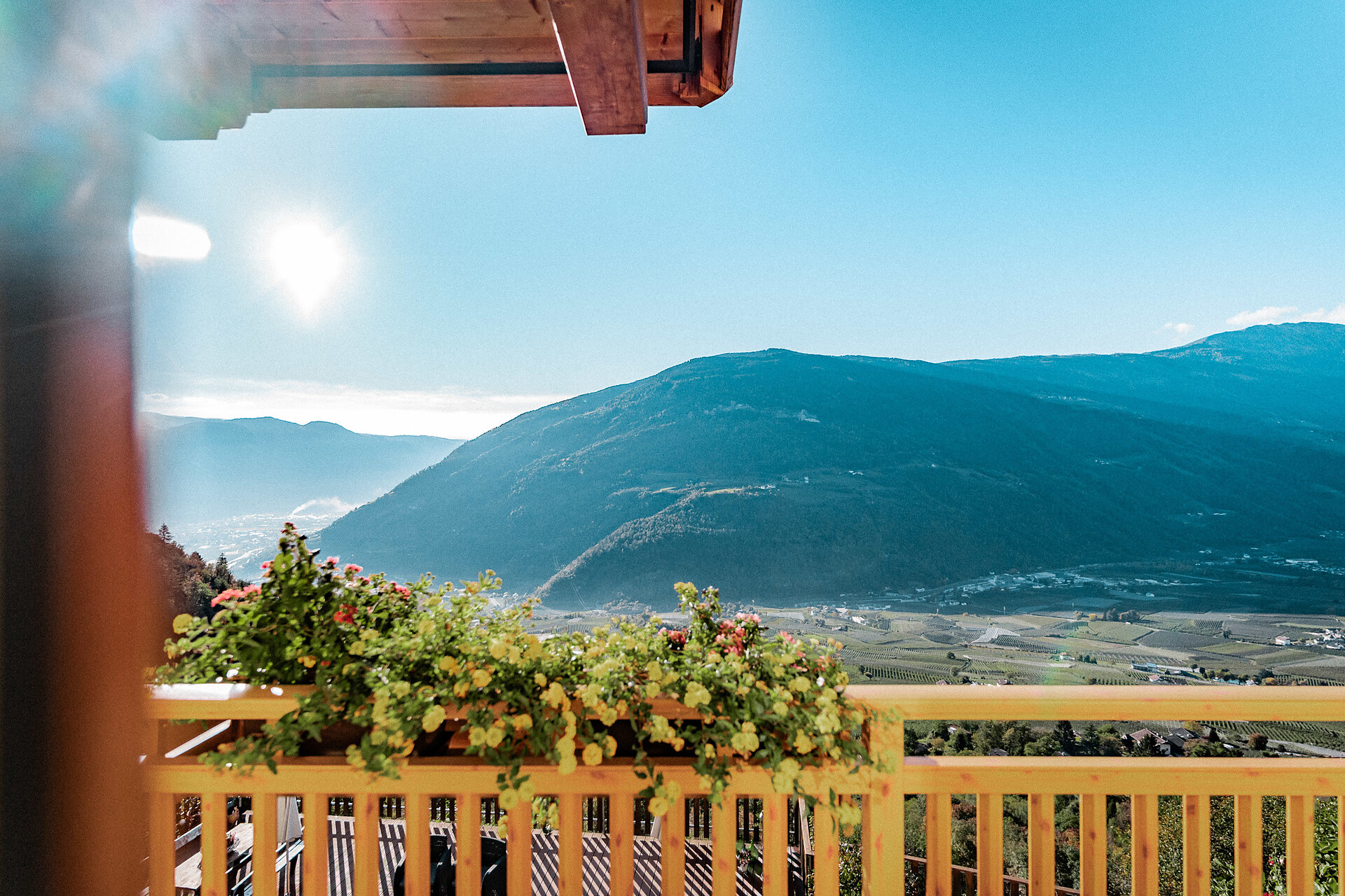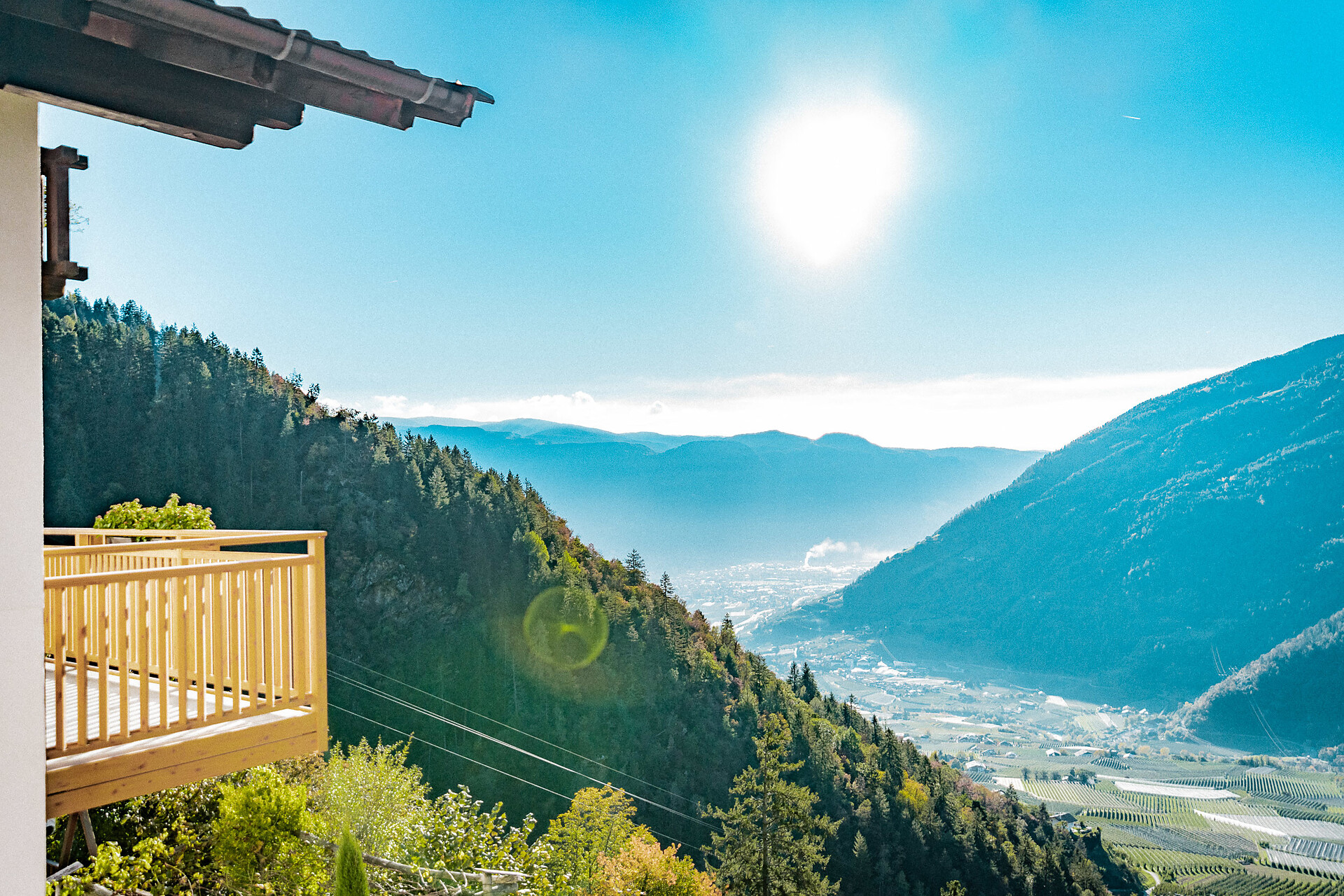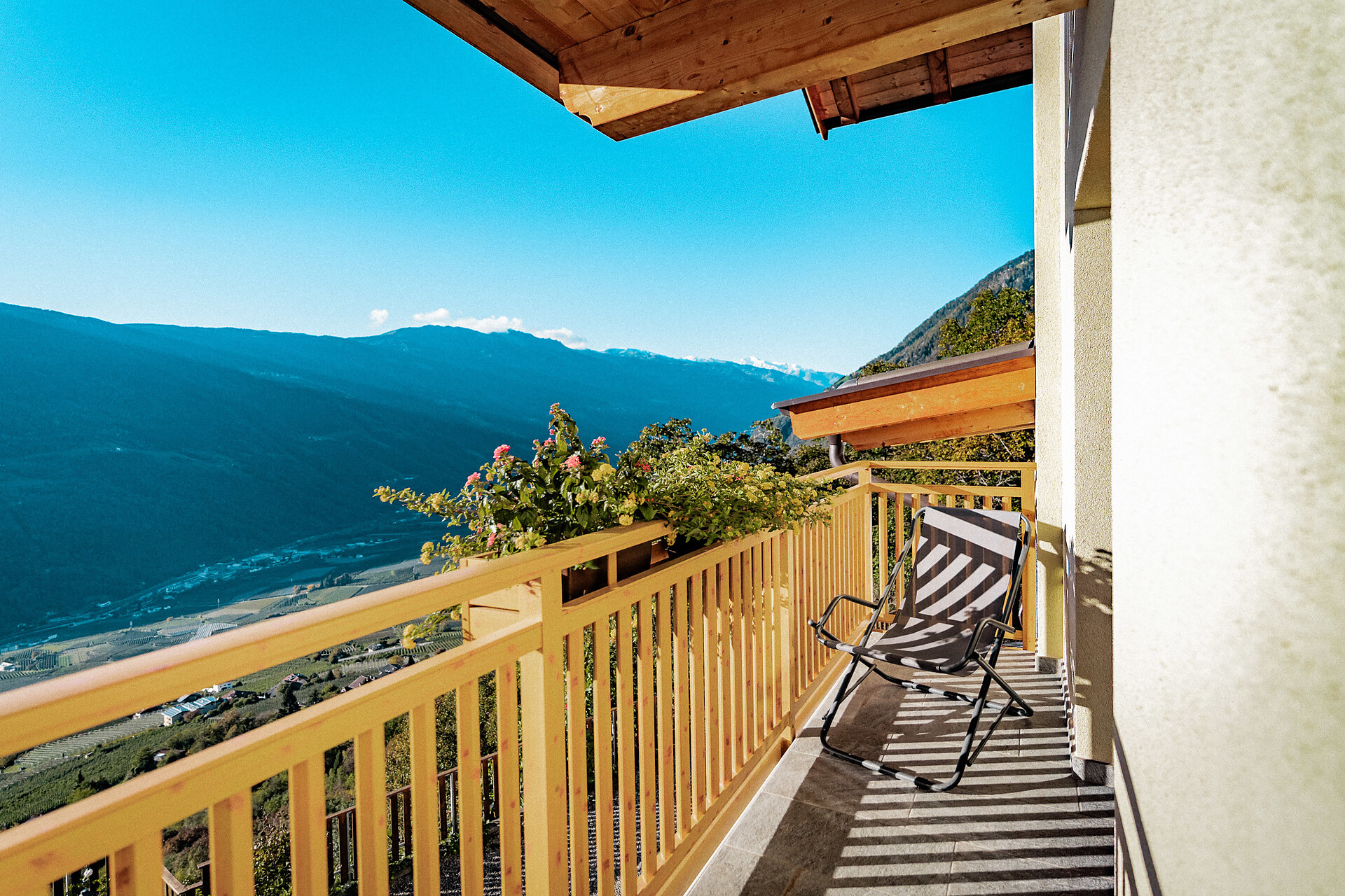 Wohnung 'A2. Obergeschoss – ideal für 2 Personen. Freundlich, geräumig, hell und mit allem eingerichtet, was es für ein paar bequeme Urlaubstage braucht – unser Apartment Kastanie ist mit seinen 54 m² die größte unserer drei Ferienwohnungen. Es liegt im 2. Obergeschoss, wo ihr vom Balkon aus einen großartigen Ausblick bis hinunter nach Meran und hinauf in Richtung Vinschgau habt. E-Ladestation für Elektroautos verfügbar (gegen Gebühr)
