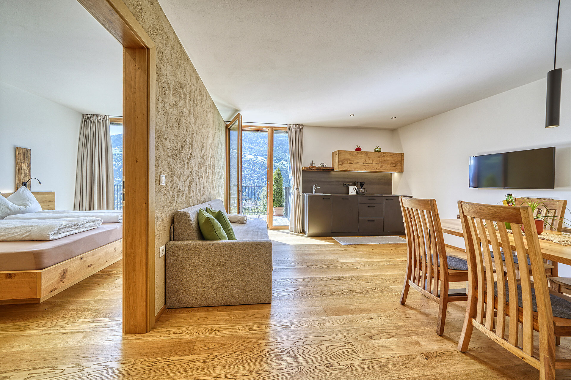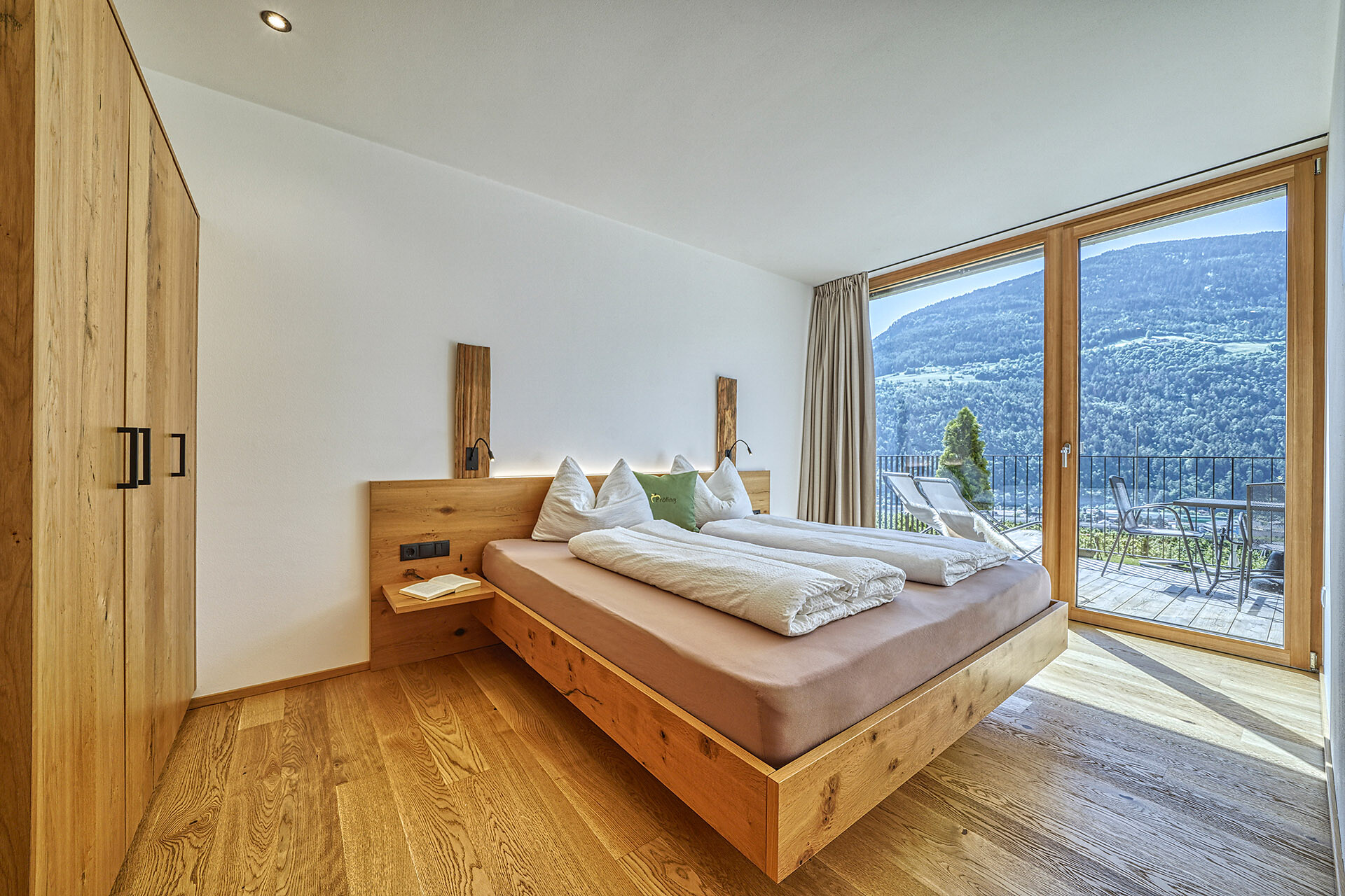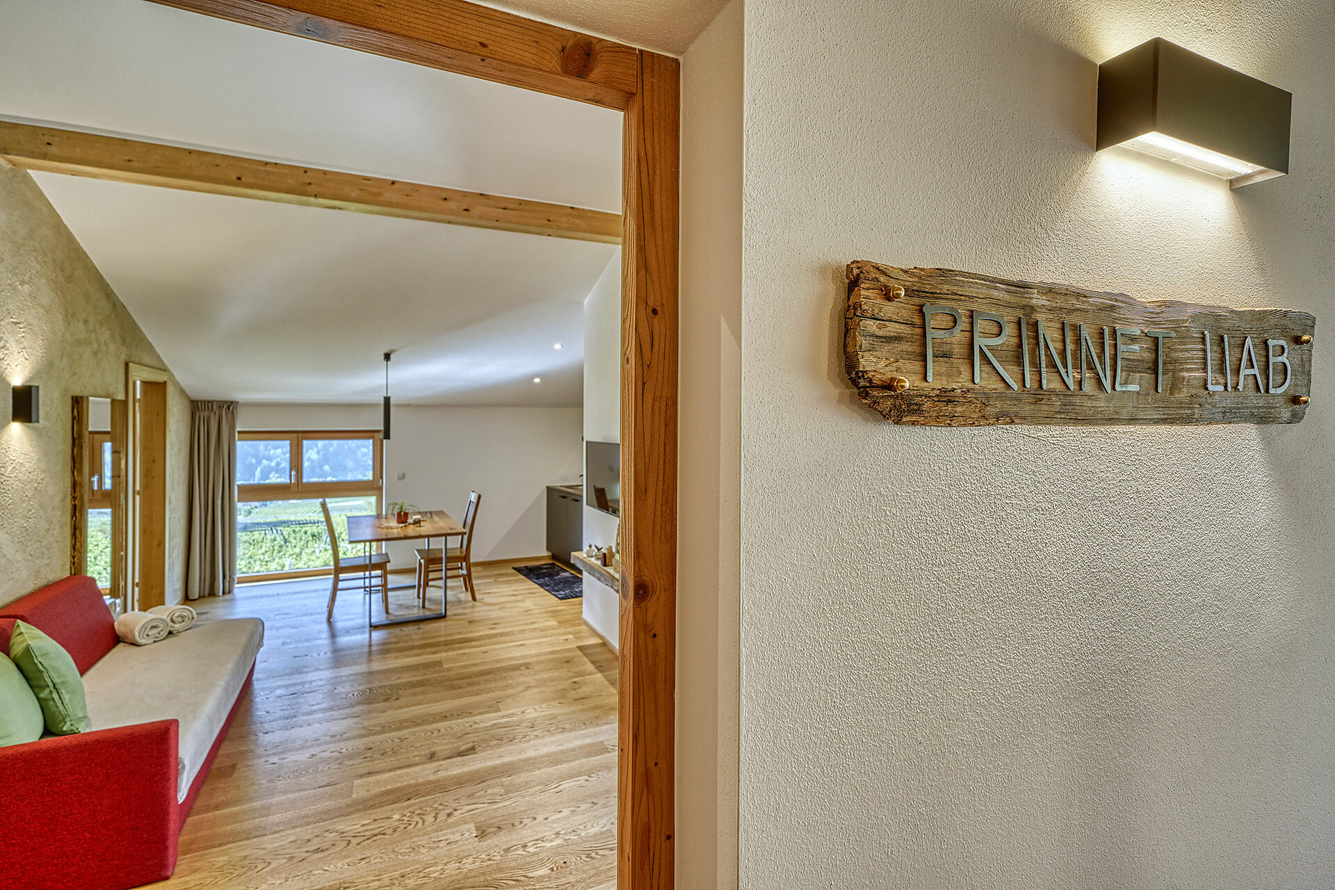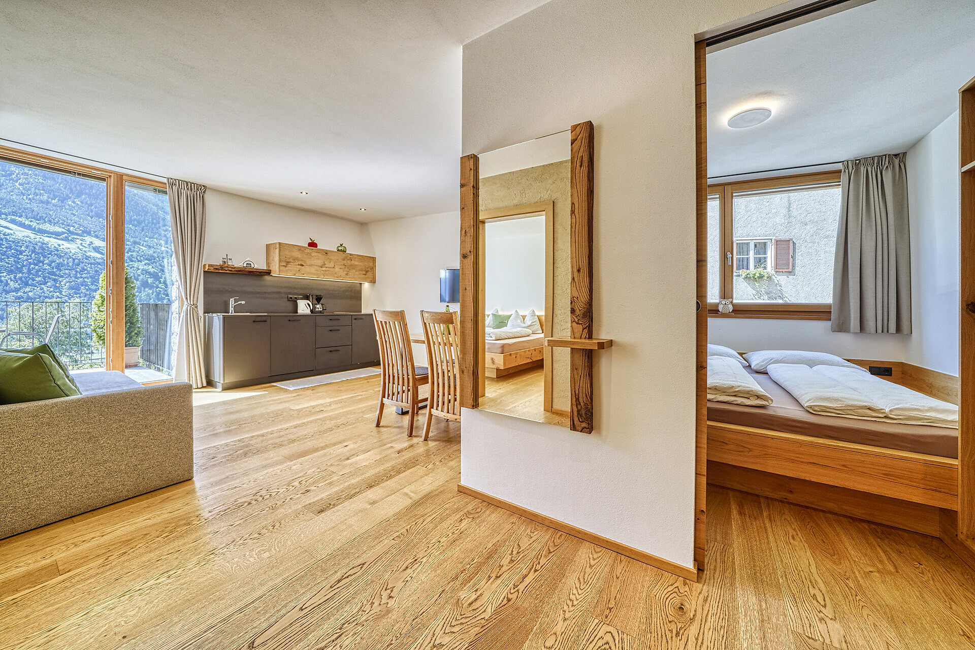 Unser Apartment „Hoawiag“, ist nach einem der bekanntesten Partschinser Flurnamen benannt und bietet Ihnen eine wohlige „Urlaubswiege“ mit 2 getrennte Schlafzimmern mit Doppelbett, einer voll-ausgestatteten Küche und einem lichtdurchfluteten Badezimmer. Direkt vor den großen Fensterflächen der Wohnung zeigt sich die beeindruckende Bergkulisse der Texelgruppe mit sattgrünen Wiesen, weiten Wäldern und hohen Gipfeln von Ihrer schönsten Seite. Die beiden Schlafzimmer und der Wohnraum sind mit behaglichen Holzböden ausgestattet und die gesamte Einrichtung wurde von Tischlerhand liebevoll maßgeschneidert. Die Küche verfügt über einen Kühlschrank inkl. Gefrierfach, Glaskeramikkochfeld, Abzugshaube, Spülmaschine, Kaffeemaschine und Wasserkocher. Ausreichend Kochutensilien und Essgeschirr sind vorhanden. Das helle Bad ist mit großer Regendusche, WC, Waschbecken und Handtuchtrockner ausgestattet. Nach Osten, in Richtung der Kurstadt Meran, verfügt die Wohnung über einen überdachten Balkon aus Zirmholz.