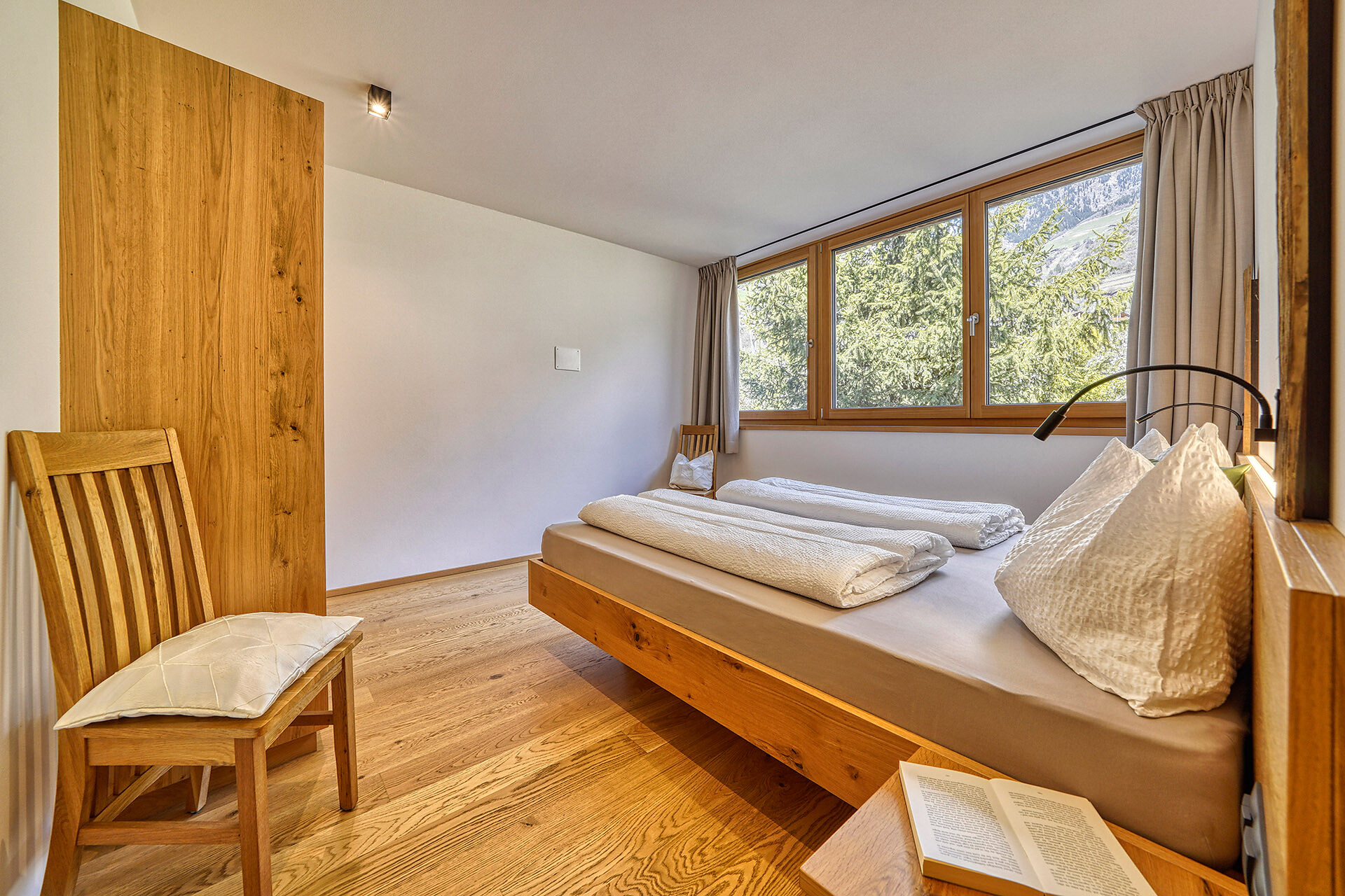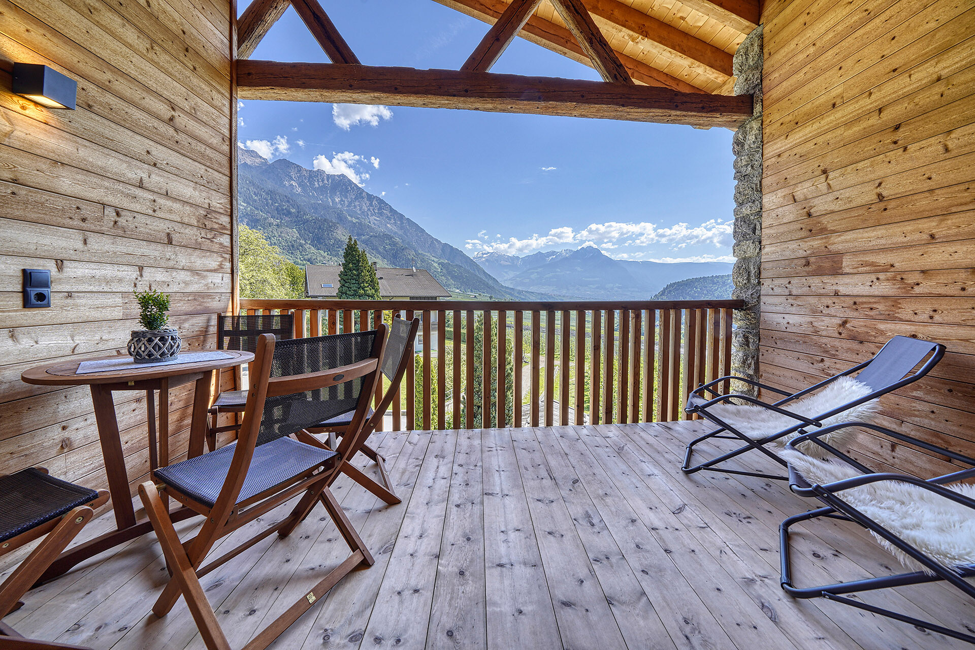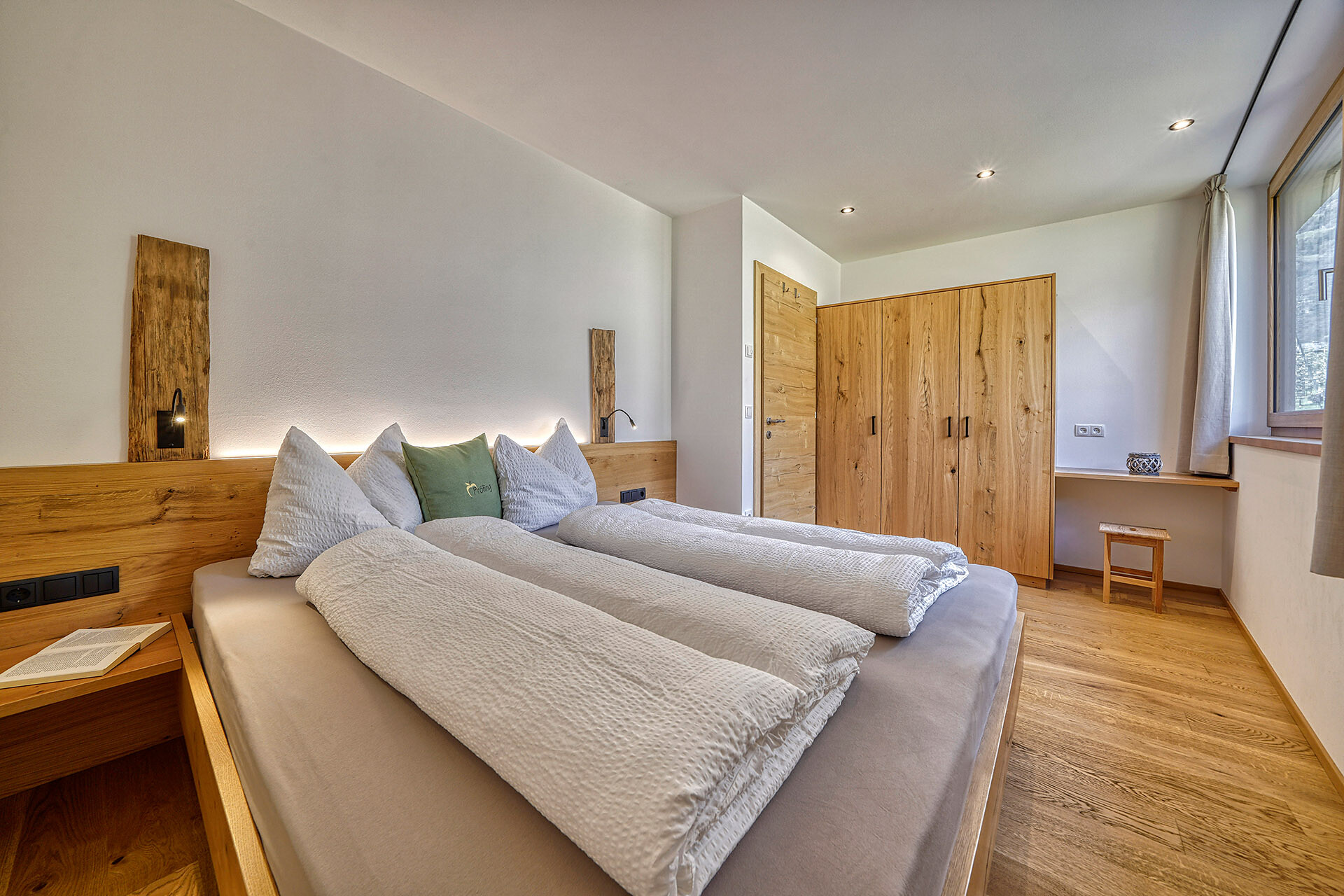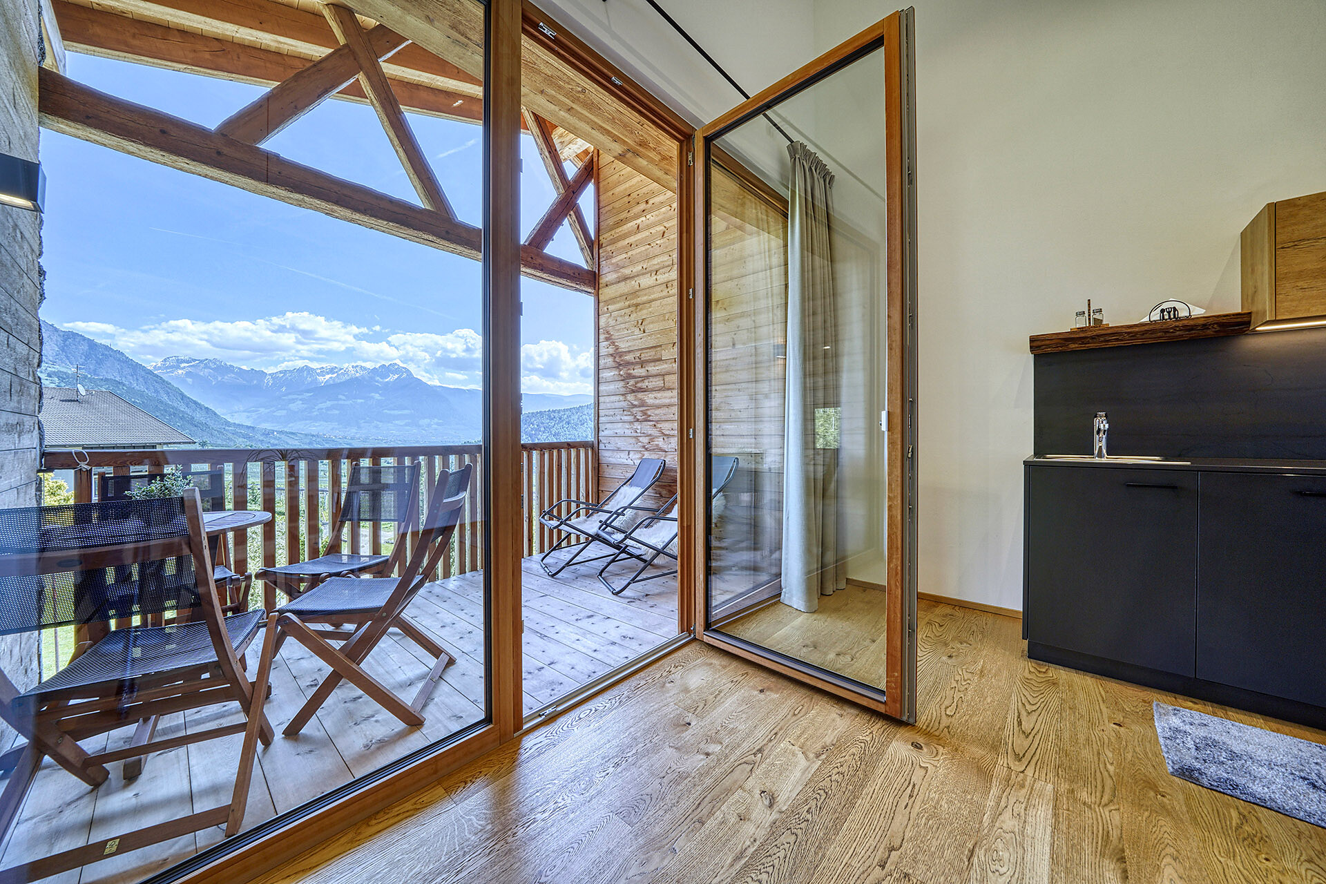 Unser Apartment „Hoawiag“, ist nach einem der bekanntesten Partschinser Flurnamen benannt und bietet Ihnen eine wohlige „Urlaubswiege“ mit 2 getrennte Schlafzimmern mit Doppelbett, einer voll-ausgestatteten Küche und einem lichtdurchfluteten Badezimmer. Direkt vor den großen Fensterflächen der Wohnung zeigt sich die beeindruckende Bergkulisse der Texelgruppe mit sattgrünen Wiesen, weiten Wäldern und hohen Gipfeln von Ihrer schönsten Seite. Die beiden Schlafzimmer und der Wohnraum sind mit behaglichen Holzböden ausgestattet und die gesamte Einrichtung wurde von Tischlerhand liebevoll maßgeschneidert. Die Küche verfügt über einen Kühlschrank inkl. Gefrierfach, Glaskeramikkochfeld, Abzugshaube, Spülmaschine, Kaffeemaschine und Wasserkocher. Ausreichend Kochutensilien und Essgeschirr sind vorhanden. Das helle Bad ist mit großer Regendusche, WC, Waschbecken und Handtuchtrockner ausgestattet. Nach Osten, in Richtung der Kurstadt Meran, verfügt die Wohnung über einen überdachten Balkon aus Zirmholz.