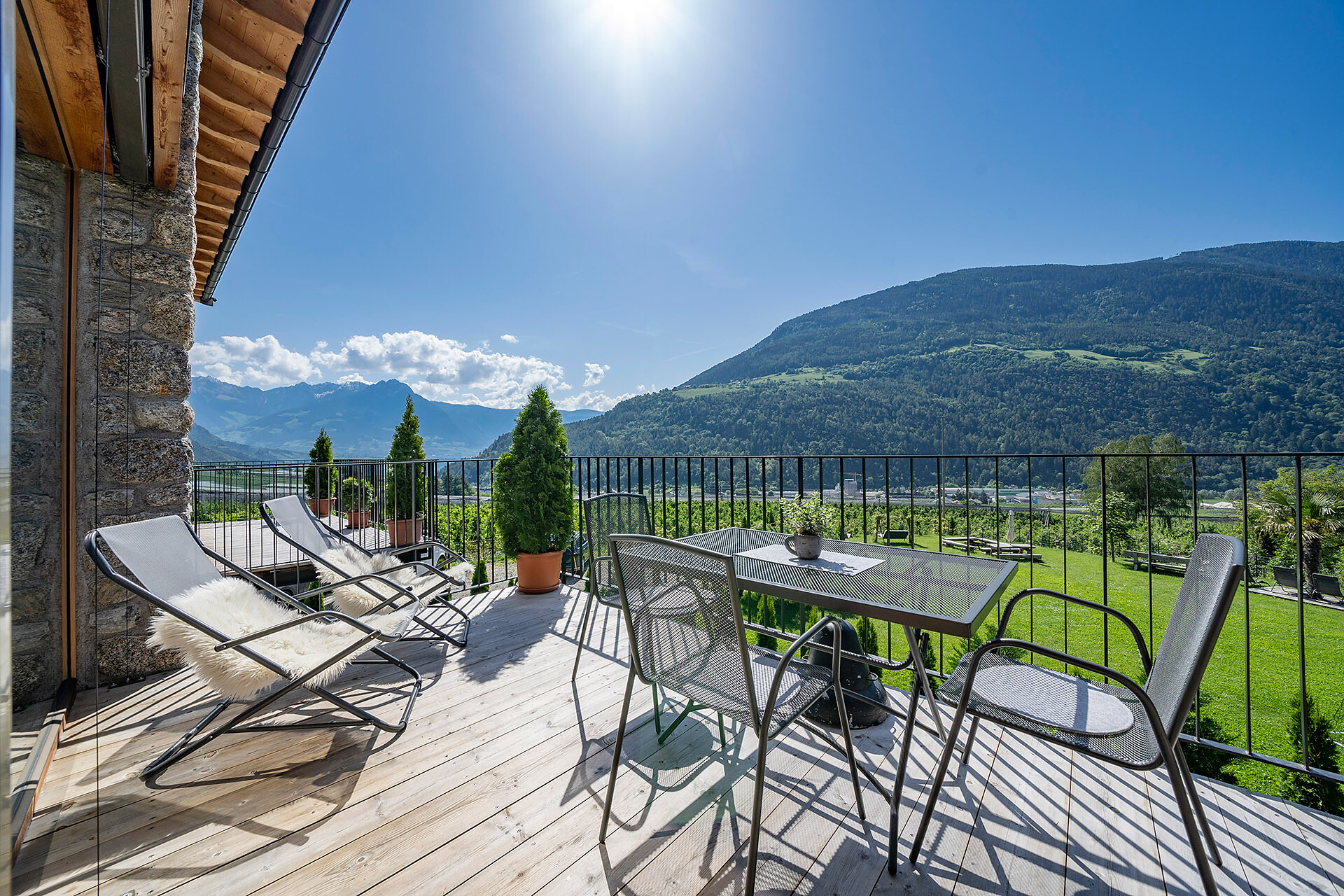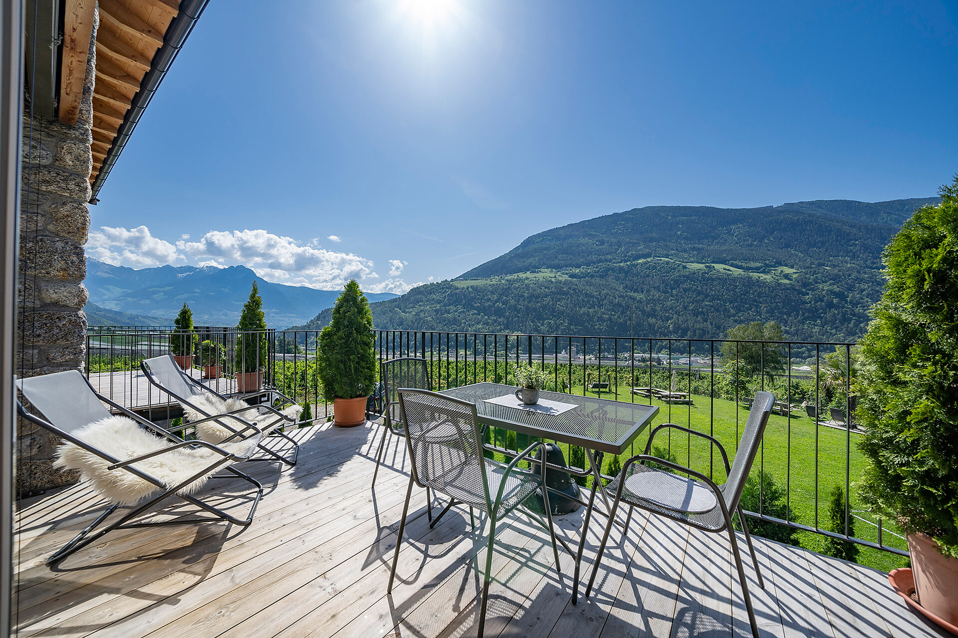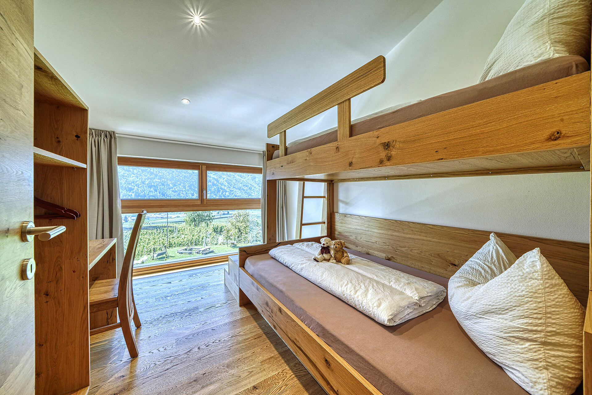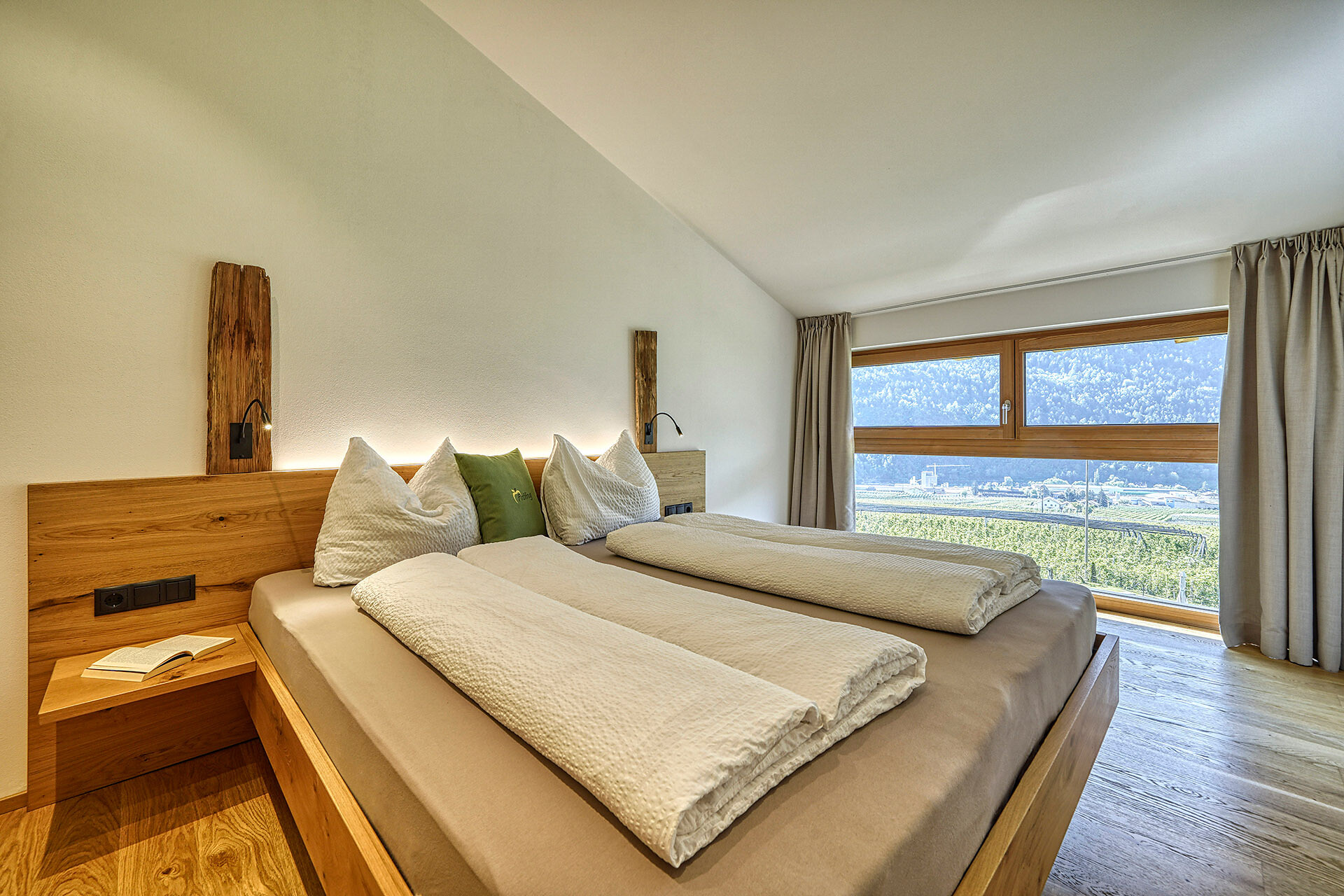 Unser Apartment „Hoawiag“, ist nach einem der bekanntesten Partschinser Flurnamen benannt und bietet Ihnen eine wohlige „Urlaubswiege“ mit 2 getrennte Schlafzimmern mit Doppelbett, einer voll-ausgestatteten Küche und einem lichtdurchfluteten Badezimmer. Direkt vor den großen Fensterflächen der Wohnung zeigt sich die beeindruckende Bergkulisse der Texelgruppe mit sattgrünen Wiesen, weiten Wäldern und hohen Gipfeln von Ihrer schönsten Seite. Die beiden Schlafzimmer und der Wohnraum sind mit behaglichen Holzböden ausgestattet und die gesamte Einrichtung wurde von Tischlerhand liebevoll maßgeschneidert. Die Küche verfügt über einen Kühlschrank inkl. Gefrierfach, Glaskeramikkochfeld, Abzugshaube, Spülmaschine, Kaffeemaschine und Wasserkocher. Ausreichend Kochutensilien und Essgeschirr sind vorhanden. Das helle Bad ist mit großer Regendusche, WC, Waschbecken und Handtuchtrockner ausgestattet. Nach Osten, in Richtung der Kurstadt Meran, verfügt die Wohnung über einen überdachten Balkon aus Zirmholz.