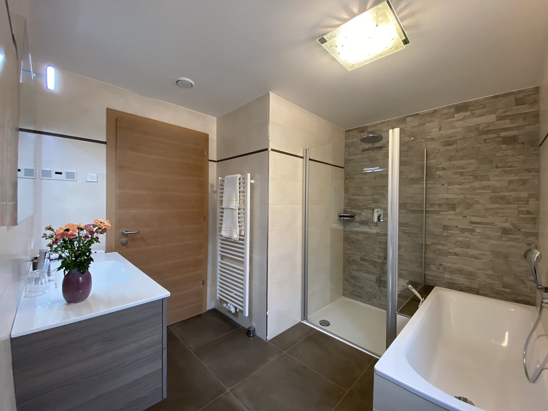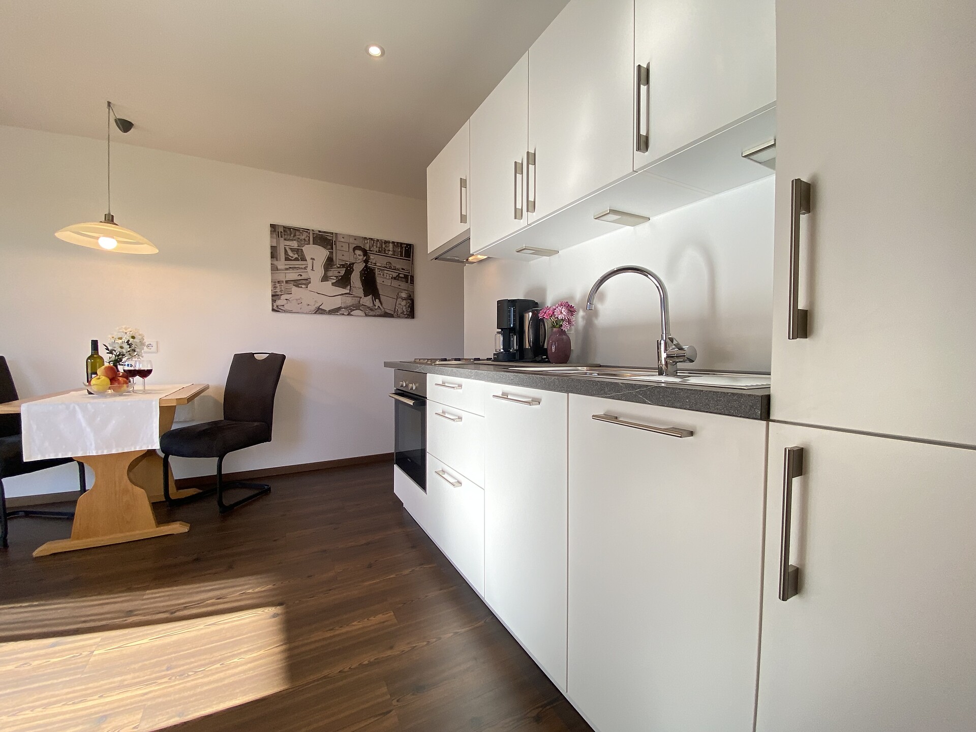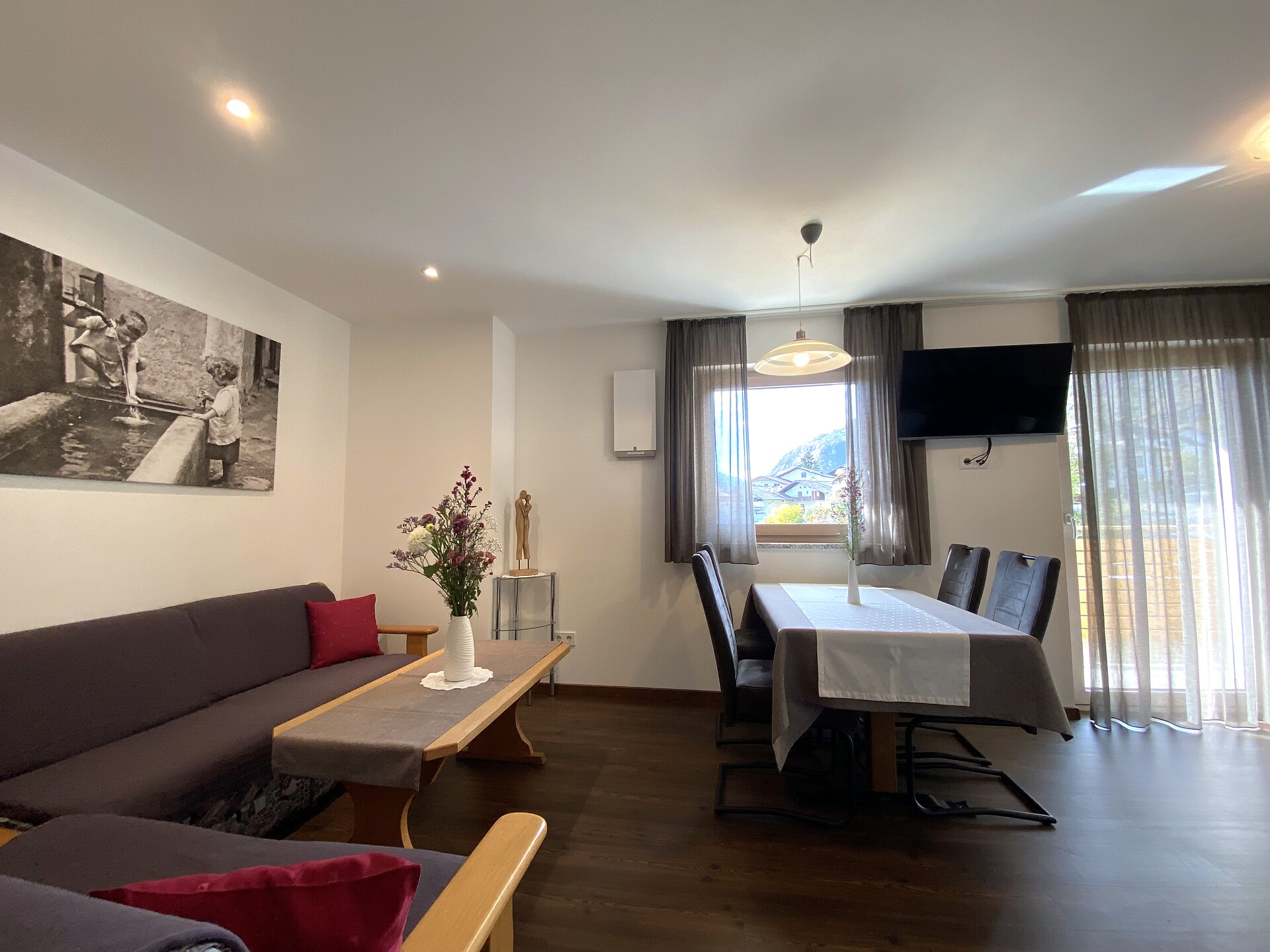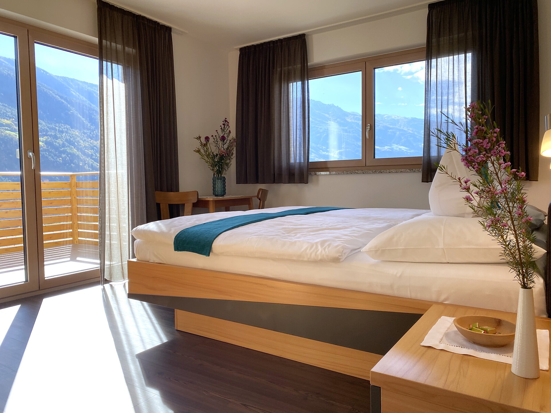 Sonnendurchflutetes Dreiraumappartement mit zwei Doppelzimmern und mit jeweils separaten modernen Bädern. Lichtdurchfluteter bequemer Wohnraum, komplett eingerichtete Küche, rundum großer Süd- und Westbalkon mit Mobiliar und atemberaubendem freien Panoramablick, Safe, TV und WLAN