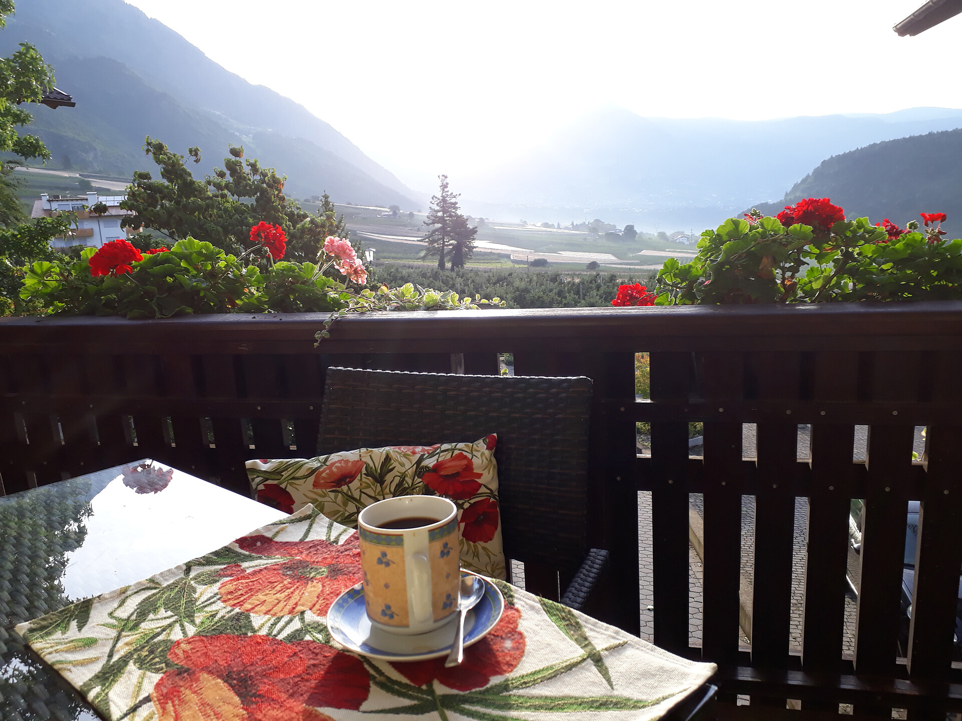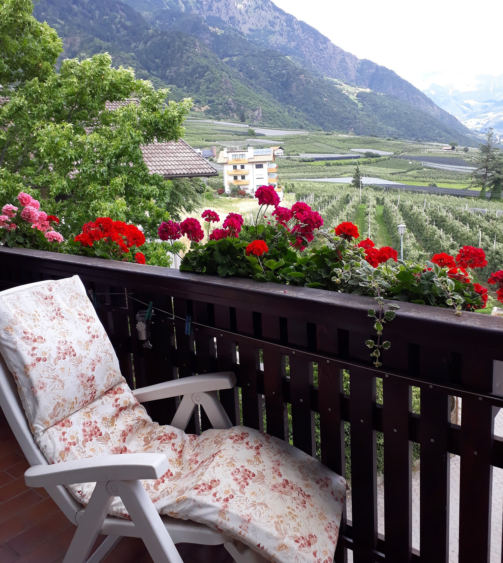 Unsere geschmackvoll eingerichtete, großzügige Ferienwohnung mit ca. 70 m2 erstreckt sich über die gesamte 1. Etage und bietet Ihnen 2 schöne, ineinander übergehende Schlafzimmer (getrennt durch Verbindungstür) mit 2 Bädern, davon 1 mit großem Bad ensuite (Dusche und Wanne separat) sowie ein kleines mit Dusche/WC (neben dem Wohnzimmer)- beide mit Fenster Für die 5.Person steht ein separates kleines Wohnzimmer mit Ausziehcouch (1,60x1,90m), sowie Verbindungstür zum 2. Doppelzimmer und mit Balkon zur Verfügung. Vom Vorraum der Wohnung mit Garderobe (Schrank und Schuhkästchen) gelangen Sie ins hübsche Wohn/Esszimmer und die Küche. Die neue hübsche Hochglanz-Küche ist voll ausgestattet u.a. mit Elektroherd/Backrohr, großem Kühlschrank mit Gefrierfächern, Geschirrspüler, Kaffee- und Tchibo-Espressomaschine, Toaster, Mikrowelle, Wasserkocher. Ringsum gibt es Balkone mit Panoramablick entweder in Richtung Meraner Land und dessen Berge oder in Richtung Vinschgau und Texelgruppe. "Gretl" - genau die richtige Adresse für Ihren entspannten Wohlfühlurlaub Aus hygienisch