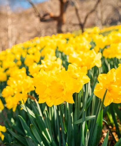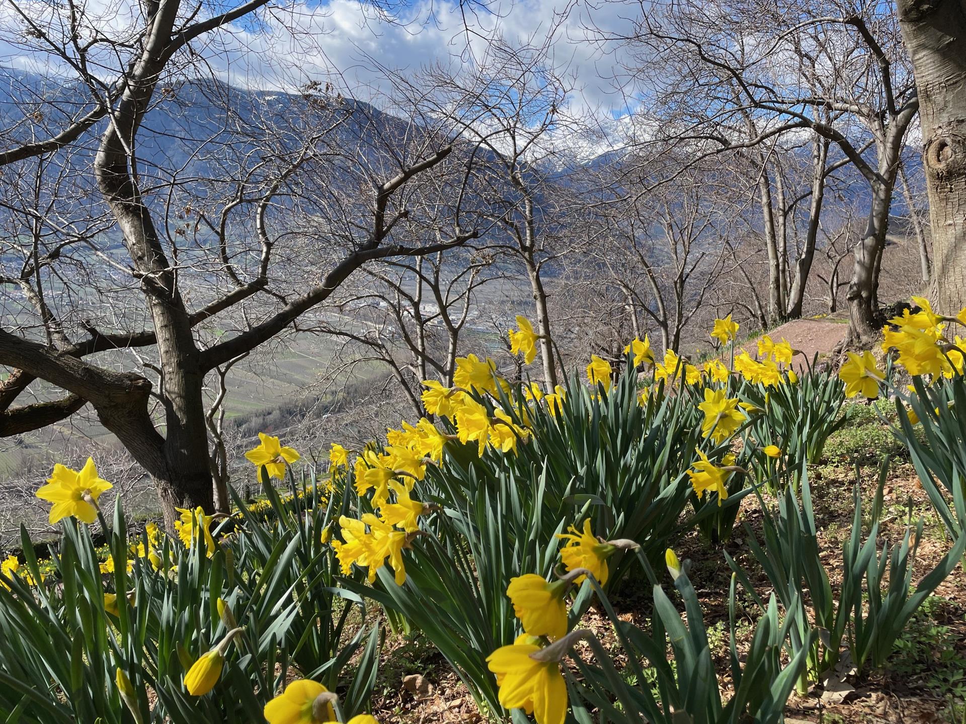 Zig Blumenzwiebeln schlummern unter einer gefrorenen Erdschicht in feuchter Erde. Das kräftige Wurzelwerk der Edelkastanien wacht im Winter schützend über sie – bis sie von ersten frühlingswarmen Sonnenstrahlen behutsam ans Licht gelockt werden. Zartgrün schieben sich Spitzchen aus bräunlichem Boden, länglich saftige Blätter bahnen sich ihren Weg an die noch kühle Luft und schützen die Narzisse, eine sonnengelbe Blume mit goldener Trompete und hellen Blütenblättern, die als Erste den Frühlingsbeginn verkündet. Vieles wird der Narzisse zugeschrieben: Sie symbolisiert Wiedergeburt und Erneuerung, steht für Zuversicht und Hoffnung, gilt als Blume des Selbstbewusstseins und der Eitelkeit. Ihre tragische Geschichte reicht bis in die griechische Mythologie zurück und wurde später vom römischen Dichter Ovid in den Metamorphosen erzählt: Narziss, ein Jüngling von außergewöhnlicher Schönheit, Sohn der Nymphe Liriope und des Flussgottes Kephissos, verliebt sich in sein eigenes Spiegelbild und ertrinkt darin. Als die Nymphen herbeieilen, um ihn zu retten, finden sie an seiner Statt eine Blume vor: in der Mitte leuchtend gelb, eingefasst von weißen Blütenblättern.