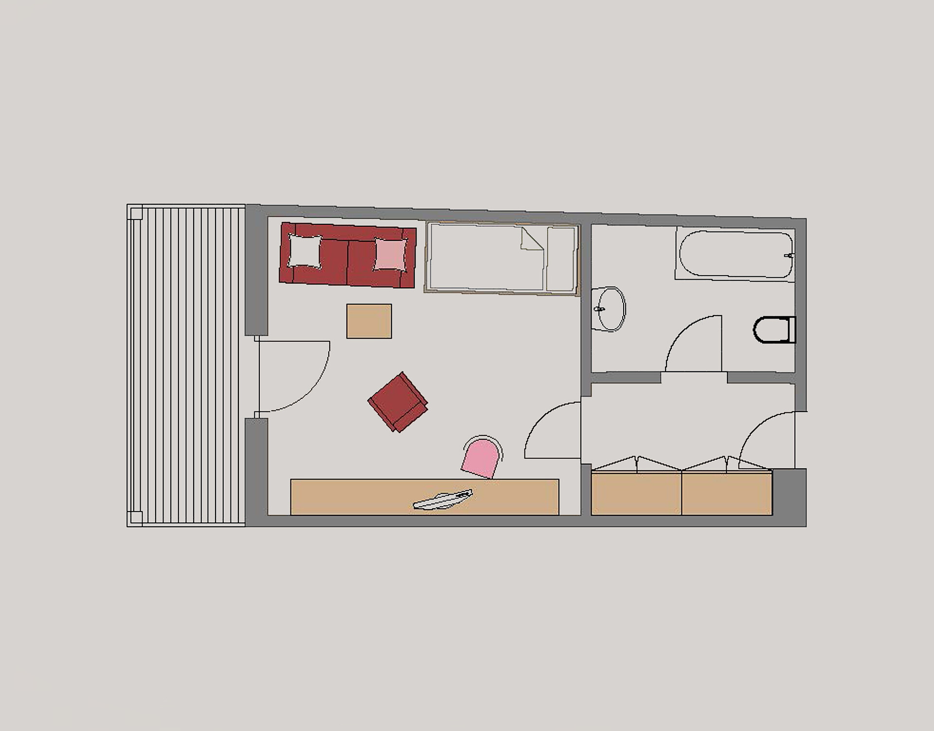 Modern und zugleich wohnlich präsentiert sich dieses Doppelzimmer im Haus Christine. Handgehobeltes Birnenholz, Sitzmöbel im Retrostil und Accessoires aus heimischem Filz schaffen ein authentisches, alpines Wohngefühl. Durch das Panoramafenster und die großzügige Loggia öffnet sich der Blick über das Meraner Land. Die innovativen Klima-Zimmerdecken fügen sich unauffällig in das Raumkonzept ein und sorgen das ganze Jahr über für ein angenehm ausgeglichenes Wohngefühl.