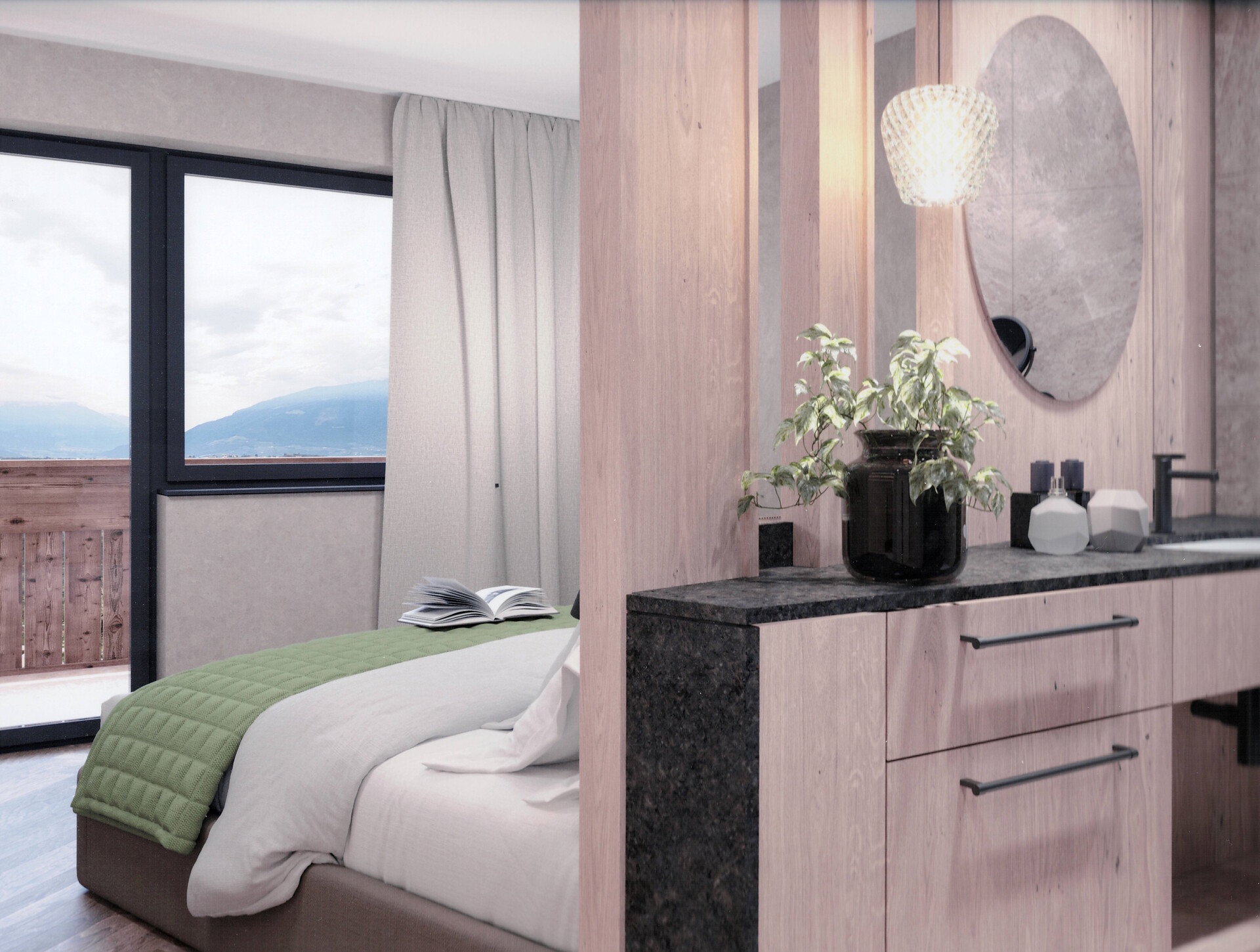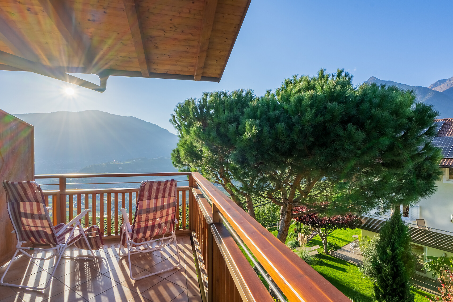 Appartement Loggia 42 qm, im Hochparterre gelegen, hochwertig ausgestattet mit 7qm Südwestbalkon zur Sonnenseite mit herrlichem Panoramablick auf´s Meranerland (Talseite).
