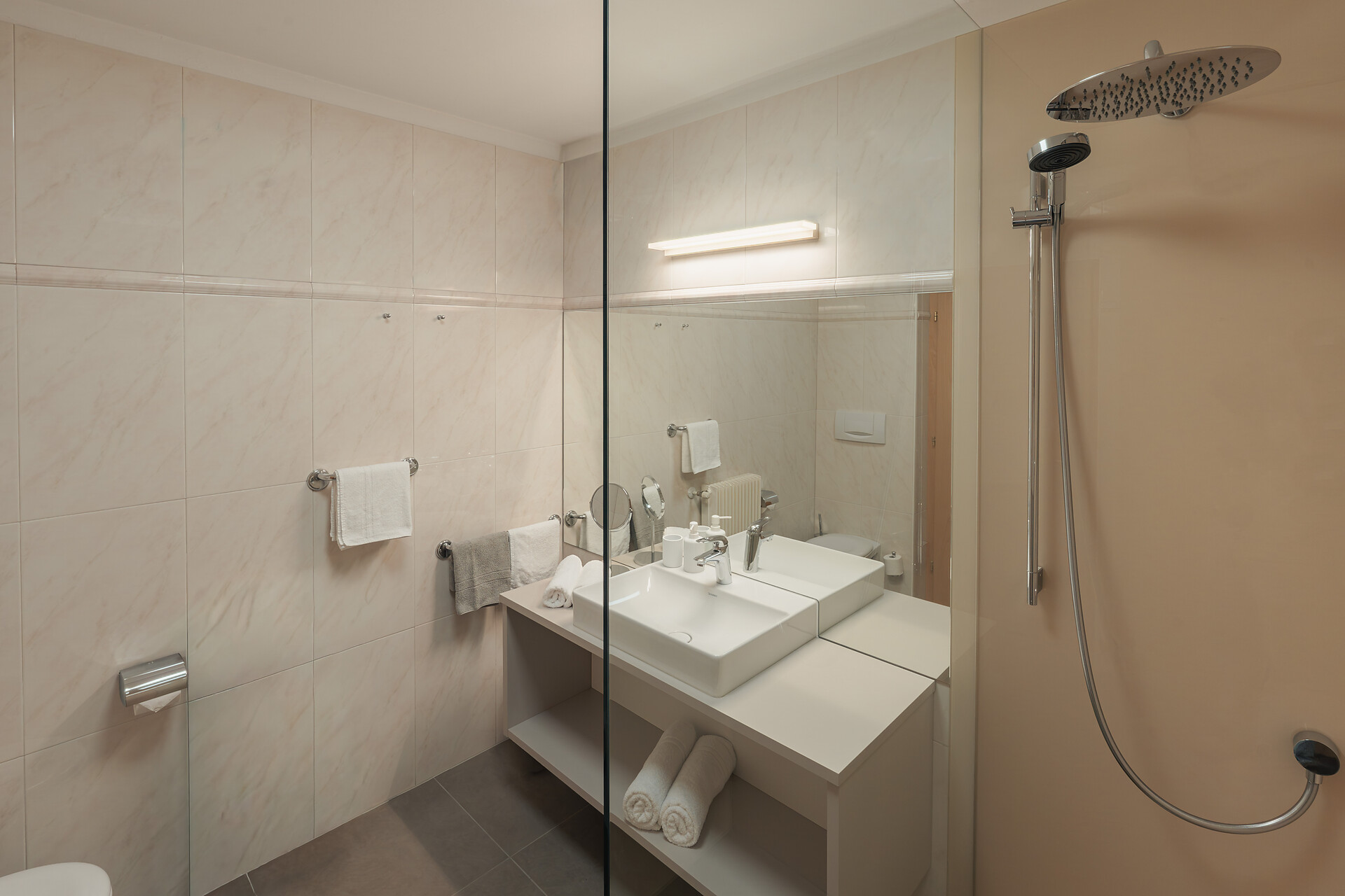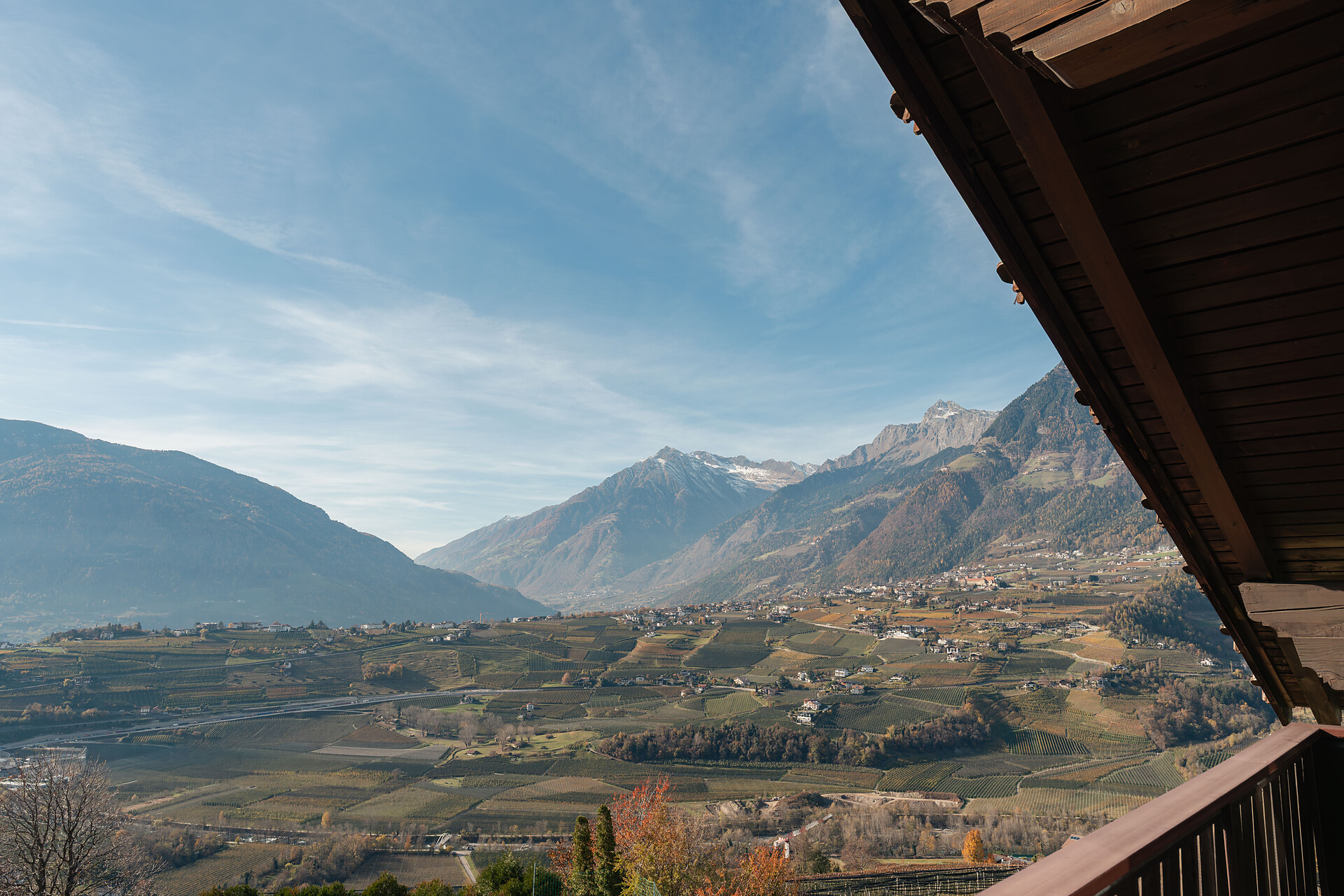 Geräumiges Badezimmer mit Dusche oder Badwanne, Fön und WC getrennt. Großer Balkon oder Terrasse (10-18m²) zur Südwestseite mit Blick auf Meran und die umliegende Bergwelt.