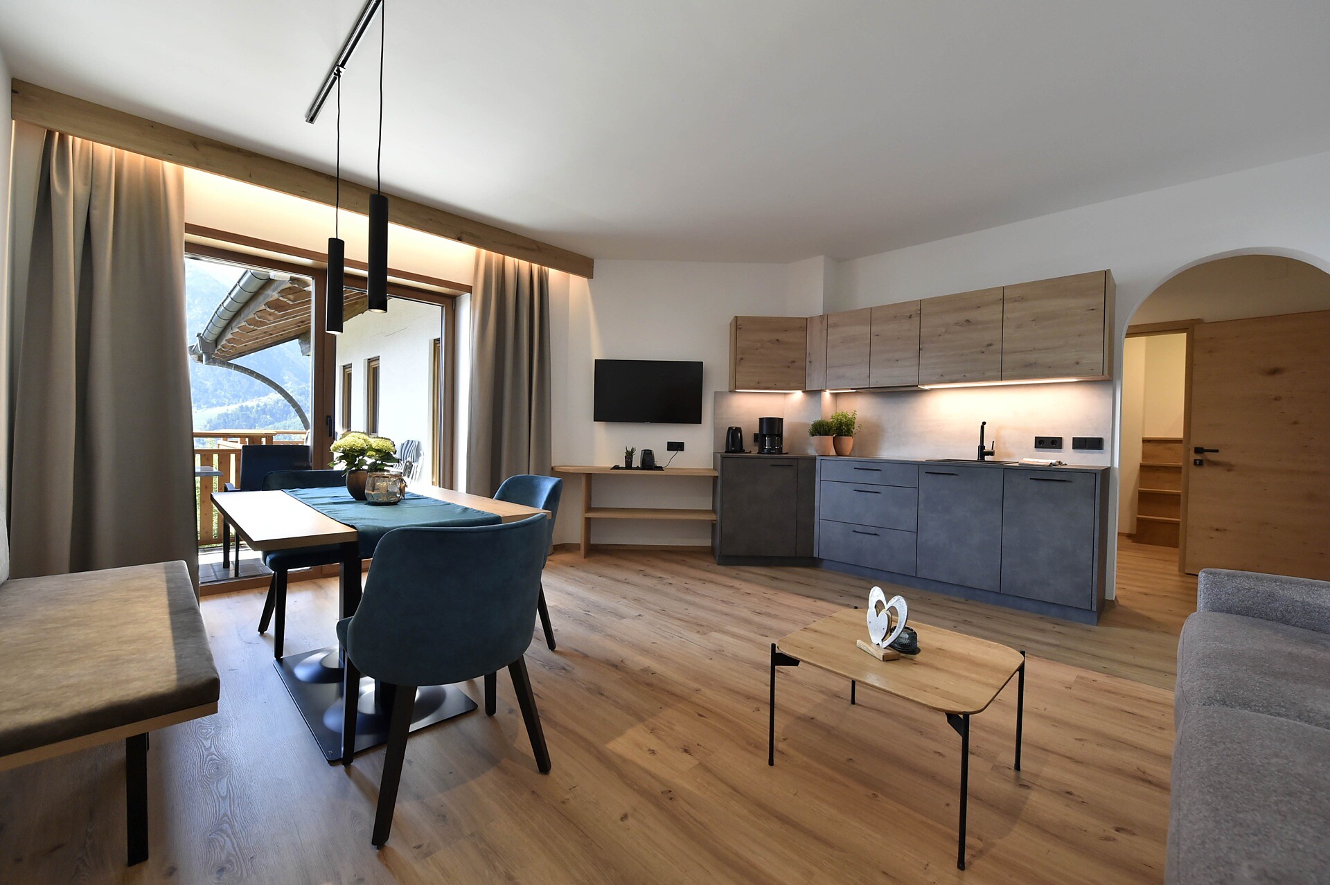 Doppelbett, Etagenbett, Doppelschlafcouch, Balkon, Garten, Barrierefrei, Separater Wohnraum, Bettwäsche vorhanden, Safe, Nichtraucher-Apartment, Wohnküche, Kaffeemaschine, Geschirrspülmaschine, Elektroherd, Mikrowelle, Geschirrausstattung, Wasserkocher, Dusche/Bad, Haarfön, Bademantel, Badetücher, TV, Satellit/Kabel, WLAN, Reinigung auf Anfrage, Haupthaus, Panoramablick, Südseite