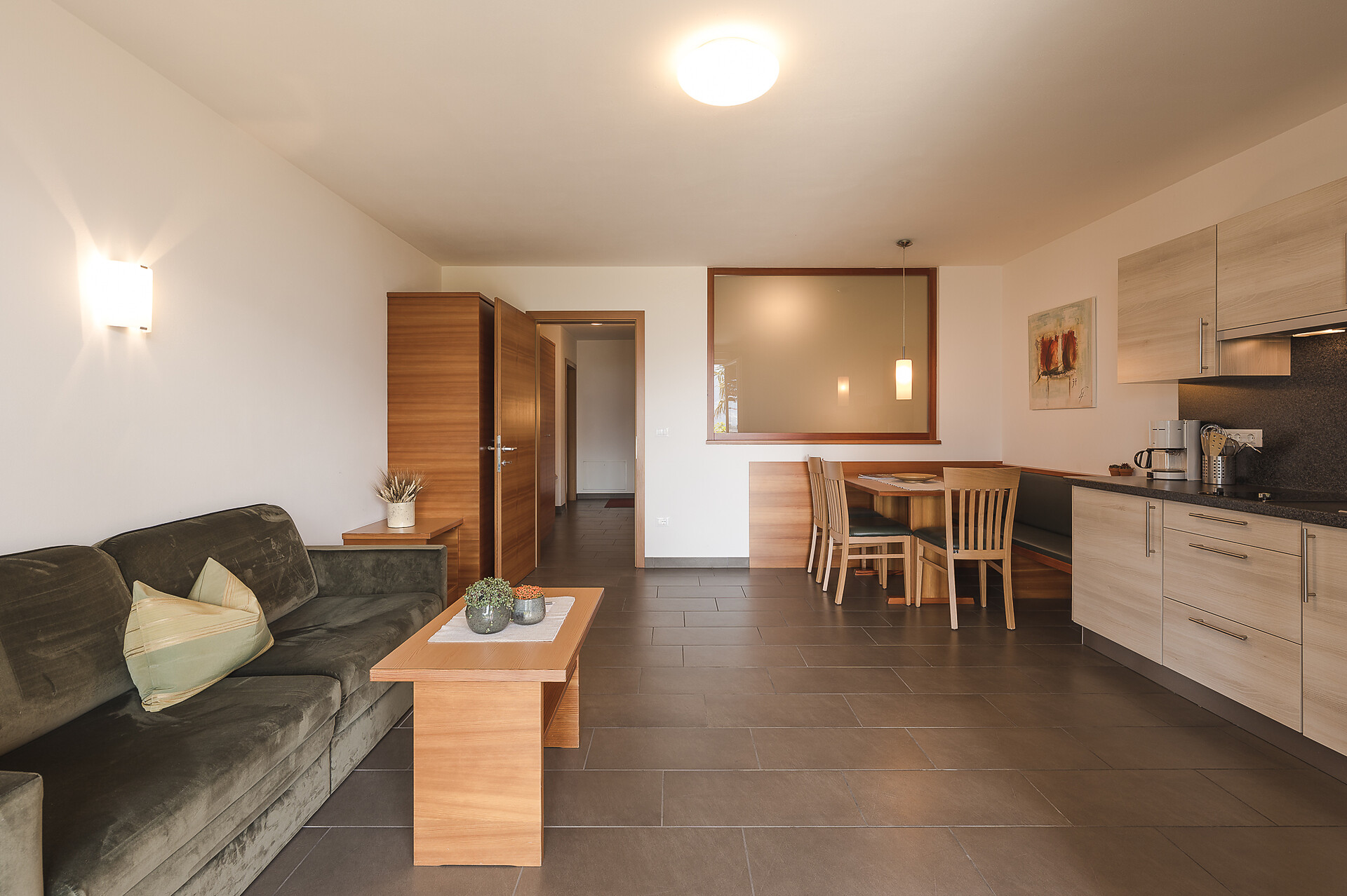 Wir bieten Ihnen Appartements mit einem oder zwei separaten Schlafzimmern, gemütlichen Wohnraum mit Essecke und ausziehbarer Couch, SAT-TV, Safe, Telefon und Garderobe. Die Küchen sind komplett eingerichtet und alle mit einer Spülmaschine ausgestattet. Von den großen Balkonen oder Terrassen mit Garten, alle zur Südwestseite gelegen, erleben Sie einen einmaligen Ausblick über Meran, Dorf Tirol und das Etschtal.
