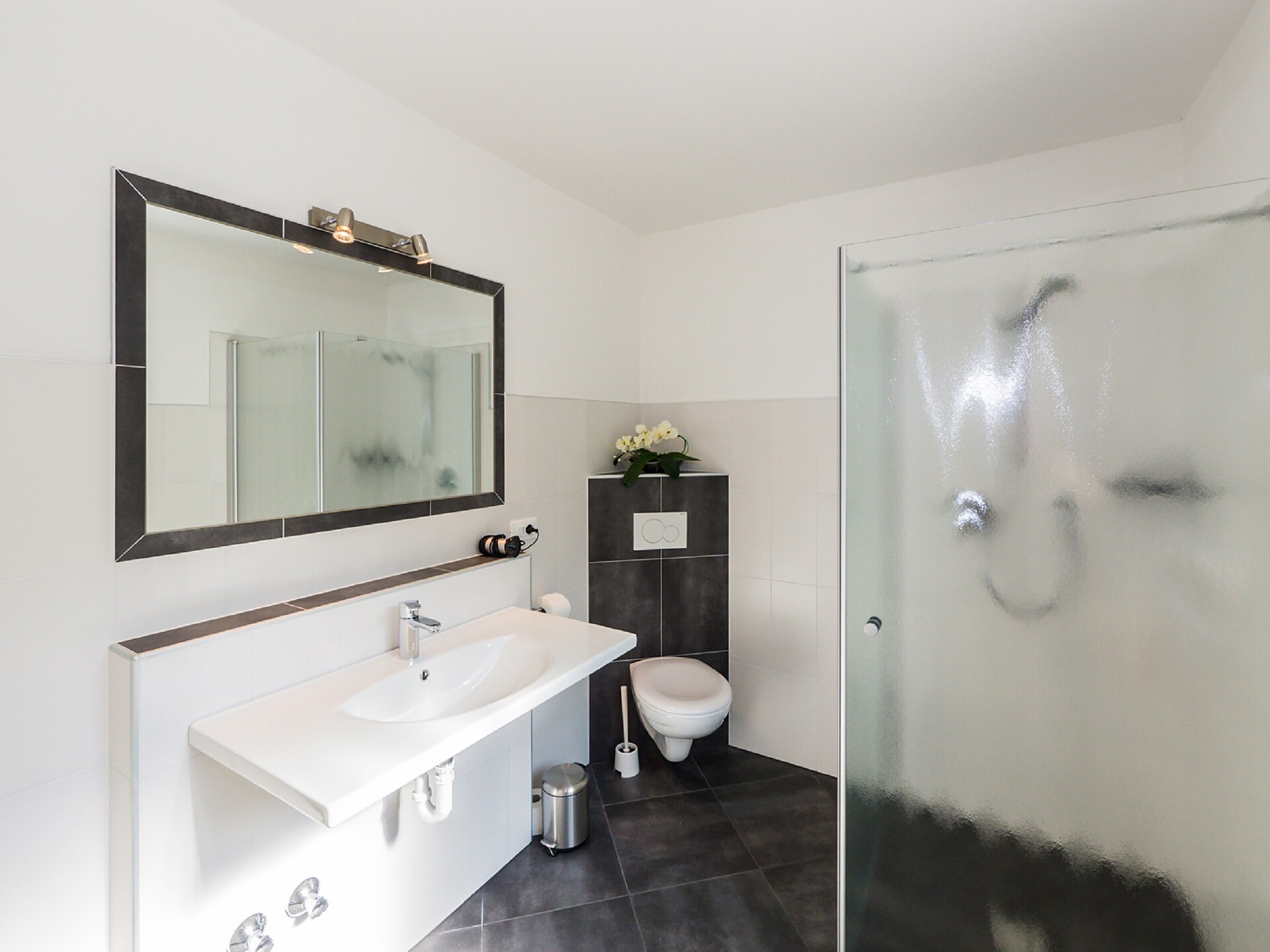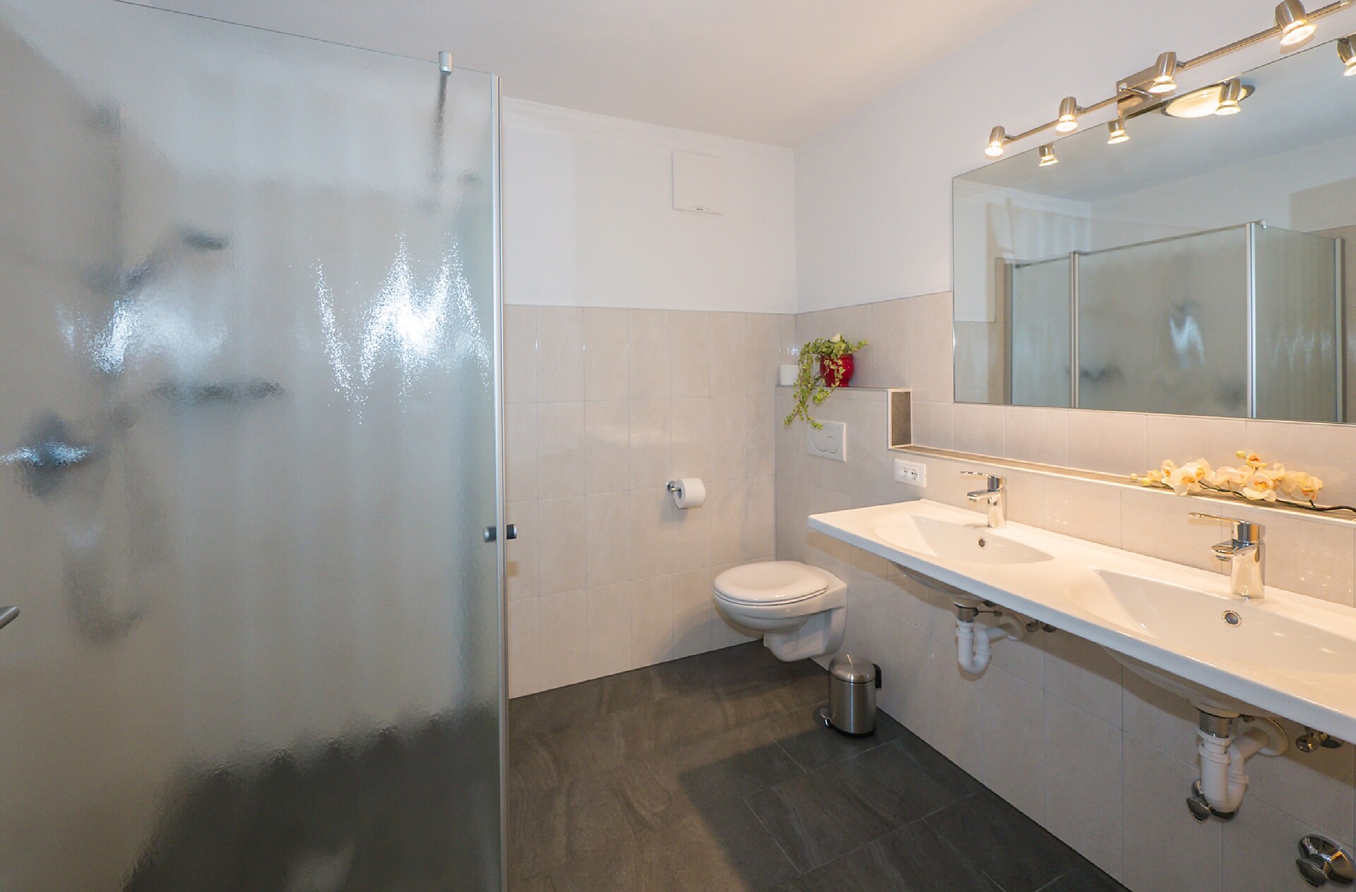 Das Badezimmer ist mit Fußbodenheizung, Doppelwaschbecken, Dusche/WC,