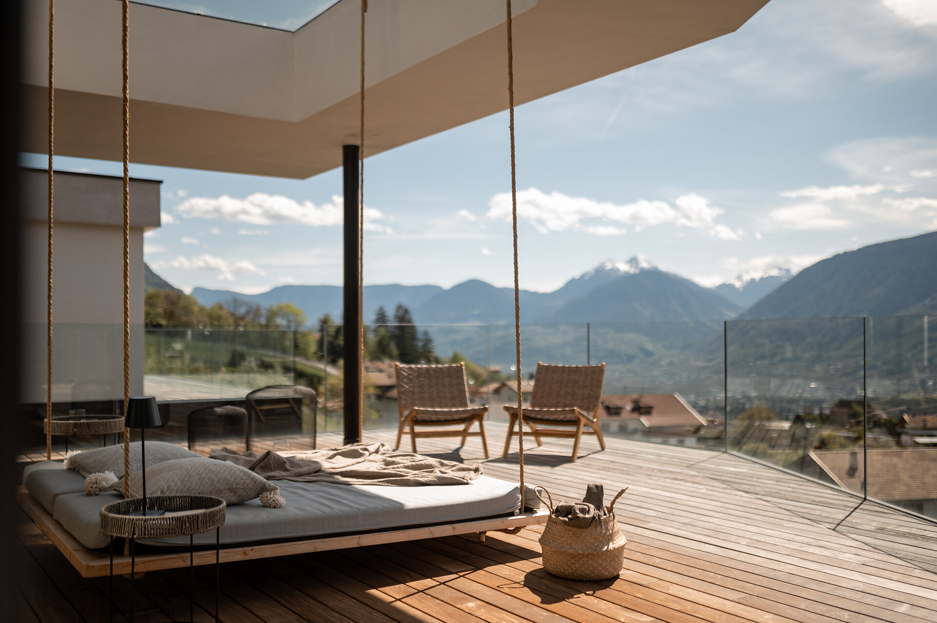 Die View-Houses verzaubern mit Ihrer exklusiven Lage und dem einmaligen Rundumblick auf das umliegende Bergpanorama und den Meraner Talkessel. Die großen Fensterflächen, die eleganten Sonnenterrassen mit Glasbrüstung und das moderne Desgin machen das Chalet Goyen & die Villa Goyen zu einem exklusiven Urlaubsdomizil, das höchste Ansprüche an Behaglichkeit, Komfort und Lage erfüllt.