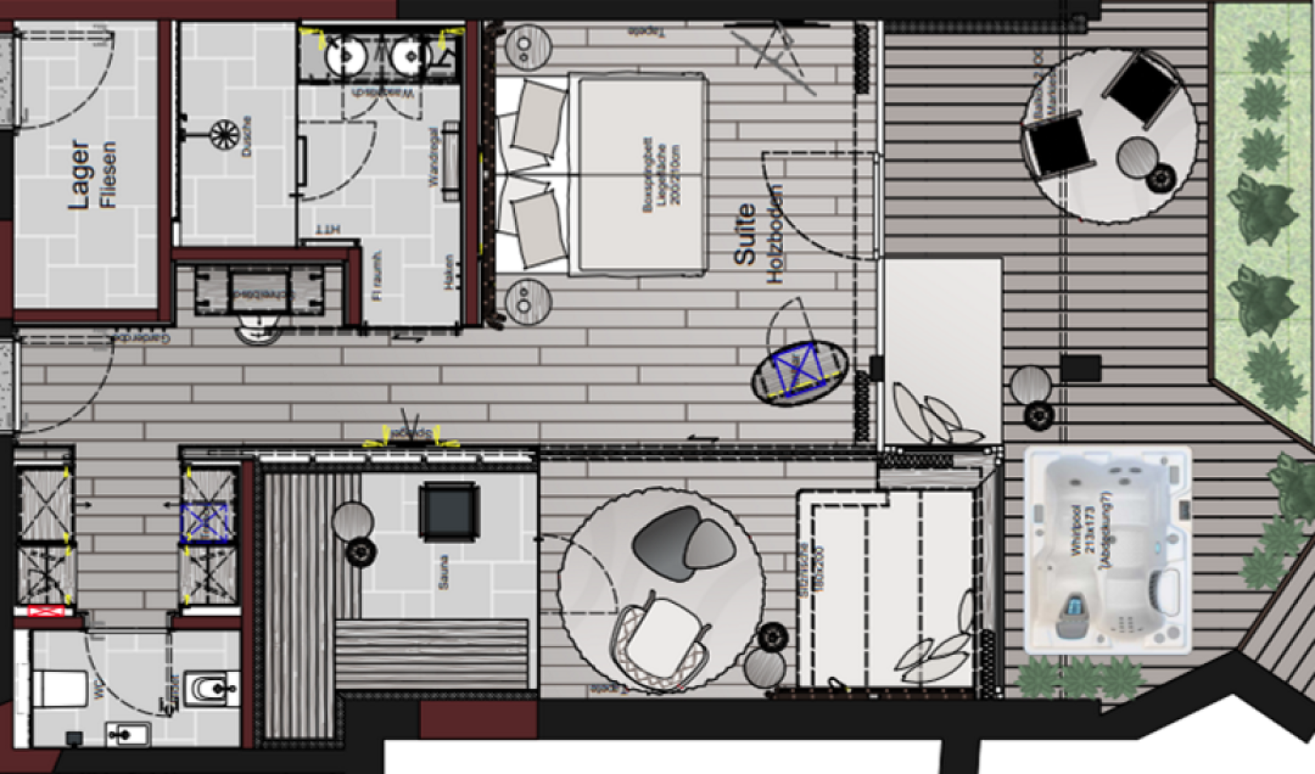 Suite "Sonnentraum Wellness & Spa" (ca. 36m²), nichtraucher, im alpinen Style eingerichtet, mit elegantem Altholz, Schlaf-Wohnraum, große Fensterfront zur Südseite, mit traumhaftem Ausblick, klimatisiert, Physiotherm Infrarotkabine, Bad, Dusche, Badewanne, getrenntes WC & Bidet, Kosmetikspiegel, Haarfoen, Flachbild-SAT-TV, Frigobar, WLAN, Tel, Safe, Südbalkon mit Sitzgarnitur, Dachgarten mit Liegen, Finnische Panoramasauna und exklusivem Whirlpool (der Whirlpool ist von 09.00 Uhr bis 22.00 Uhr nutzbar). Hunde nicht erlaubt. Tiefgaragenstellplatz inklusive.