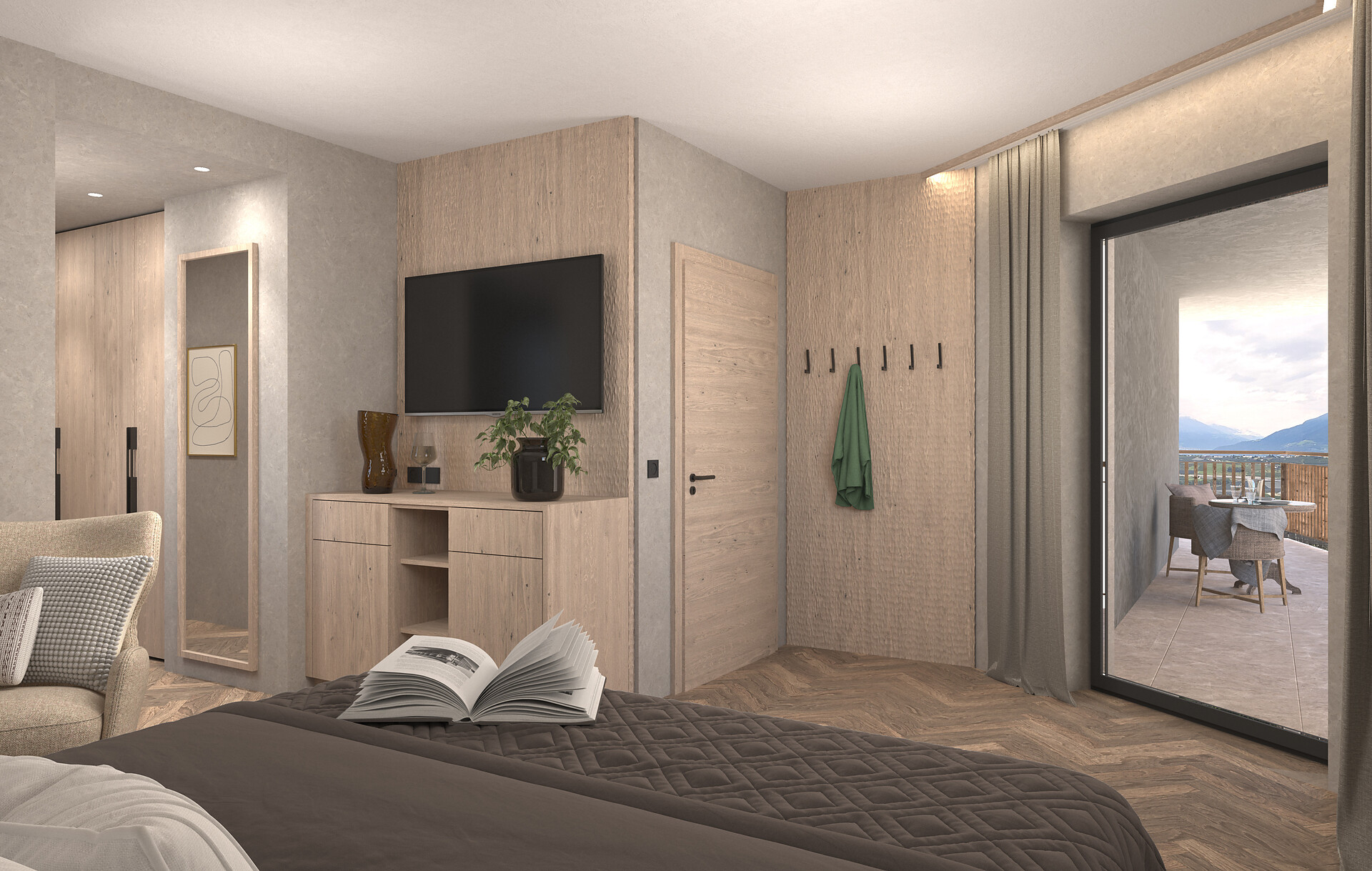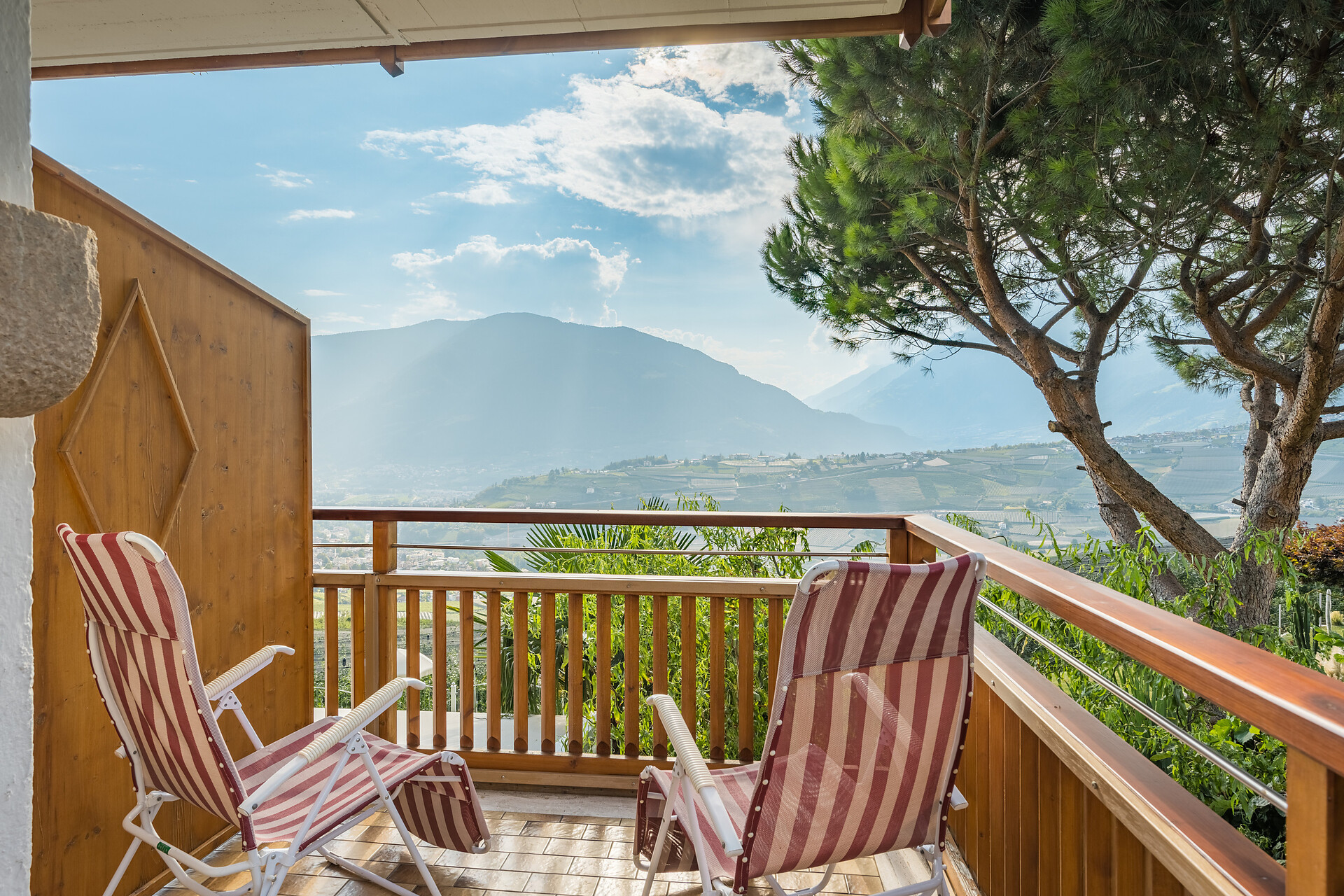 Appartement Loggia 42 qm, im Hochparterre gelegen, hochwertig ausgestattet mit 7qm Südwestbalkon zur Sonnenseite mit herrlichem Panoramablick auf´s Meranerland (Talseite).