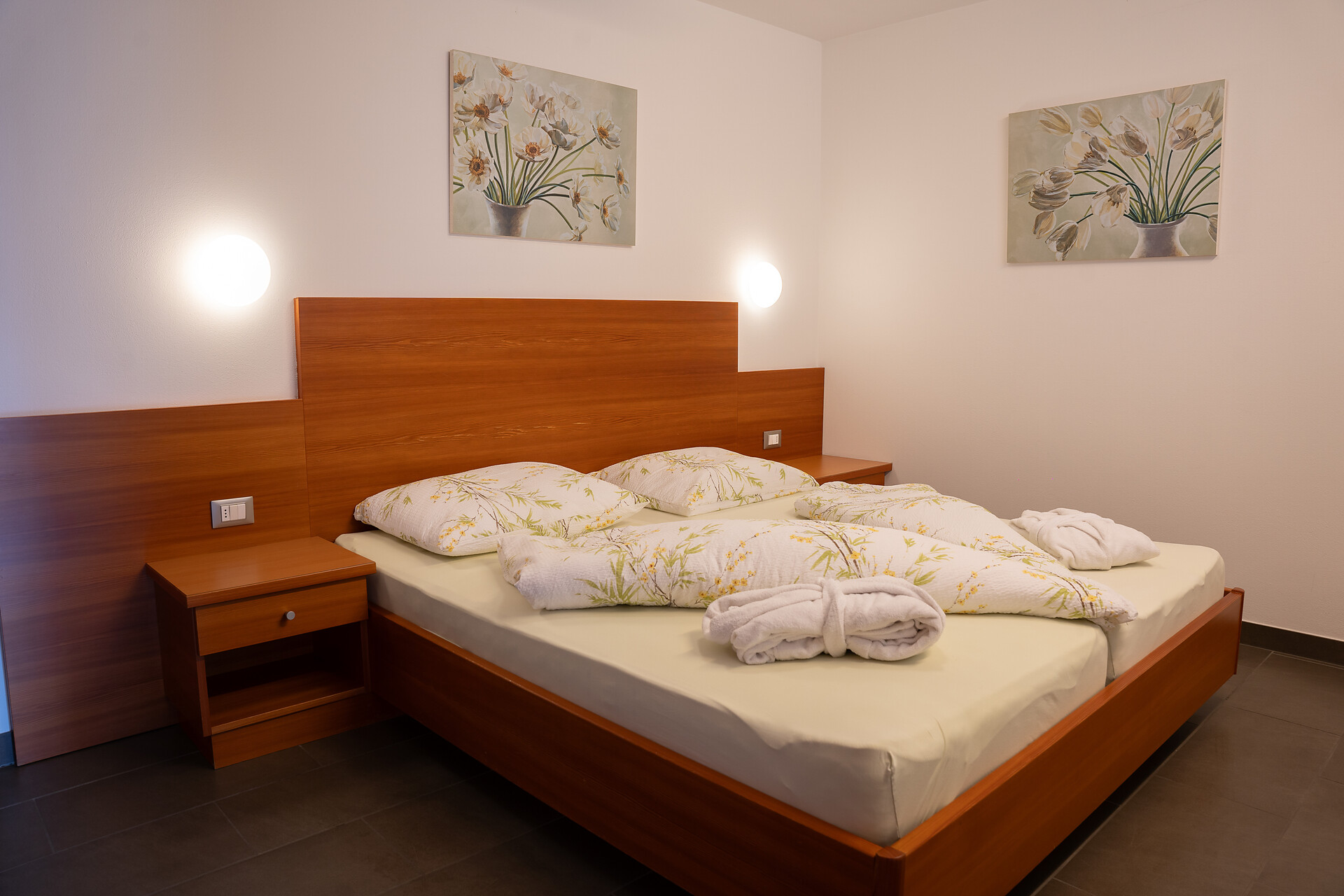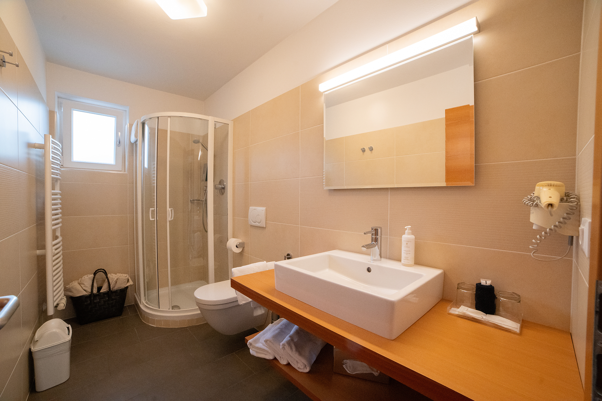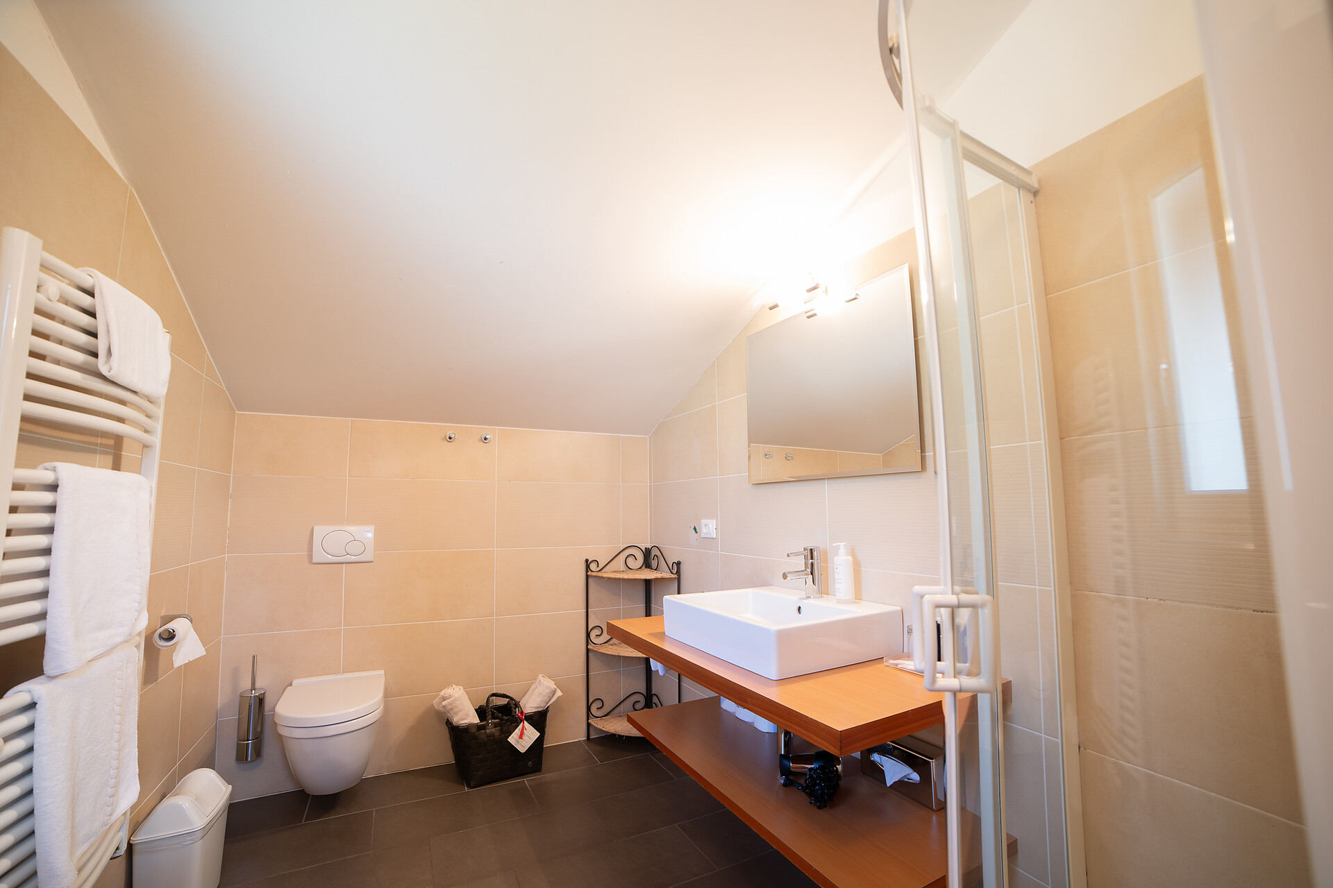 Ein Wellnesskorb mit Bademänteln, Badetüchern und Pantoffeln steht Ihnen während Ihres Aufenthalts zur Verfügung.