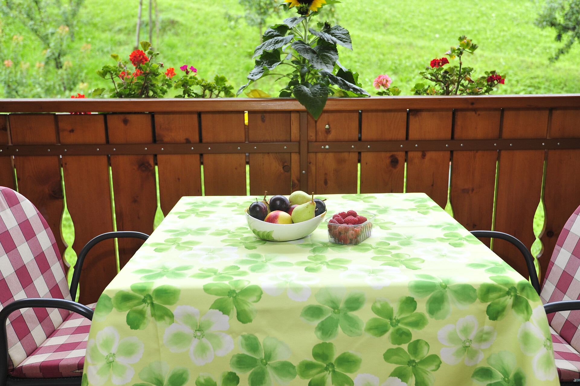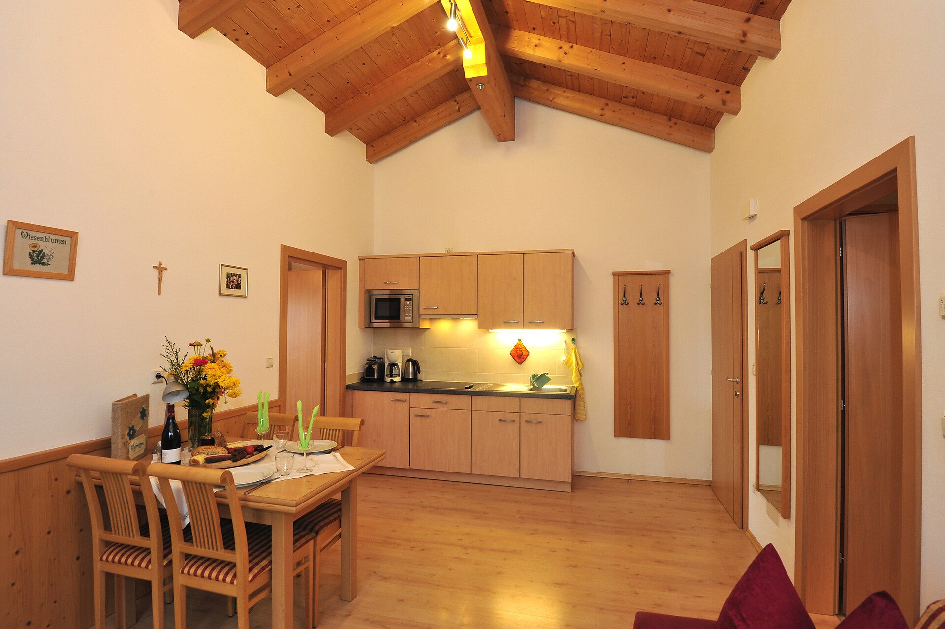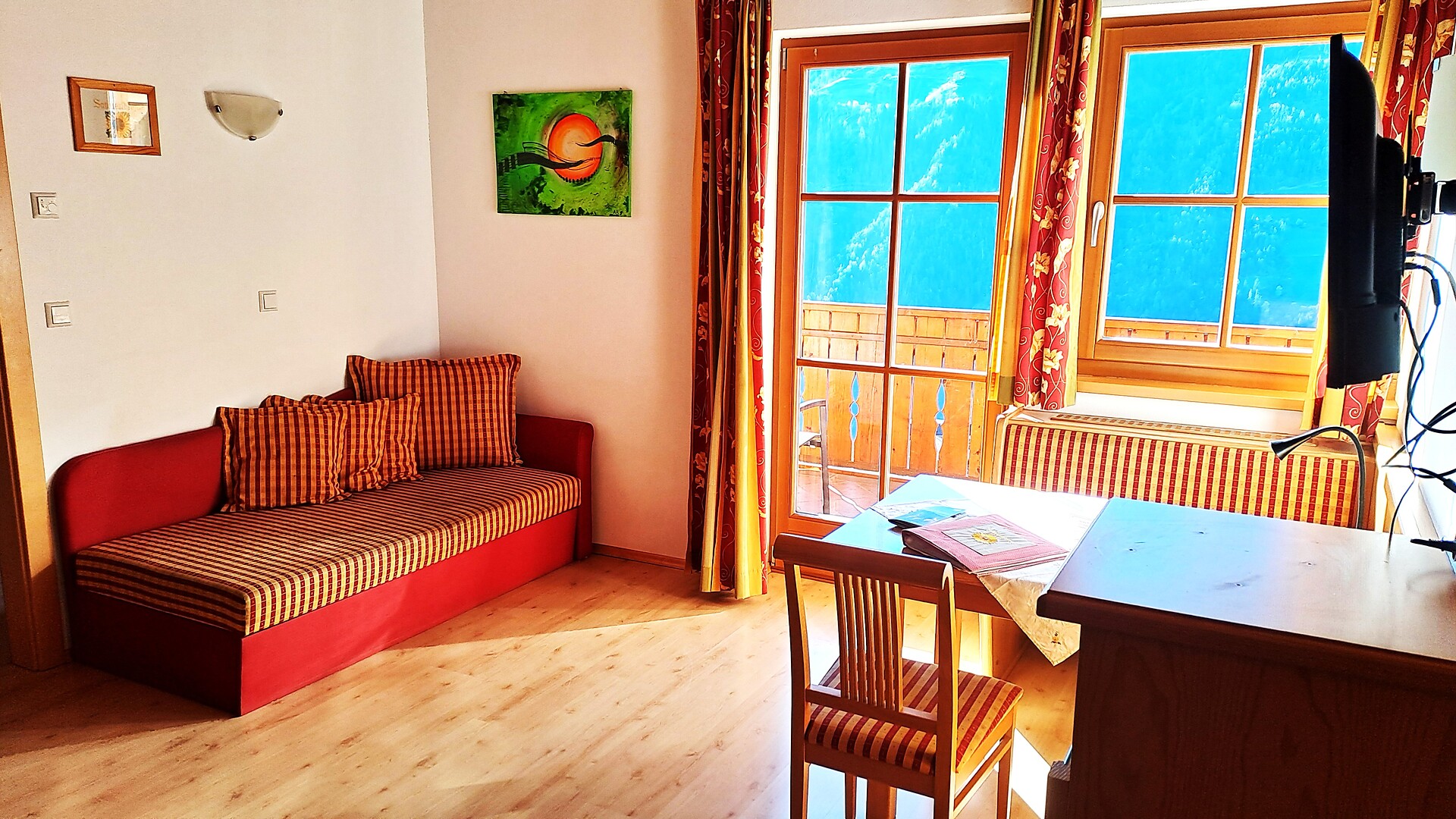 Die Wiesenblume hat einen Balkon Richtung Wiesenhang wo man den schönen Sonnenaufgang genießen kann, und eine kleine Gaube mit herrlichen Blick über das Burggrafenamt.