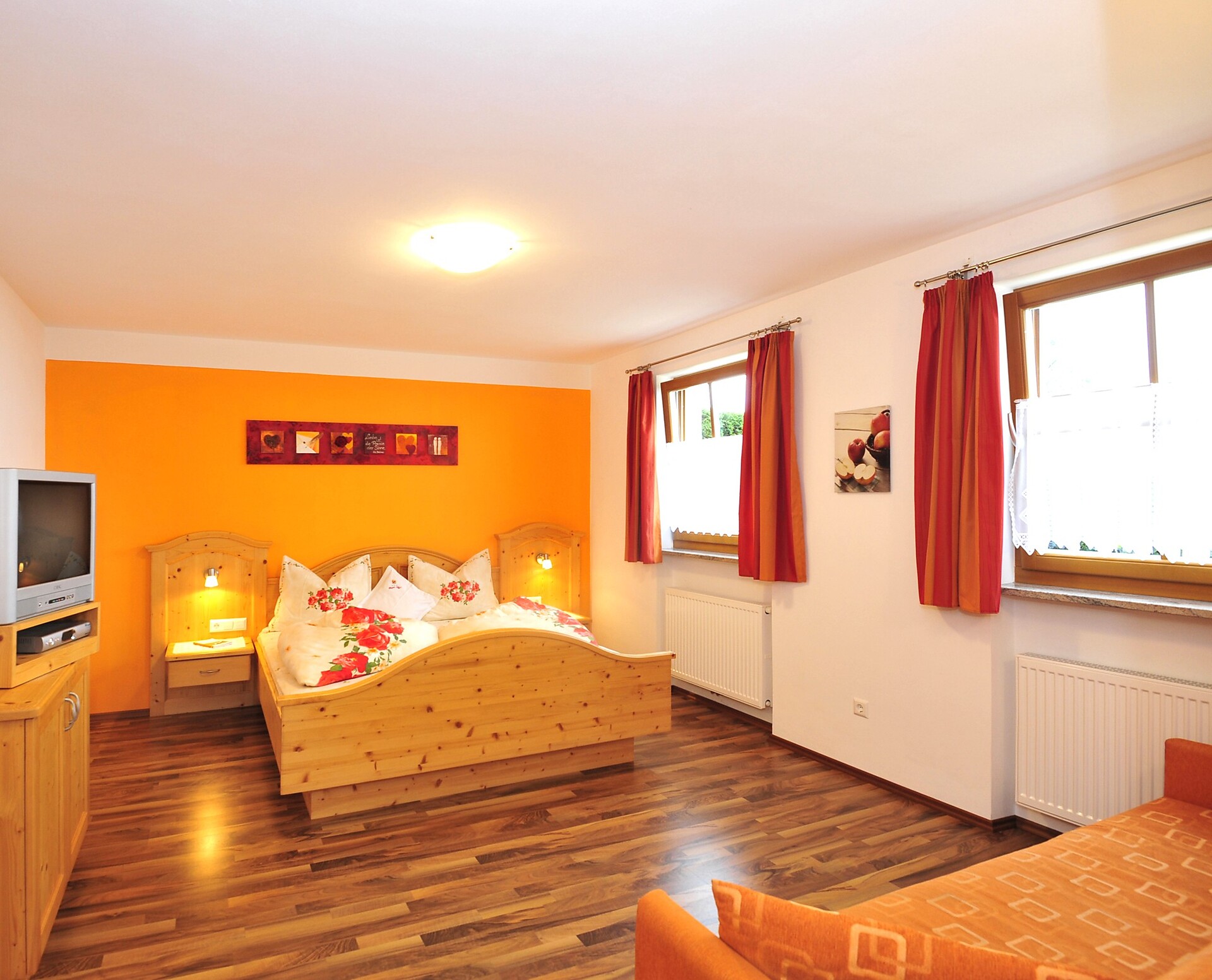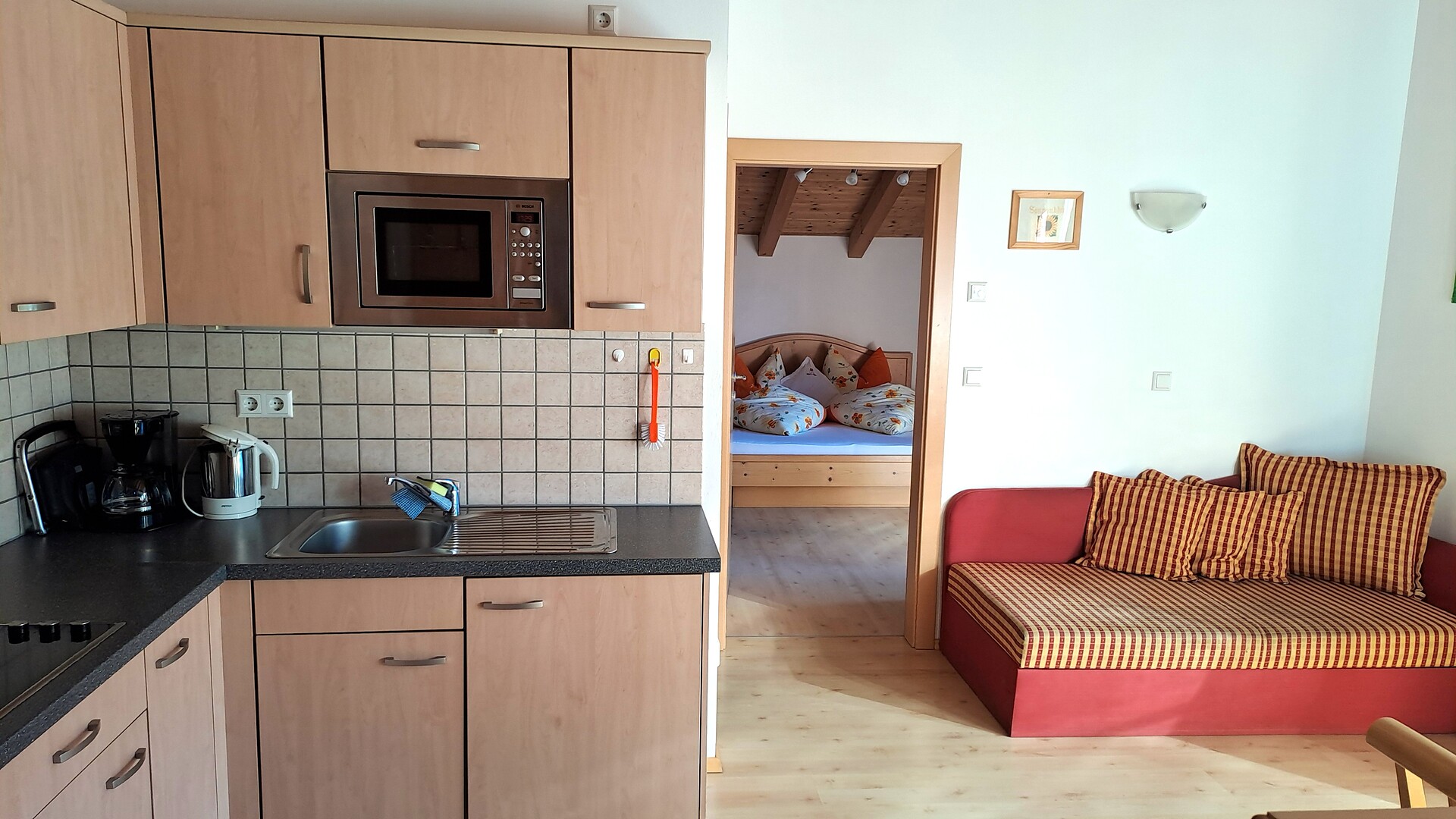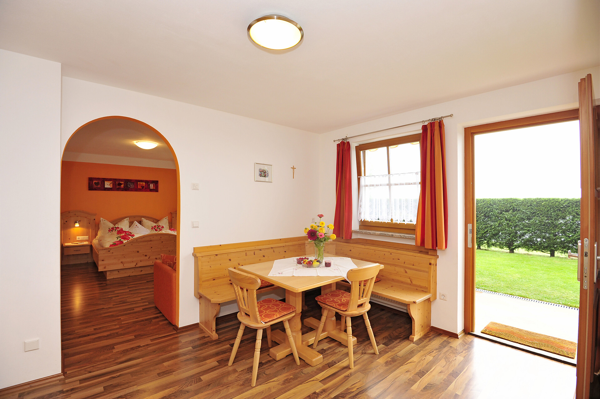 Die Wiesenblume hat einen Balkon Richtung Wiesenhang wo man den schönen Sonnenaufgang genießen kann, und eine kleine Gaube mit herrlichen Blick über das Burggrafenamt.