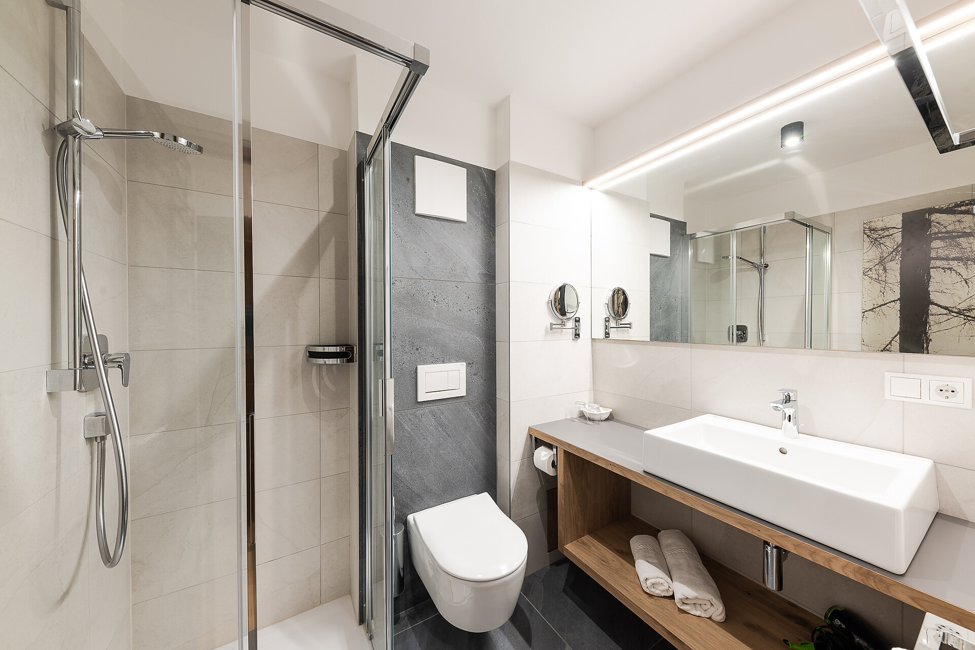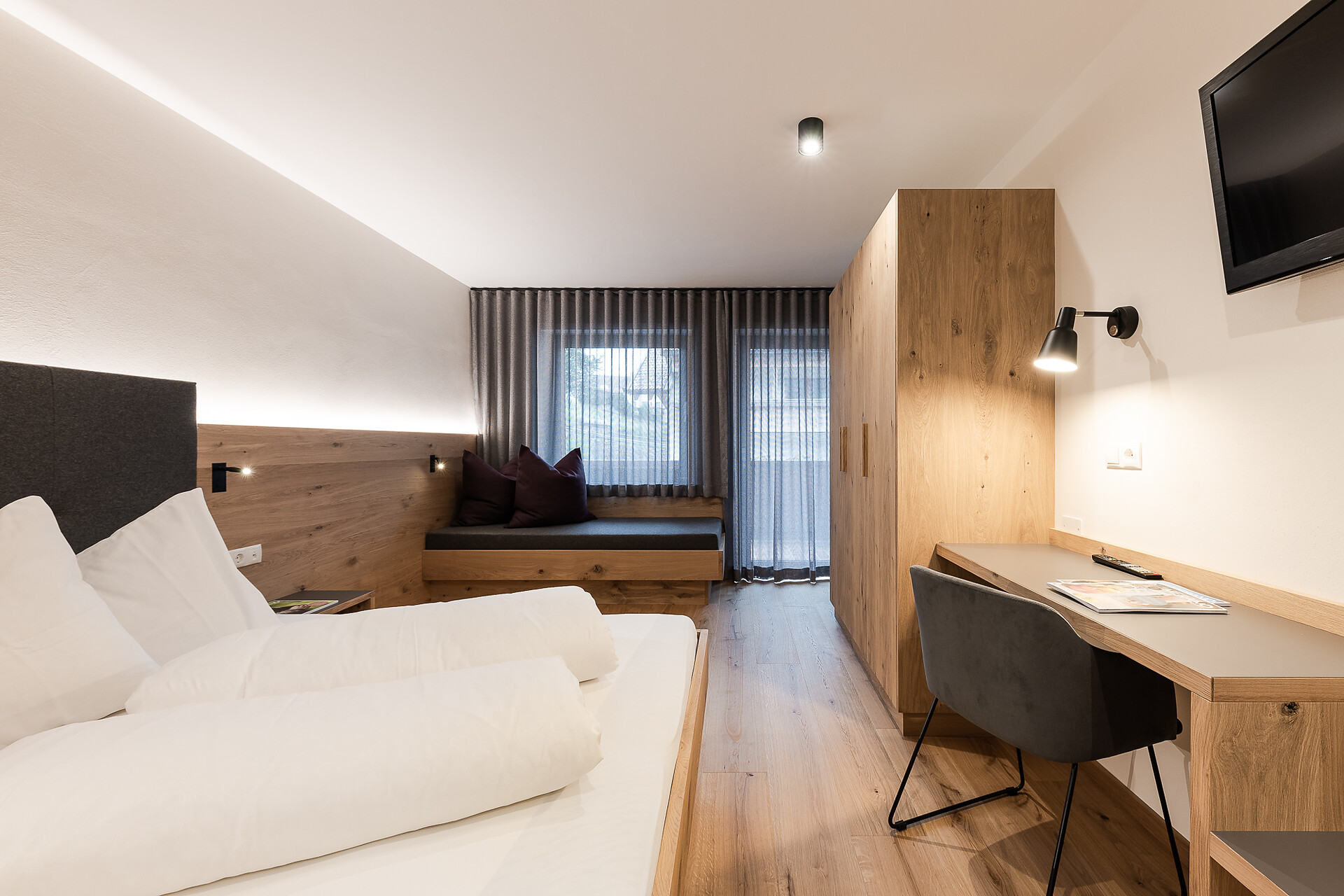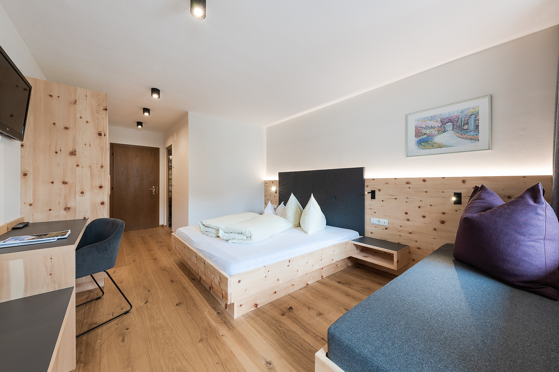 Zweibettzimmer, Doppelzimmer, Mehrbettzimmer, Doppelbett, Zustellbett, Babybett, Balkon, Terrasse, Zimmer mit Verbindungstür, Safe, Dusche / Bad, Bidet, Haarfön, TV, Satellit/Kabel, WLAN, Haupthaus, Panoramablick, Südseite