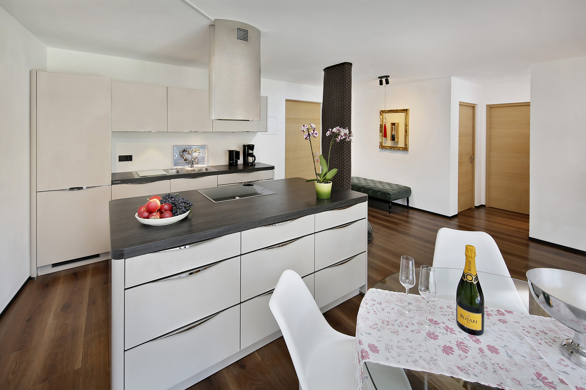 Doppelbett, Babybett, Doppelschlafcouch, Balkon, Separater Wohnraum, Bettwäsche vorhanden, Wohnküche, Kaffeemaschine, Geschirrspülmaschine, Elektroherd, Geschirrausstattung, Wasserkocher, Dusche/Bad, Haarfön, Badetücher, TV, Satellit/Kabel, WLAN, Endreinigung inbegriffen, Haupthaus, Panoramablick, Südseite