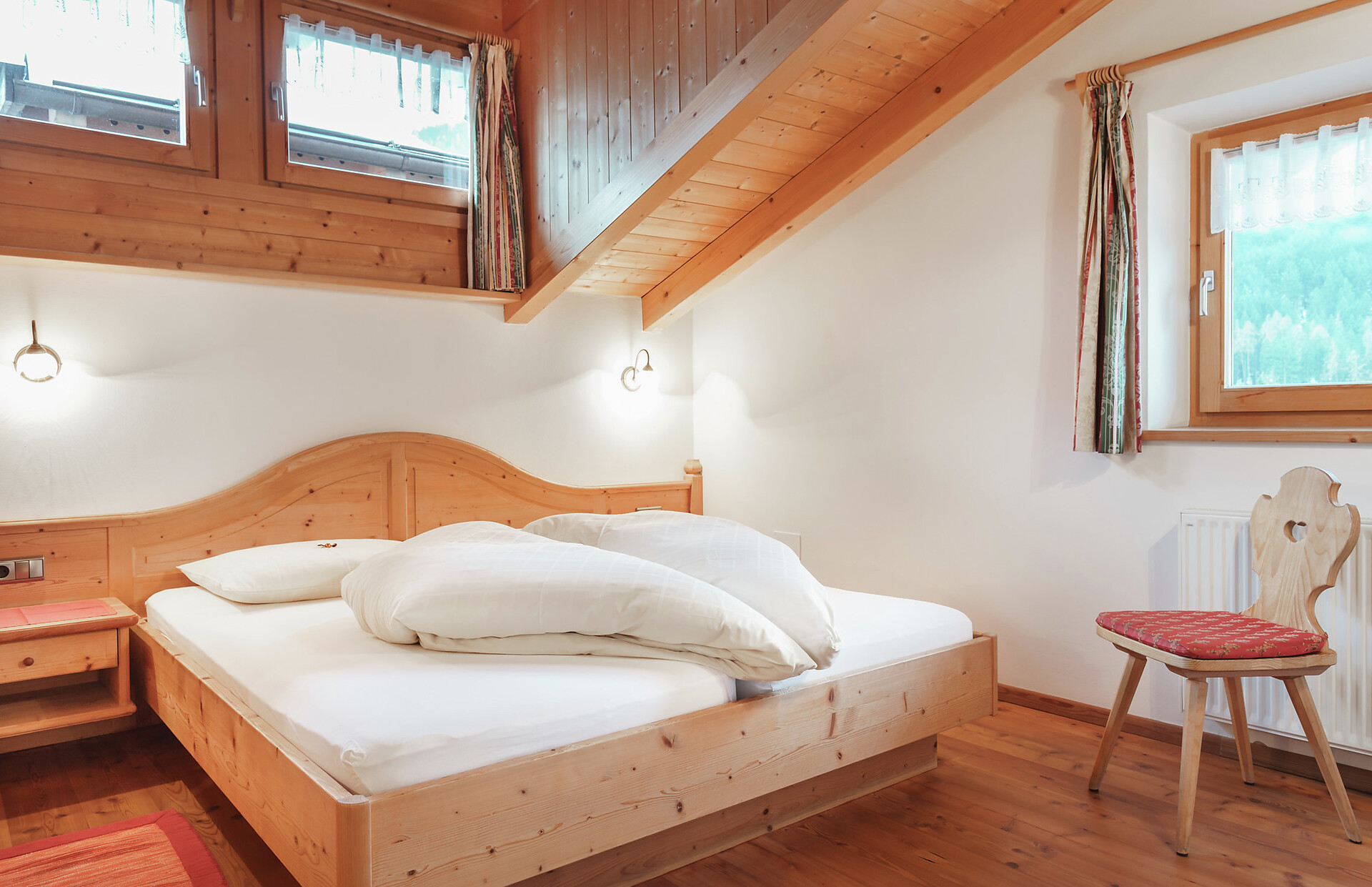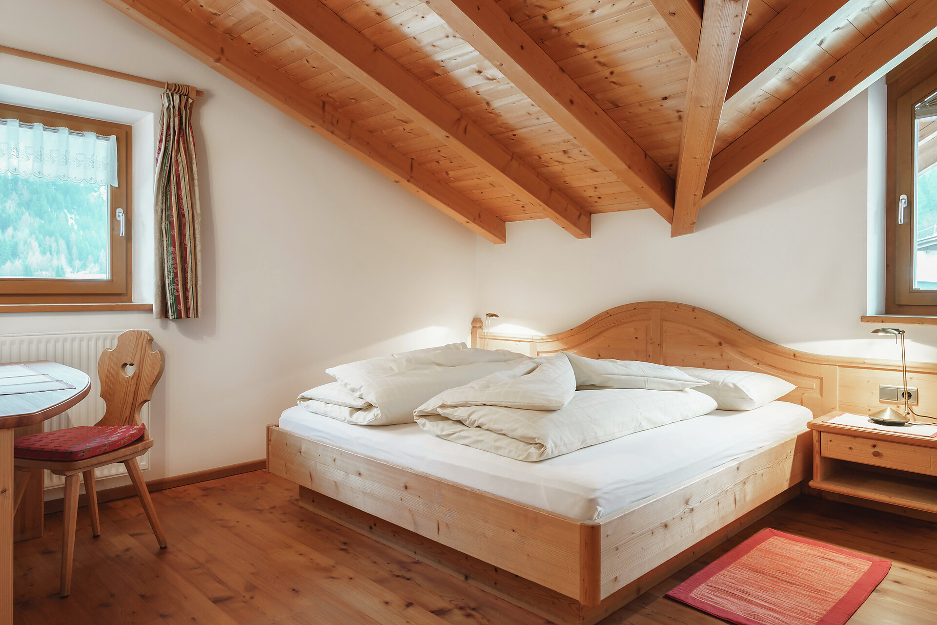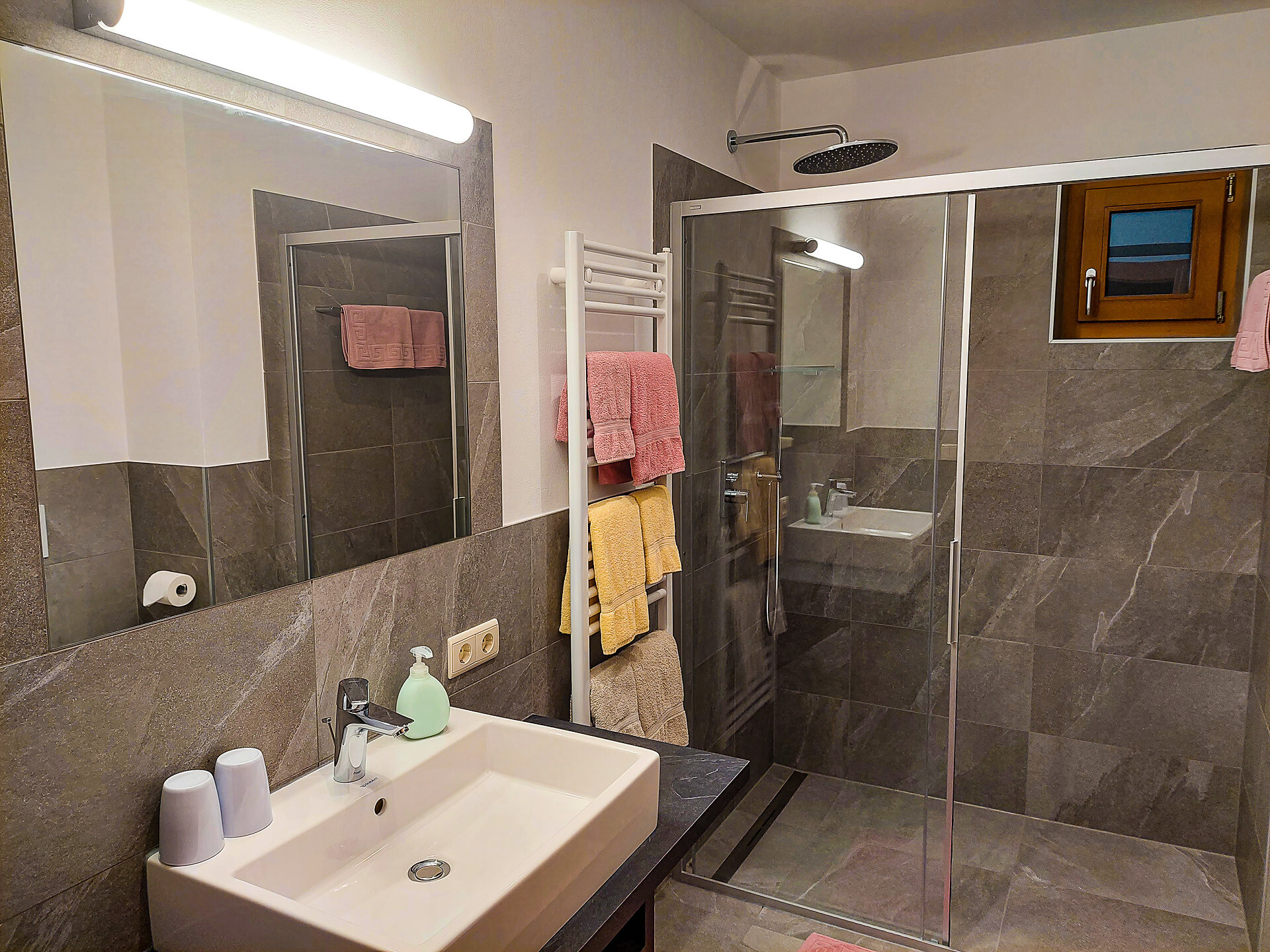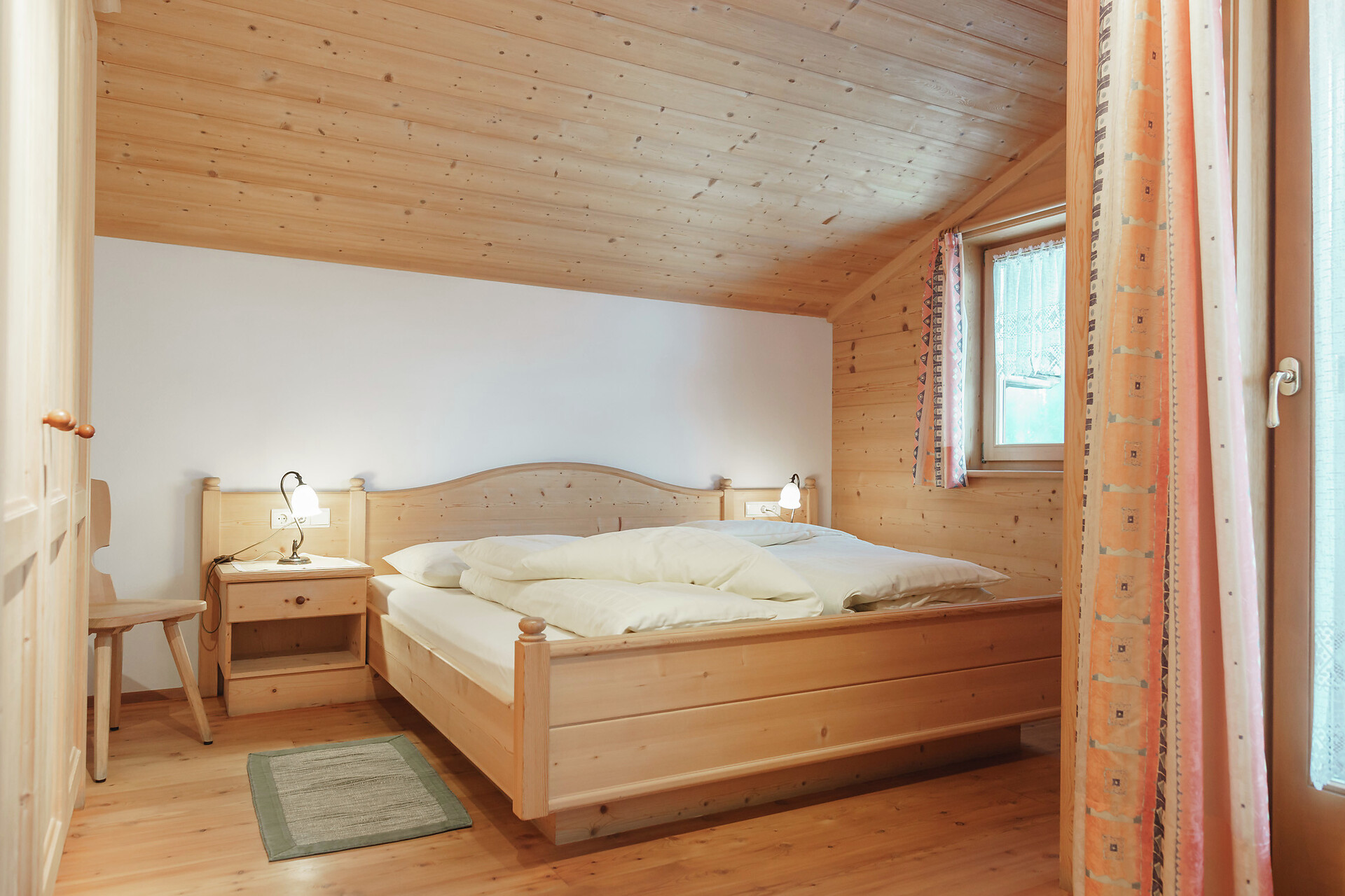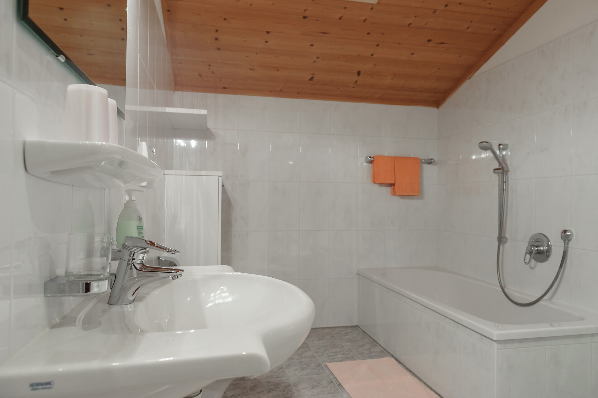 Zwei 55 bis 60 m² große, helle, nebeneinander liegende Dachgeschosswohnungen mit Giebel. Eine setzt sich aus zwei Doppelbettzimmern mit jeweils eigener Dusche – WC und einem geräumigen Wohnraum mit Südwestbalkon (Nachmittagssonne mit schönem Talblick) zusammen. Darin können 2 bis 6 Personen wohnen. Ideal für 2 Paare oder Familien.