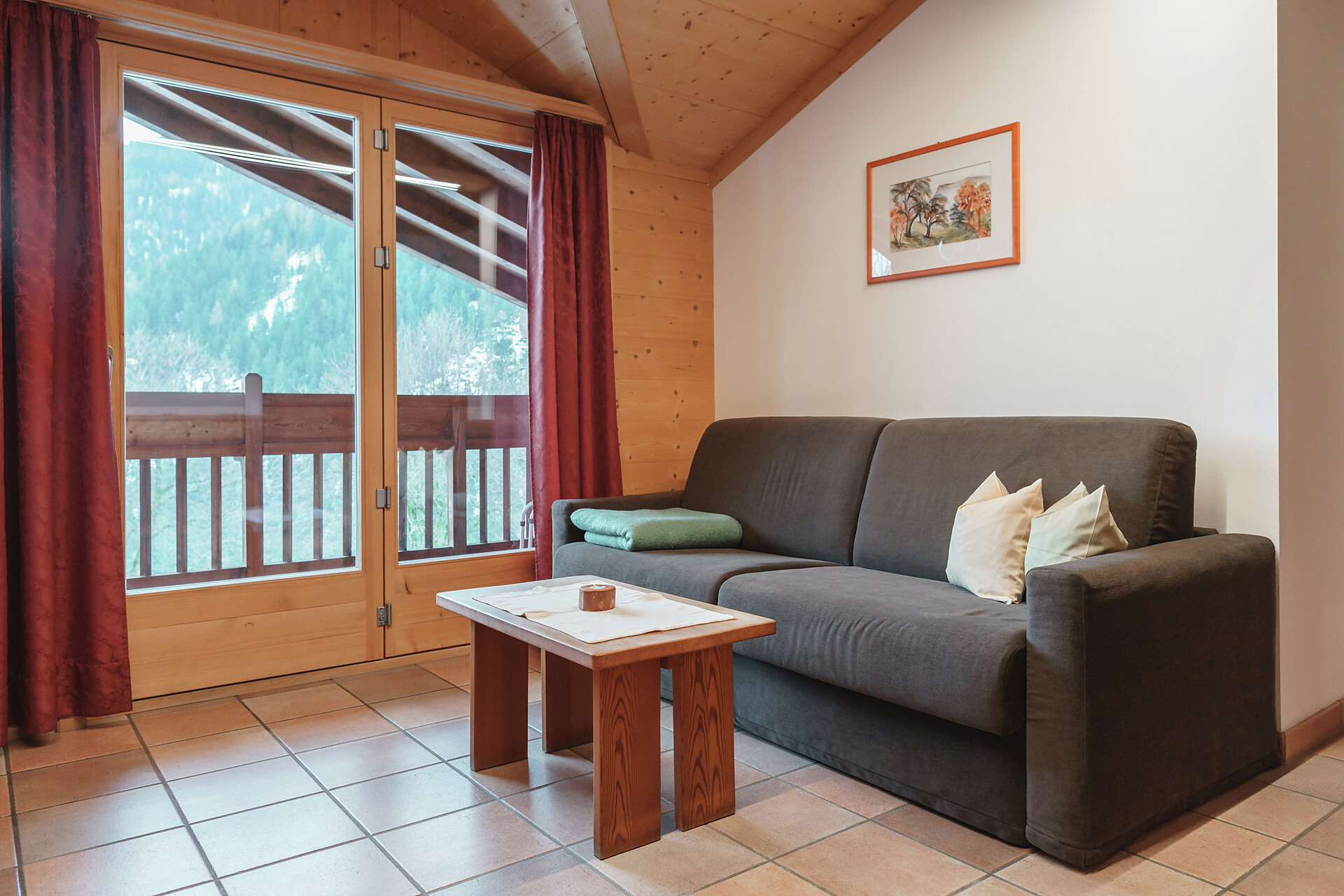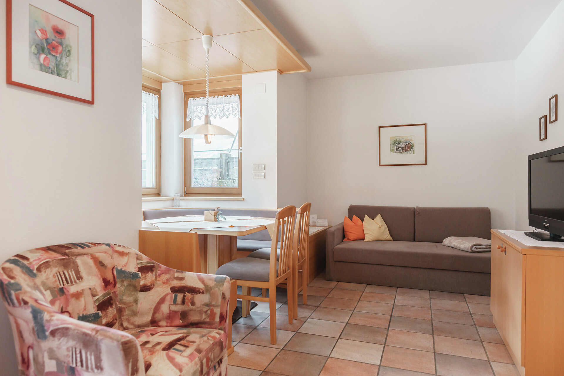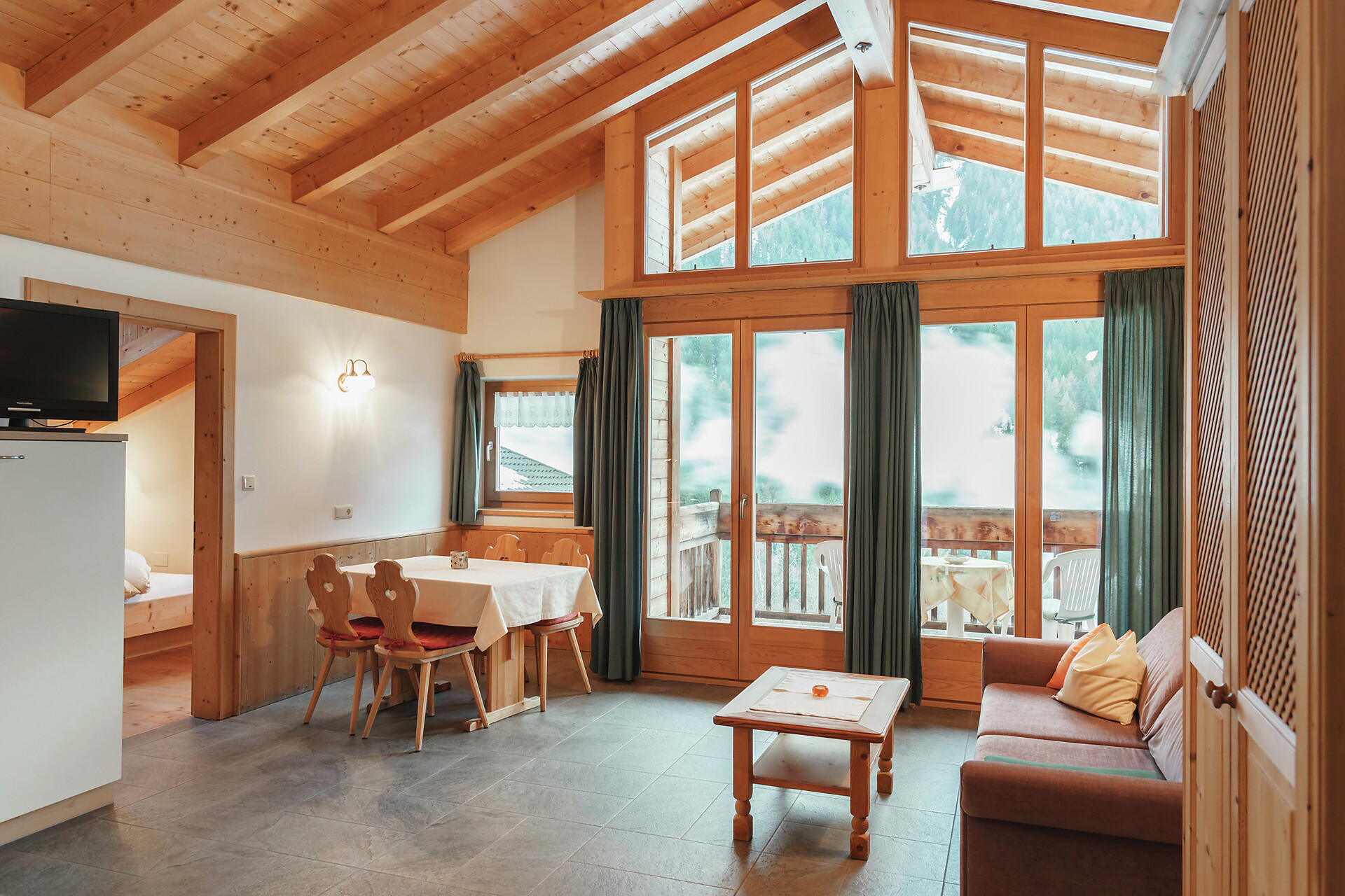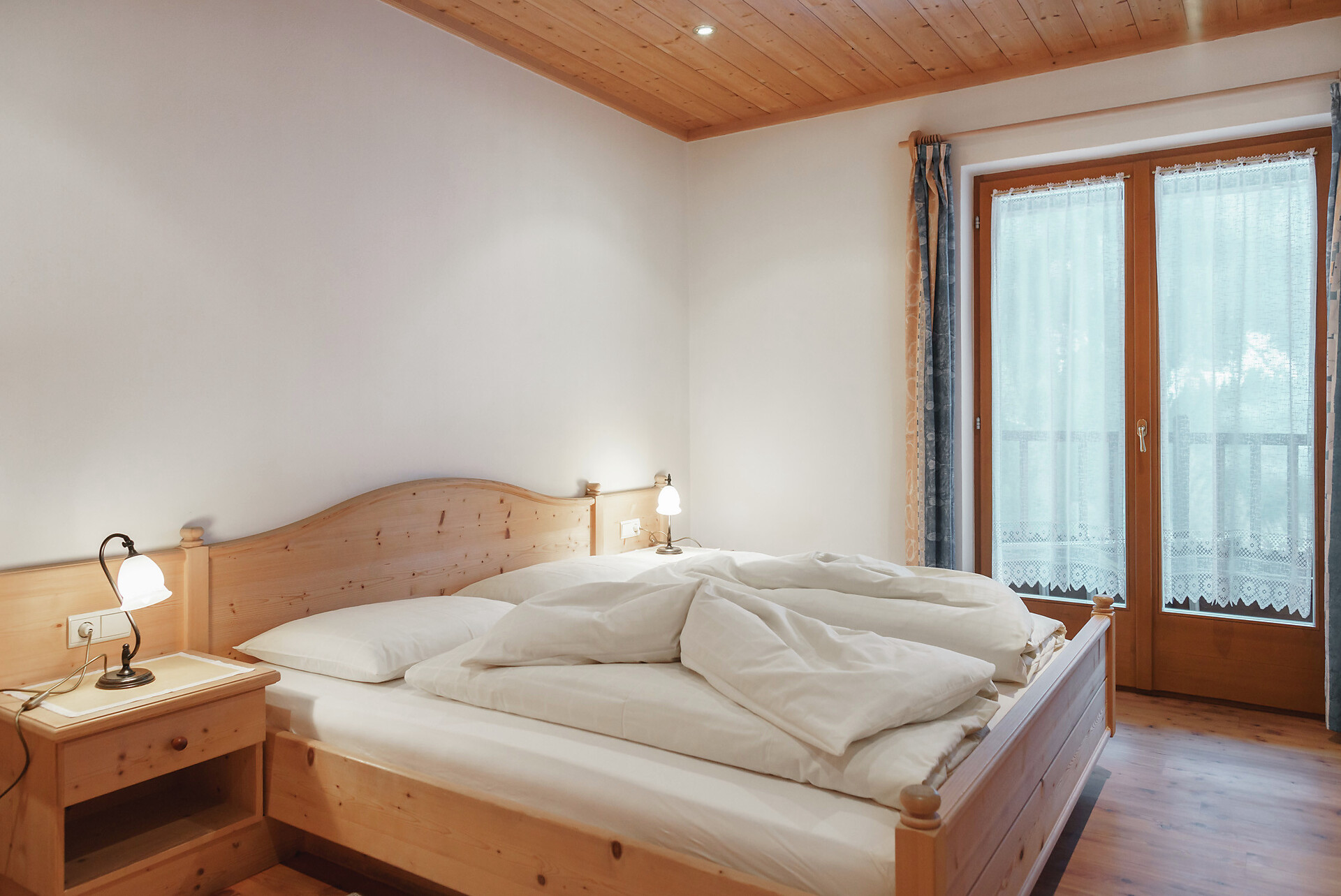 Zwei 55 bis 60 m² große, helle, nebeneinander liegende Dachgeschosswohnungen mit Giebel. Eine setzt sich aus zwei Doppelbettzimmern mit jeweils eigener Dusche – WC und einem geräumigen Wohnraum mit Südwestbalkon (Nachmittagssonne mit schönem Talblick) zusammen. Darin können 2 bis 6 Personen wohnen. Ideal für 2 Paare oder Familien.
