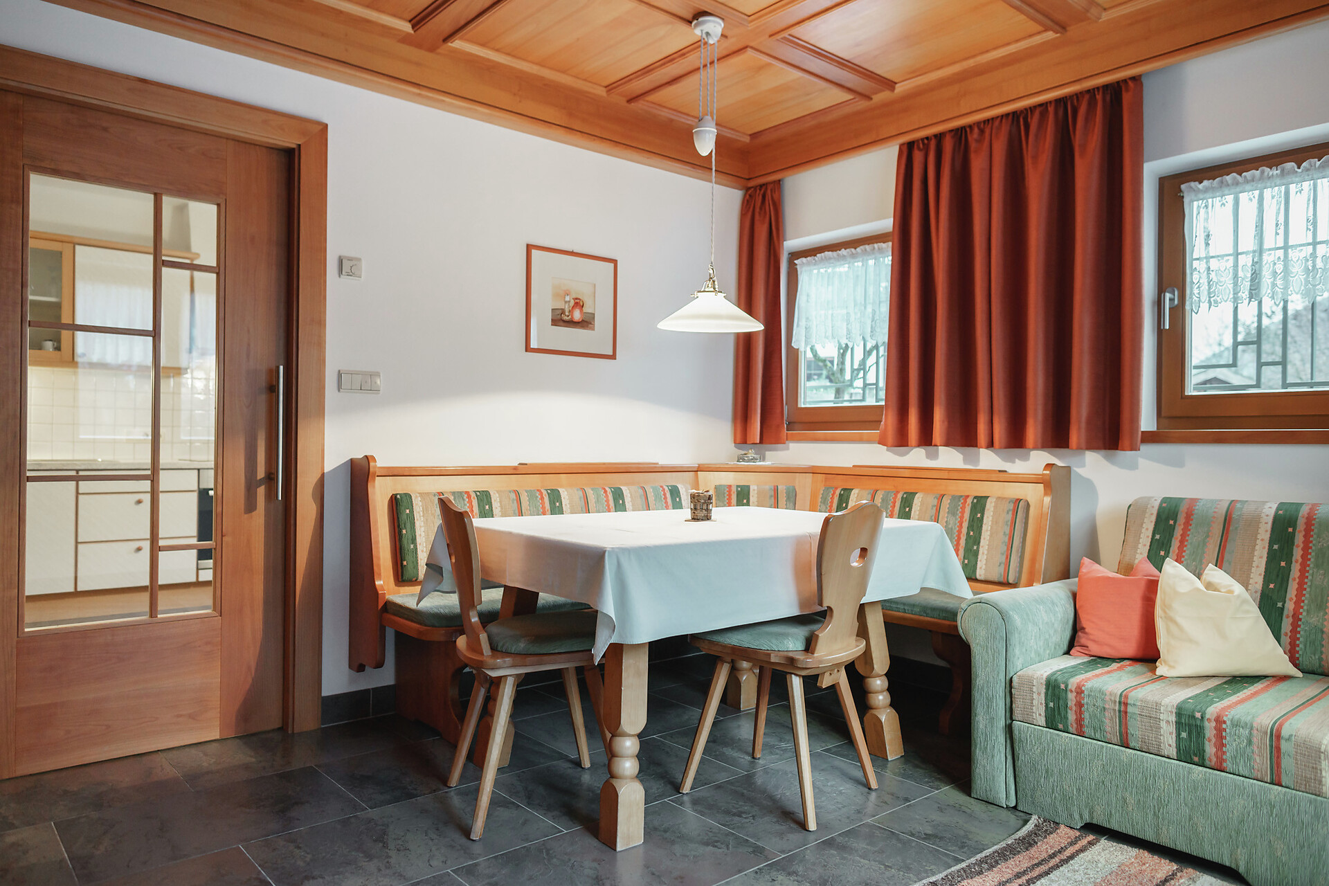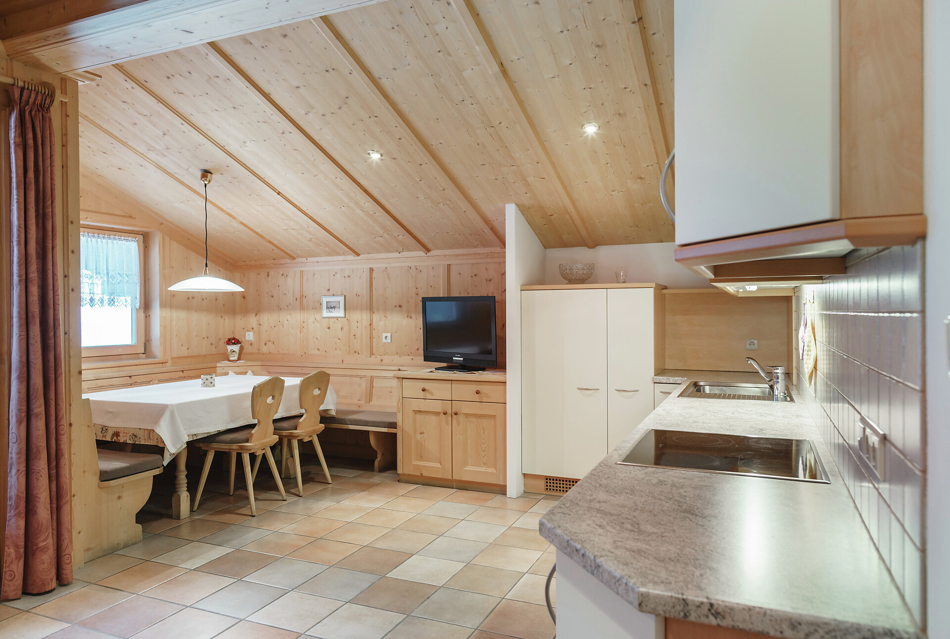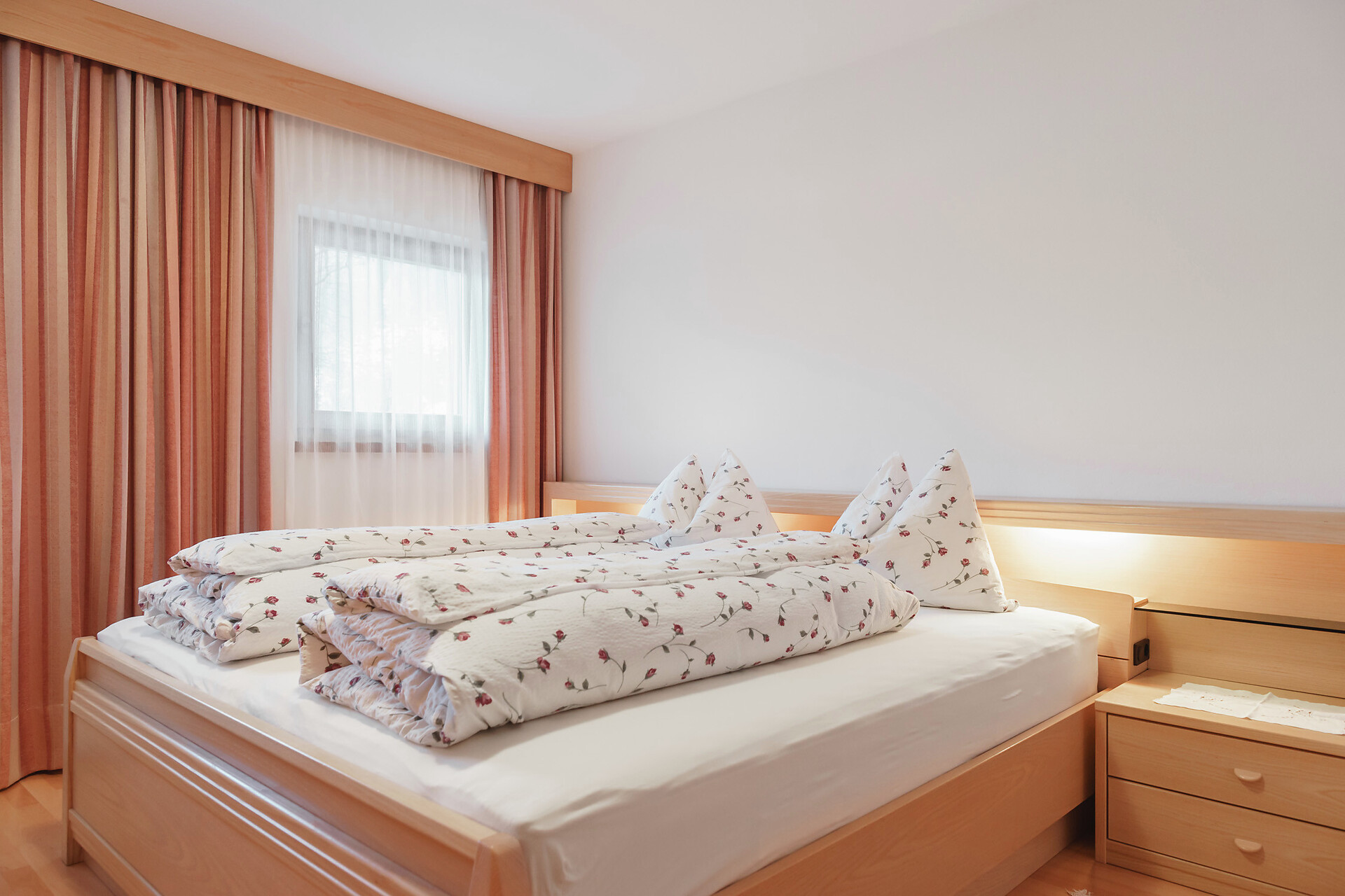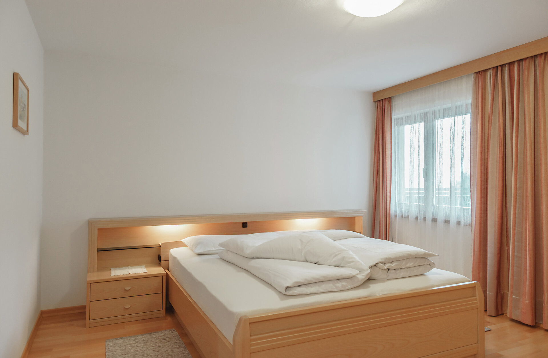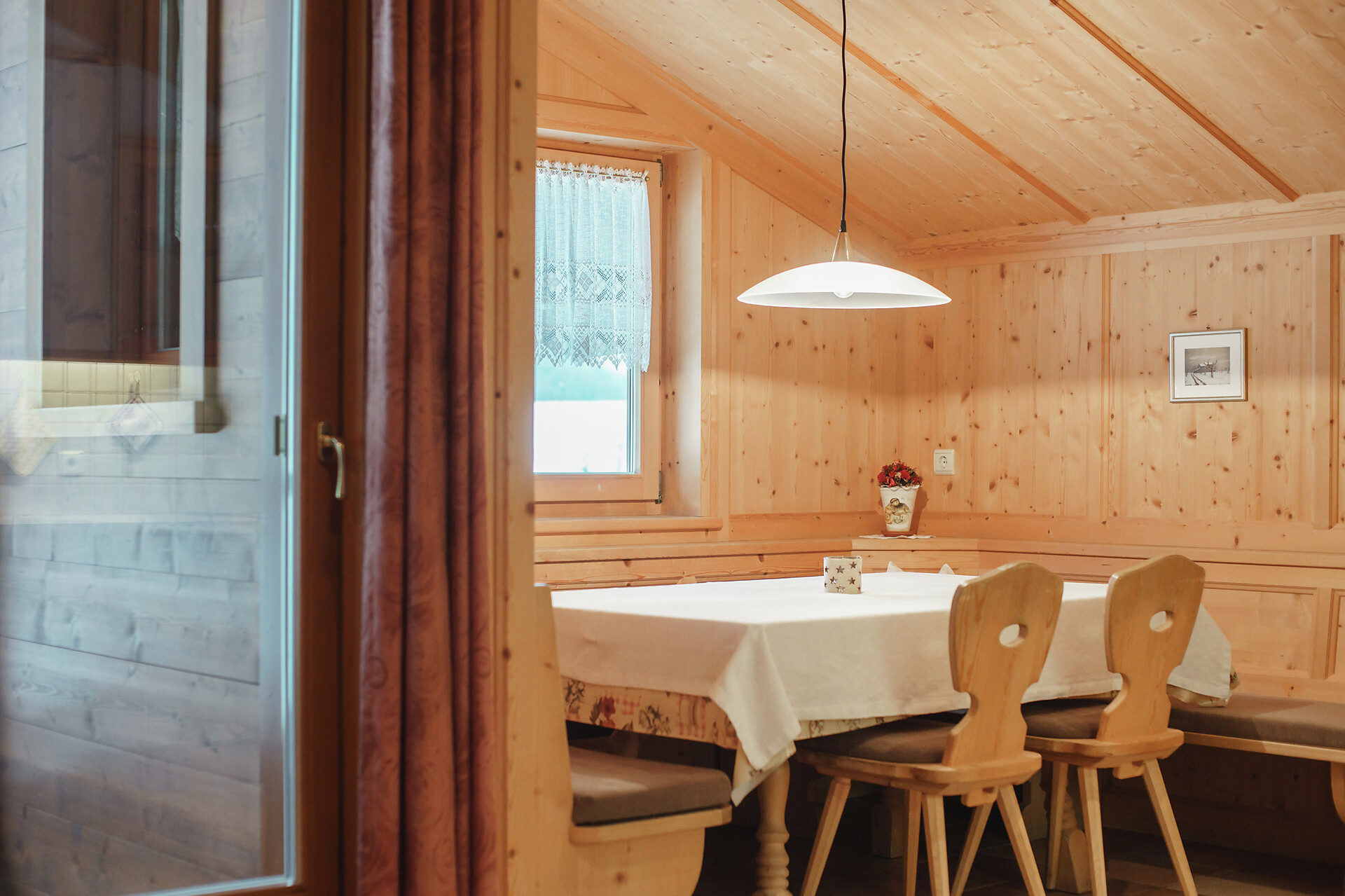Zwei 55 bis 60 m² große, helle, nebeneinander liegende Dachgeschosswohnungen mit Giebel. Eine setzt sich aus zwei Doppelbettzimmern mit jeweils eigener Dusche – WC und einem geräumigen Wohnraum mit Südwestbalkon (Nachmittagssonne mit schönem Talblick) zusammen. Darin können 2 bis 6 Personen wohnen. Ideal für 2 Paare oder Familien.