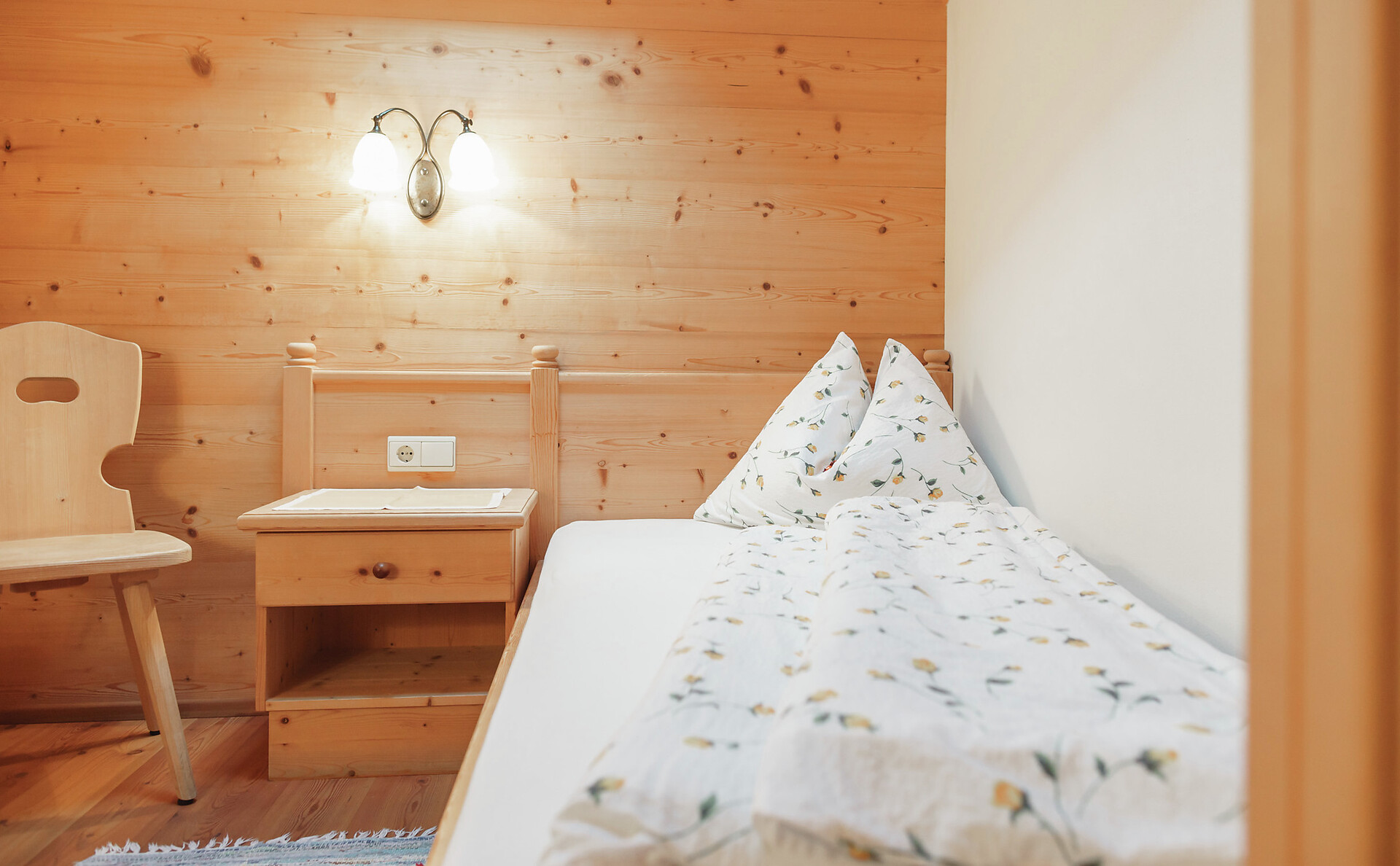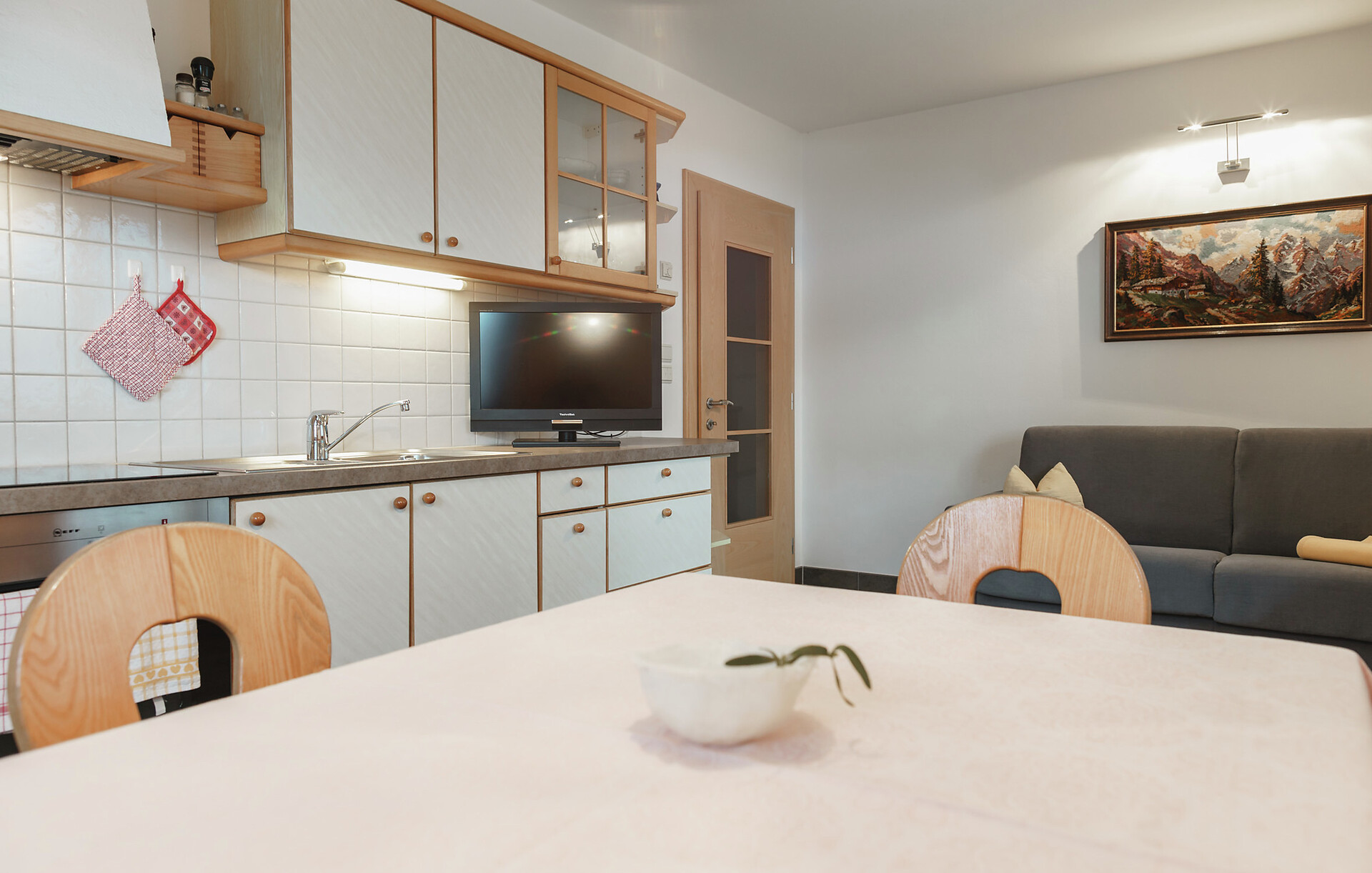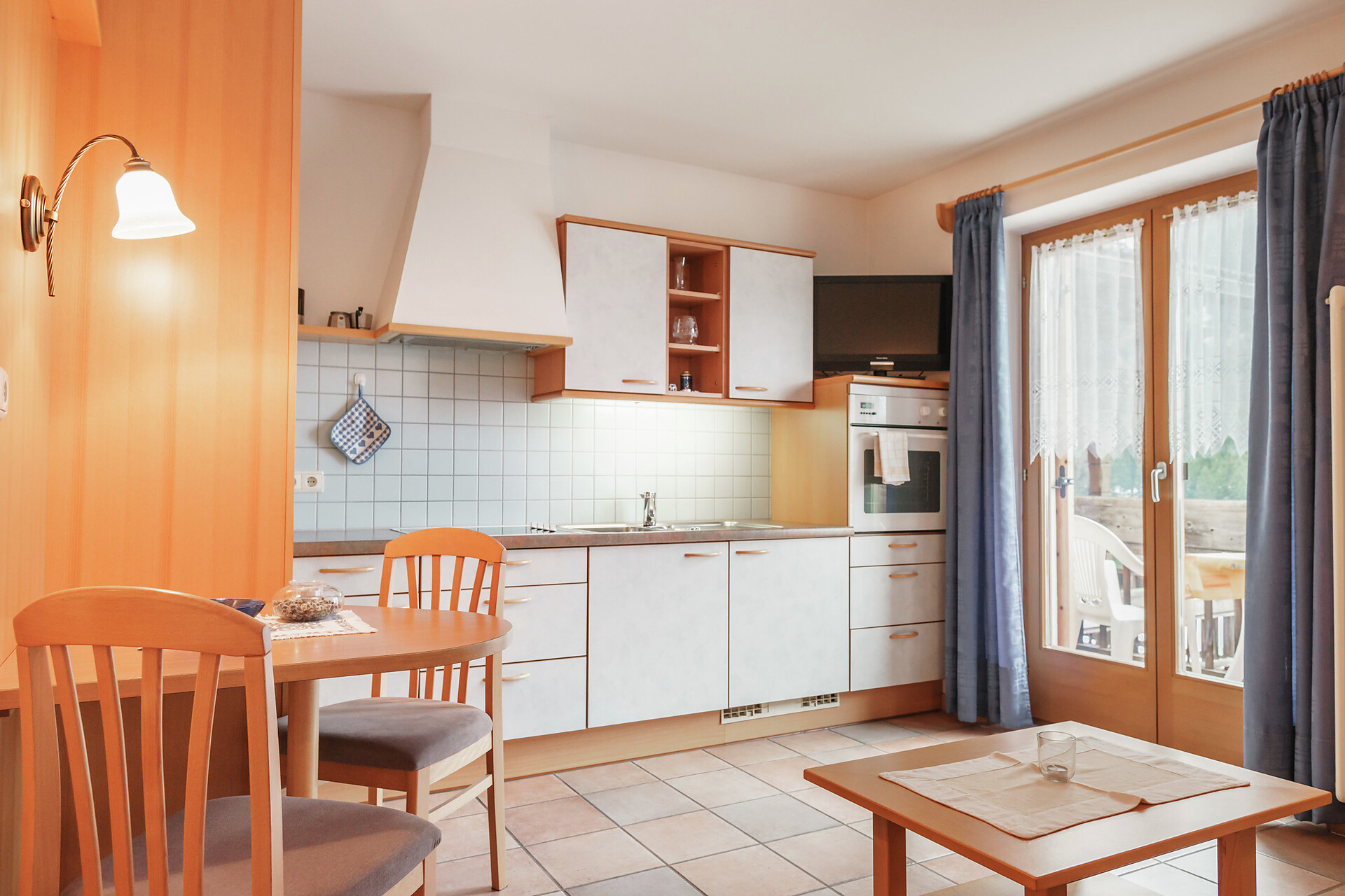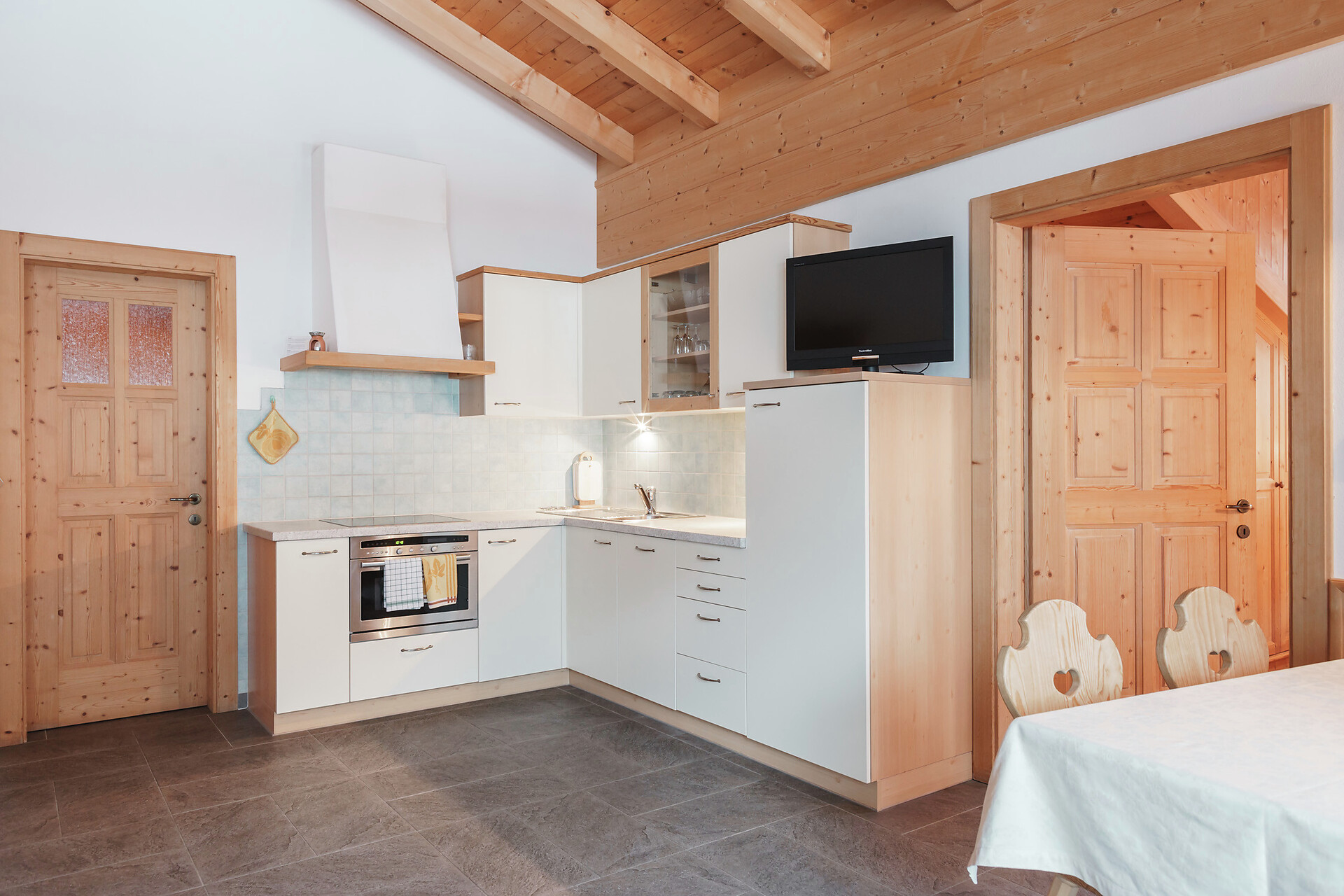 Zwei 55 bis 60 m² große, helle, nebeneinander liegende Dachgeschosswohnungen mit Giebel. Eine setzt sich aus zwei Doppelbettzimmern mit jeweils eigener Dusche – WC und einem geräumigen Wohnraum mit Südwestbalkon (Nachmittagssonne mit schönem Talblick) zusammen. Darin können 2 bis 6 Personen wohnen. Ideal für 2 Paare oder Familien.