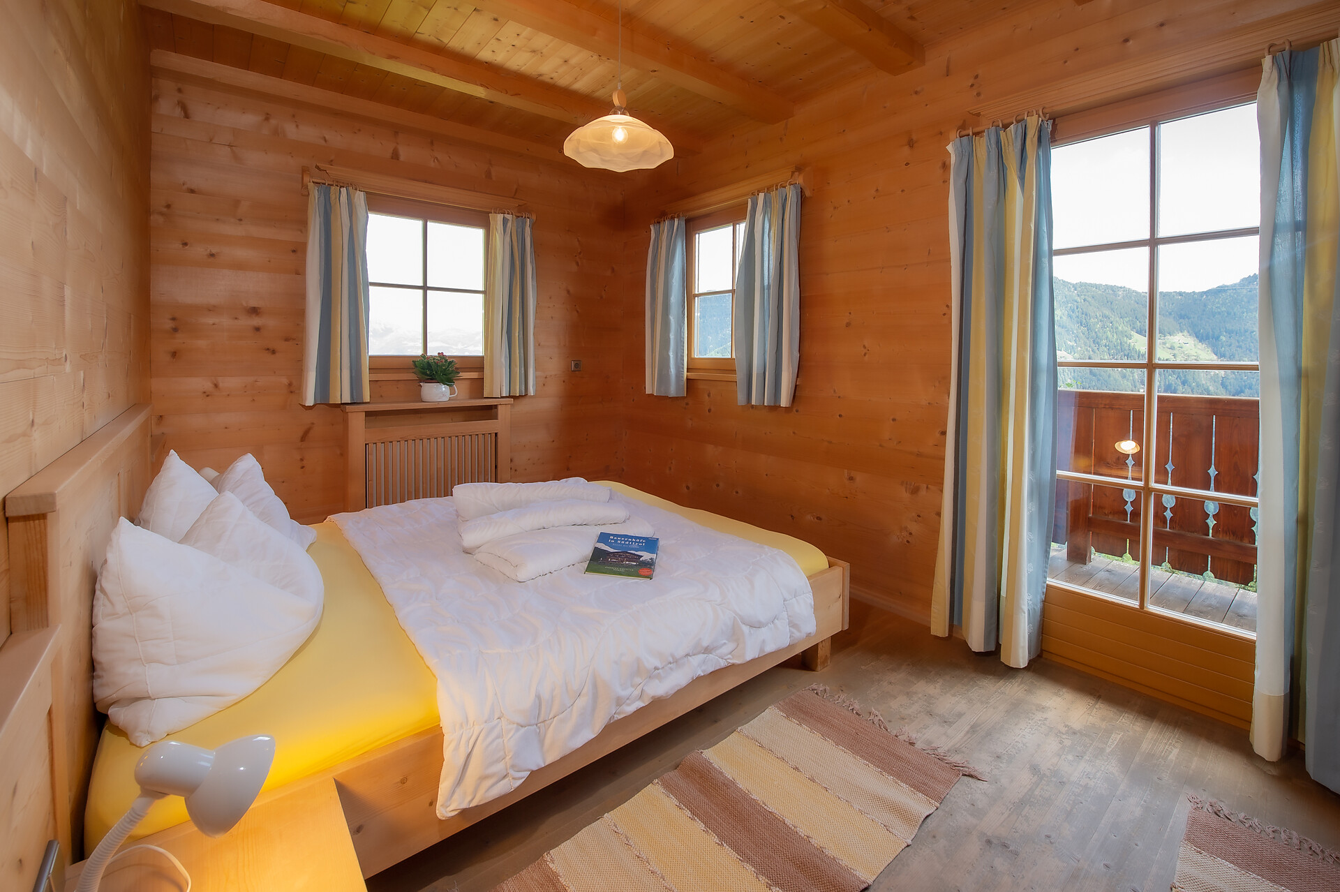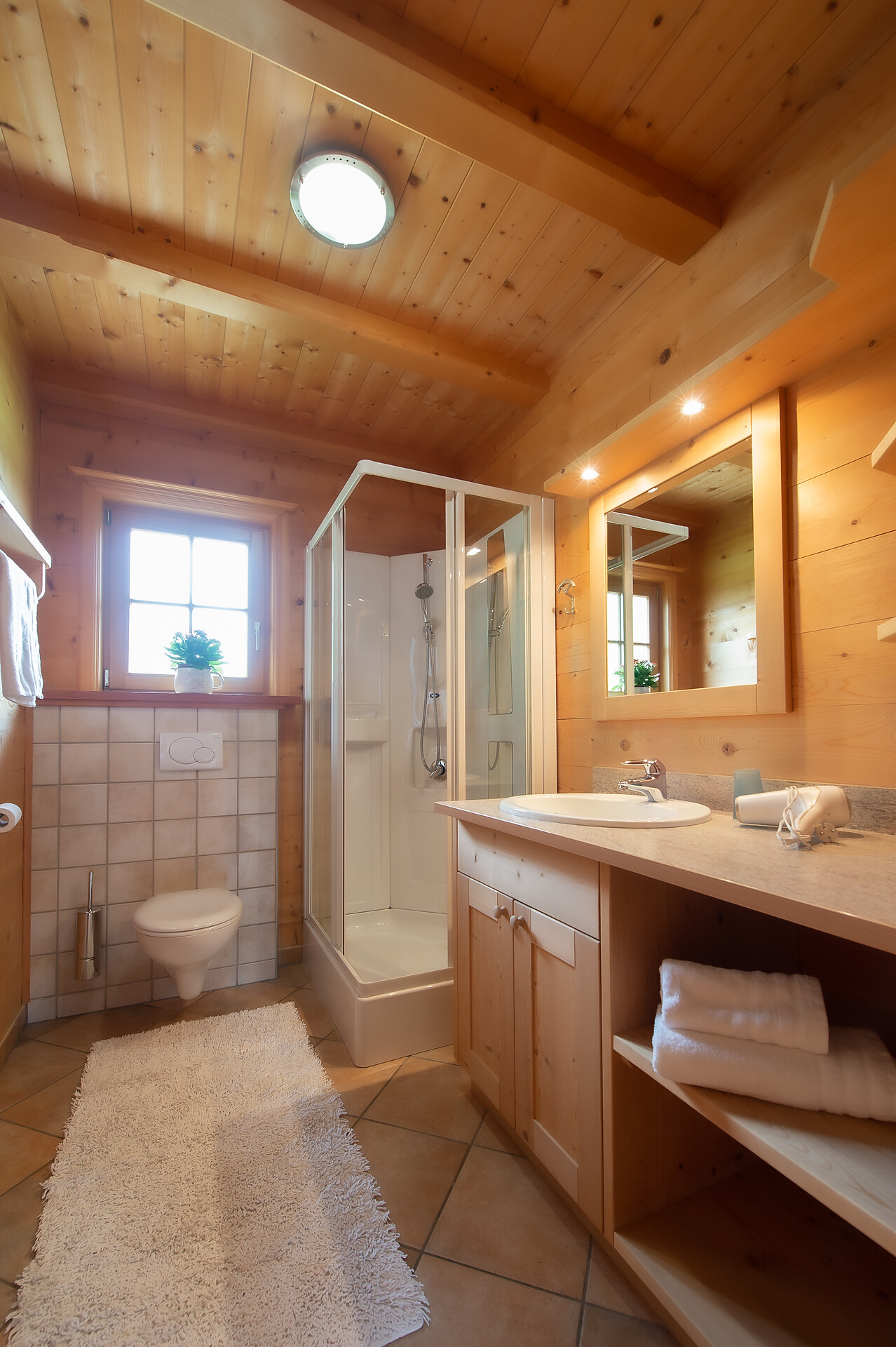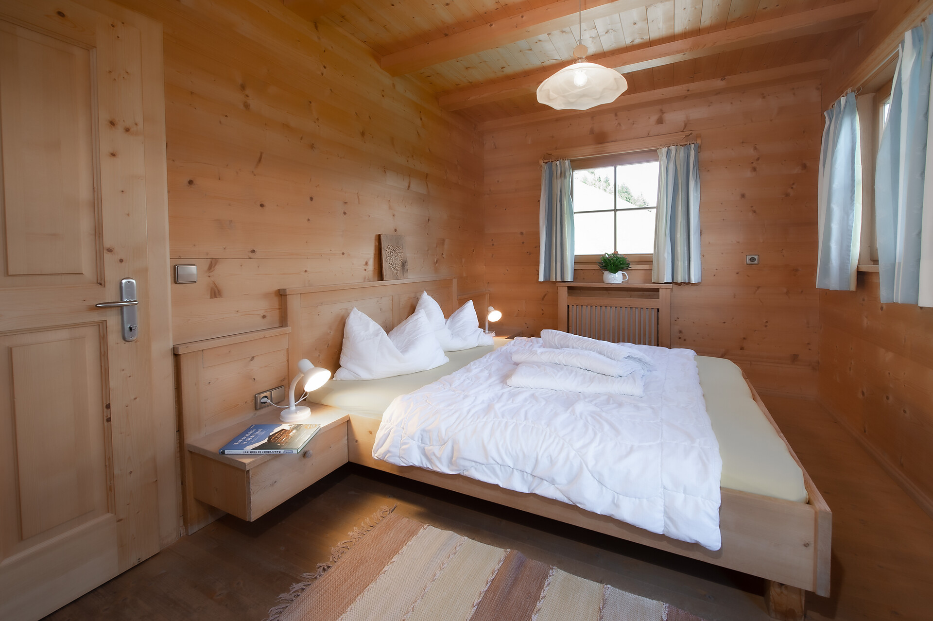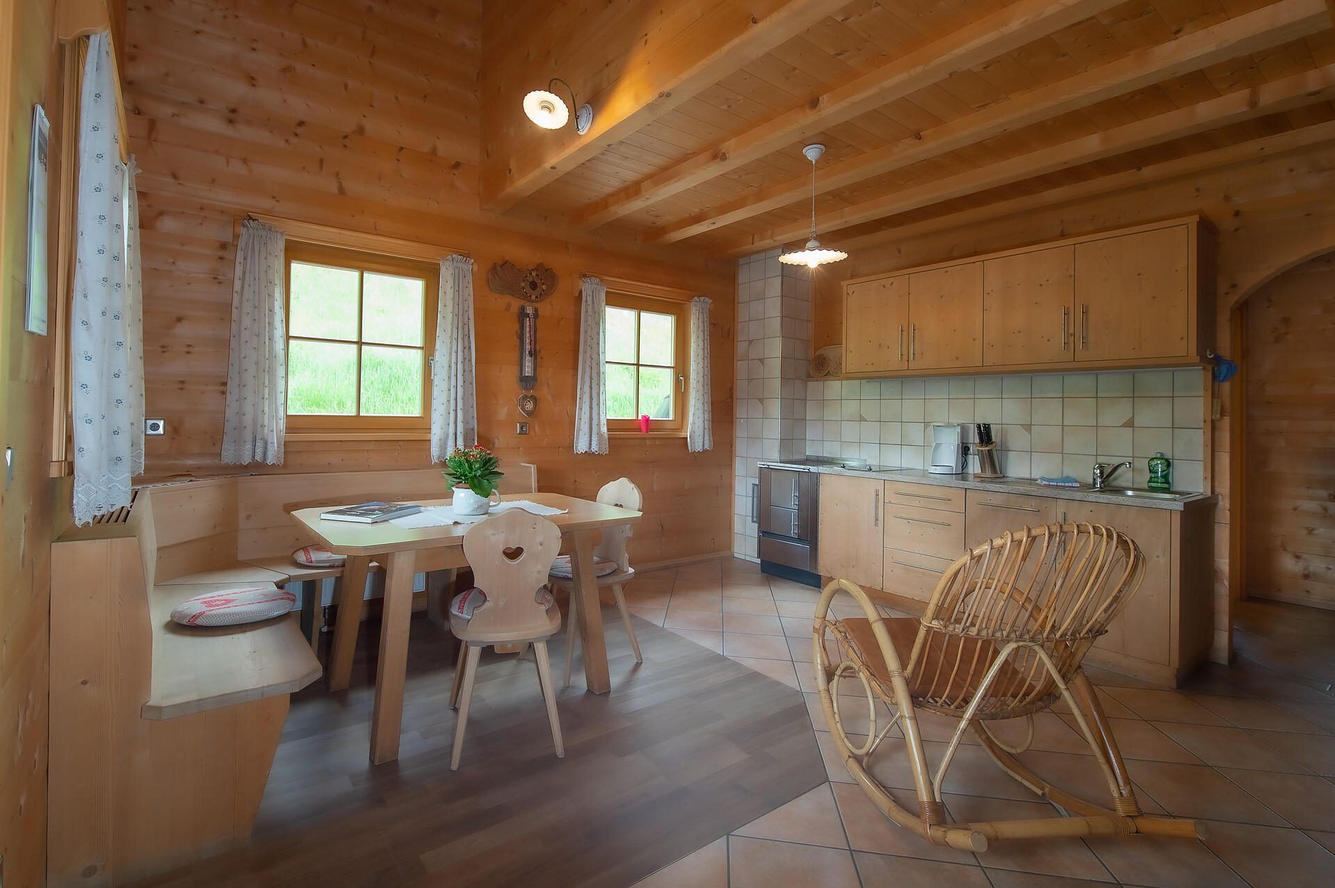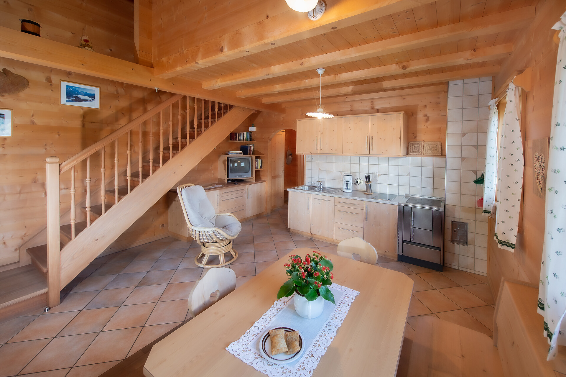 Machen Sie es sich gemütlich: Unsere zwei geräumigen Ferienwohnungen mit schöner Küche, Bad, separatem Wohn- und Schlafbereich lassen keine Wünsche offen. Über eine Treppe erreicht man das 2. geräumige Schlafzimmer im Obergeschoss. Sie sind hell und mit Holz aus dem eigenen Wald individuell eingerichtet, zudem modern ausgestattet mit Zentralheizung, Kühlschrank, Geschirrspüler sowie SAT-TV. Waschmaschine und Bügelgelegenheit finden Sie im Keller. Außerdem stehen Ihnen auf der privaten Sonnenterrasse Sonnenschirm und Liegestühle zur Verfügung – freier Blick auf die umliegende Bergwelt inklusive!
