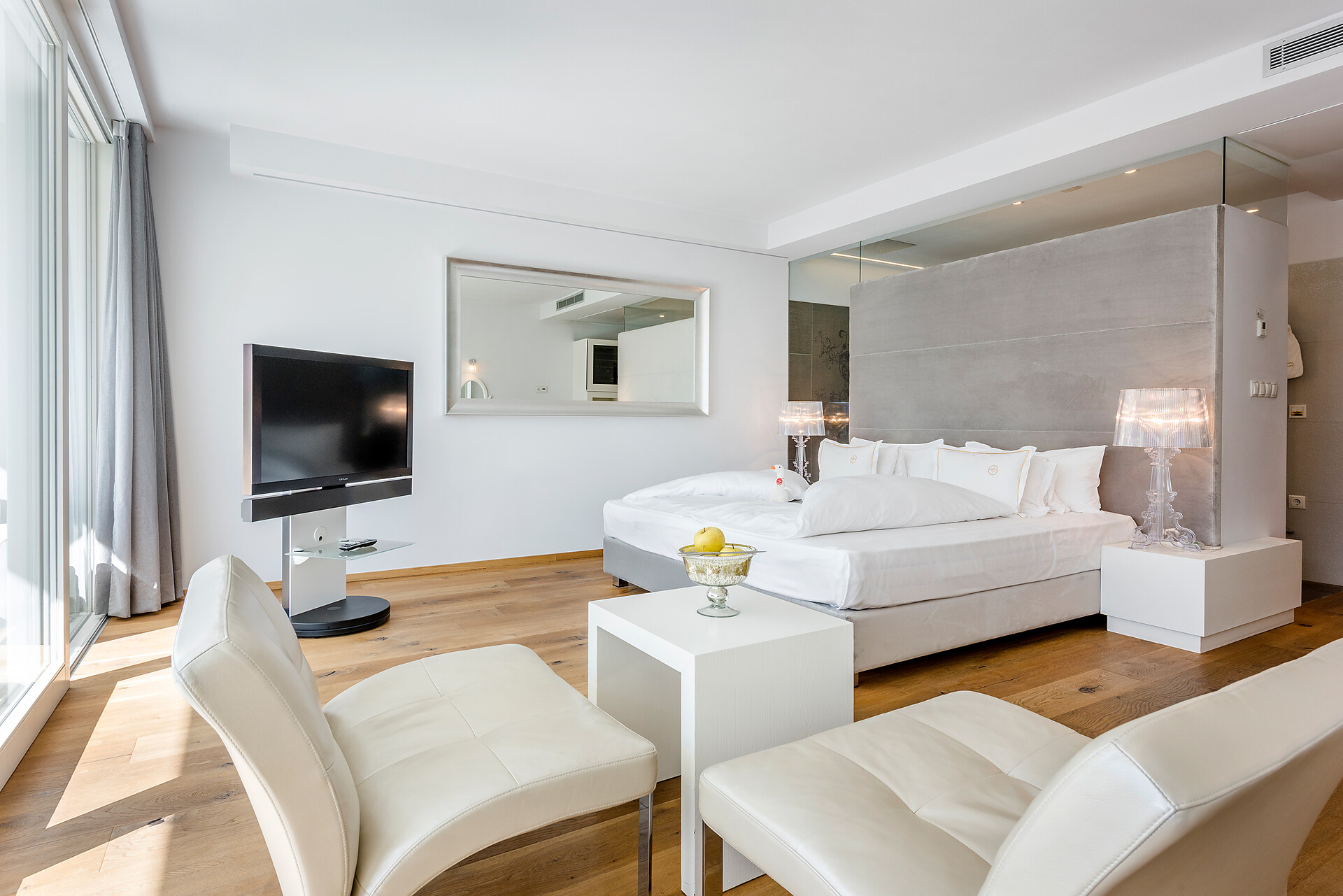 Suite, Doppelbett, Balkon, Klimaanlage, Wohnecke, Minibar, Safe, Nichtraucherzimmer, Dusche / Bad, Separates WC, Haarfön, Bademantel, TV, Satellit/Kabel, WLAN, Internetanschluss, Panoramablick, Südseite