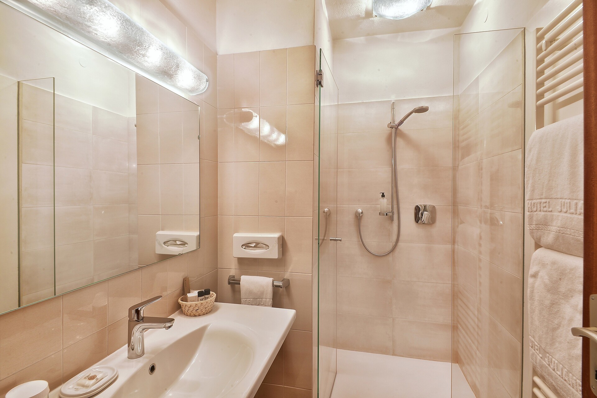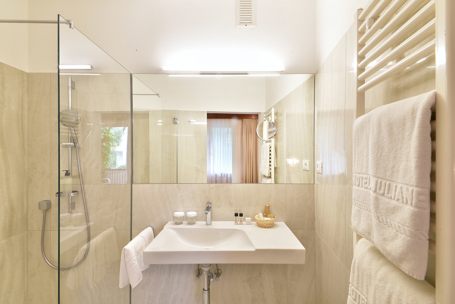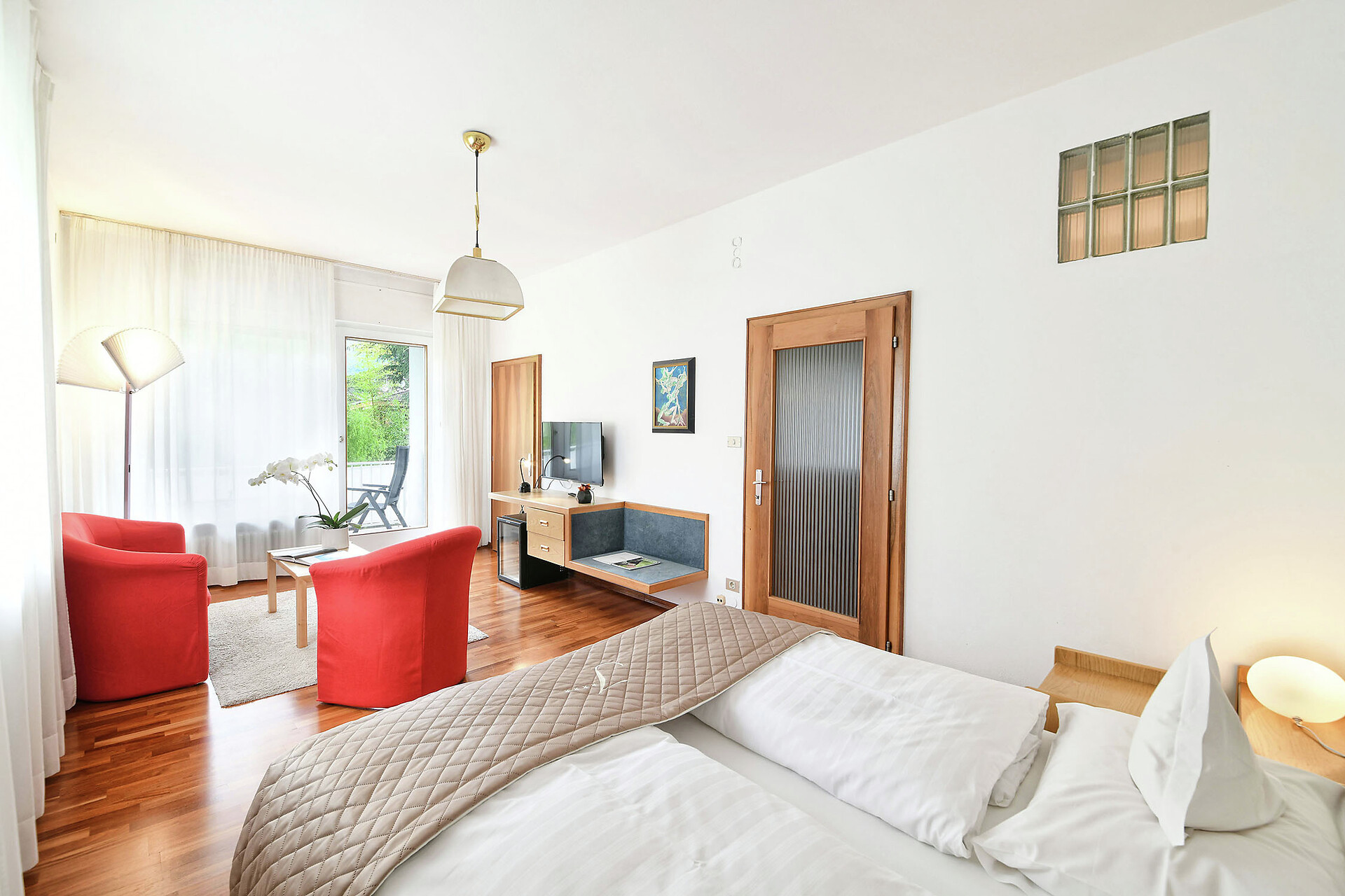 Die im Nebenhaus gelegenen, bequem über eine Terrasse erreichbaren komfortablen Doppelzimmer des Hotel Juliane **** umfassen auf 35 m² alles, was ein Appartement bieten kann. Individualität und Flexibilität wird hier großgeschrieben.Bad und Toilette sind in getrennten Räumen untergebracht. Und auf dem Südwestbalkon des Appartements können Sie die atemberaubende Landschaft der umliegenden Bergkulisse, das milde Klima Merans und die Ruhe unseres Parks genießen.