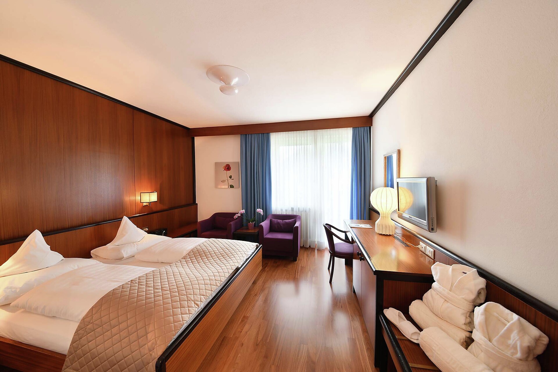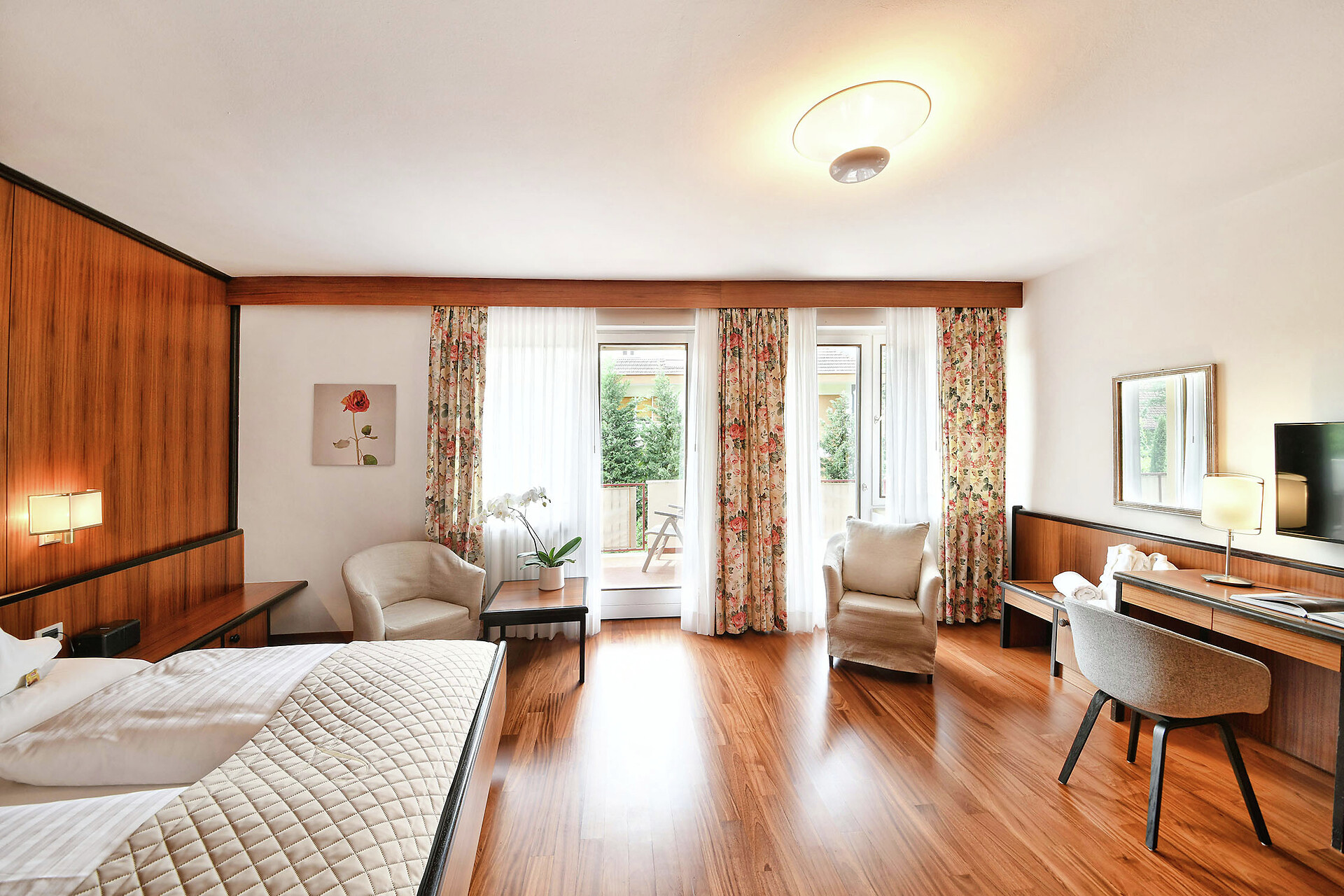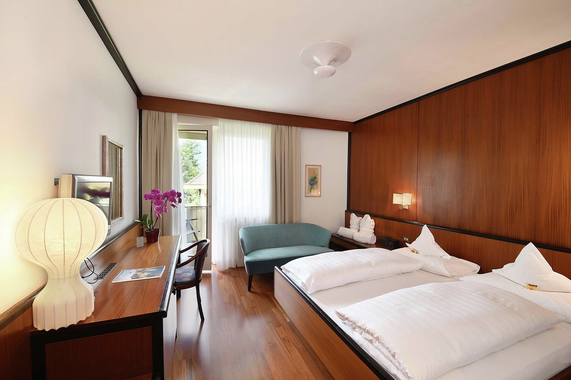 Doppelzimmer, Doppelbett, Zustellbett, Balkon, Minibar, Safe, Dusche / Bad, Separates WC, Bidet, Haarfön, Bademantel, TV, WLAN, Dependance, Panoramablick, Südseite