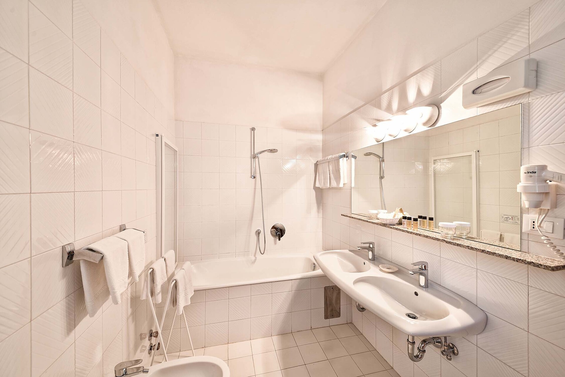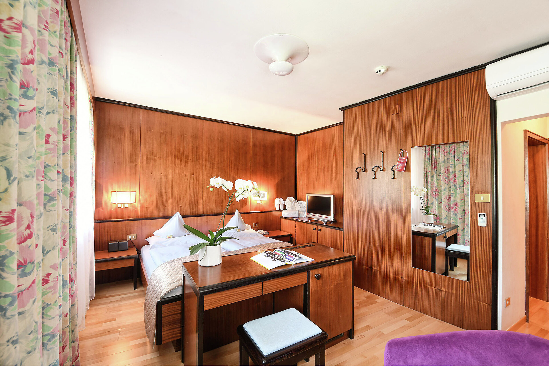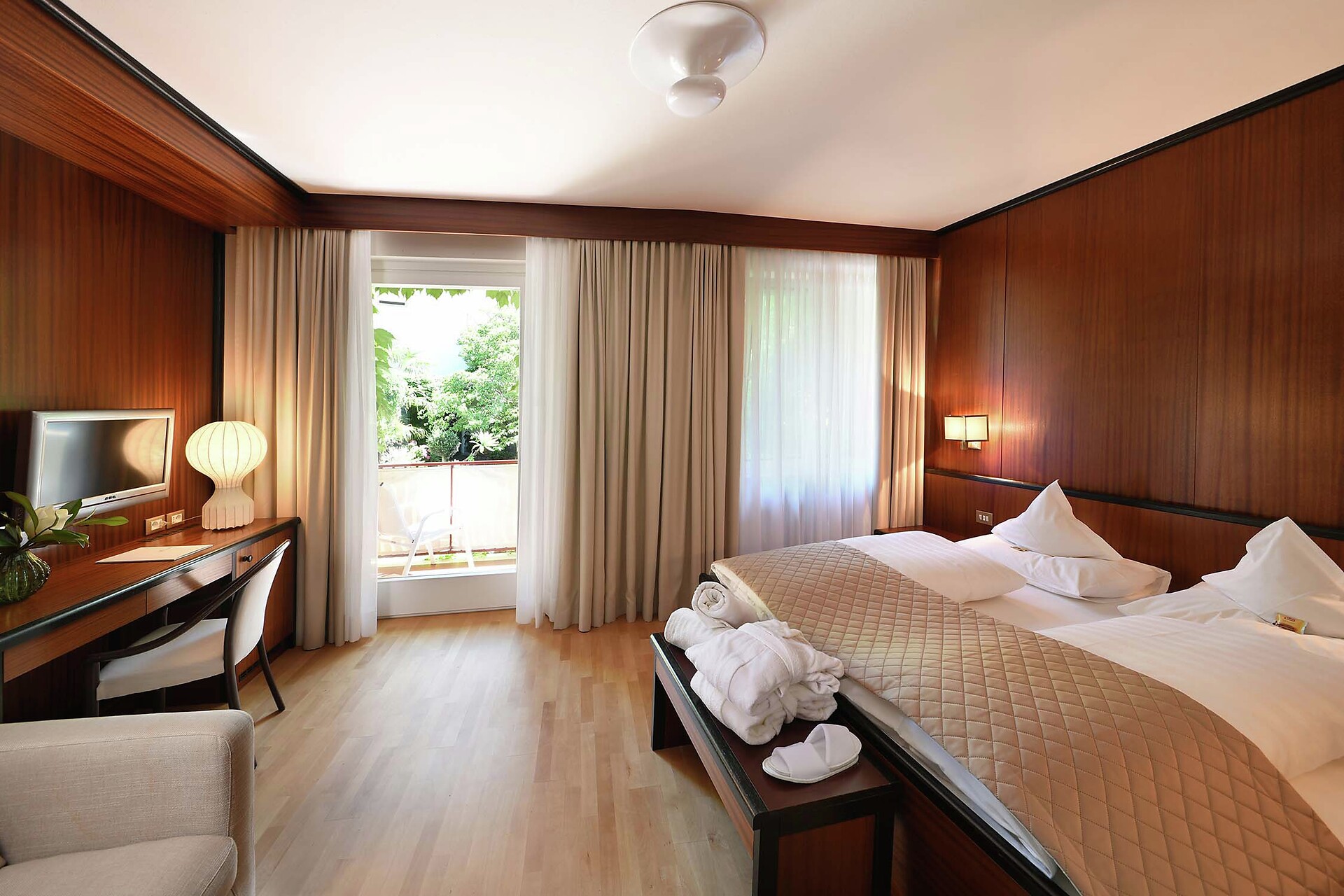 Doppelzimmer, Doppelbett, Zustellbett, Balkon, Minibar, Safe, Dusche / Bad, Separates WC, Bidet, Haarfön, Bademantel, TV, WLAN, Dependance, Panoramablick, Südseite