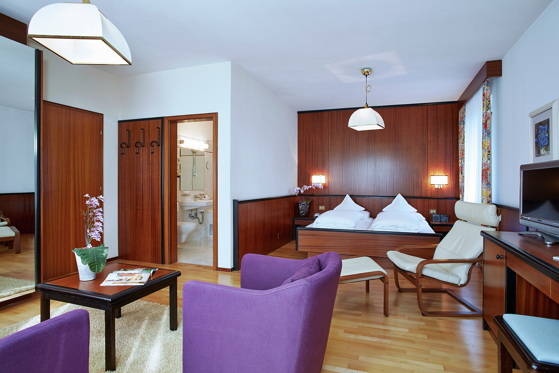 Doppelzimmer, Suite, Doppelbett, Zustellbett, Babybett, Bettsofa, Balkon, Klimaanlage, Barrierefrei, Minibar, Safe, Dusche / Bad, Bidet, Haarfön, Bademantel, TV, WLAN, Haupthaus, Panoramablick, Südseite