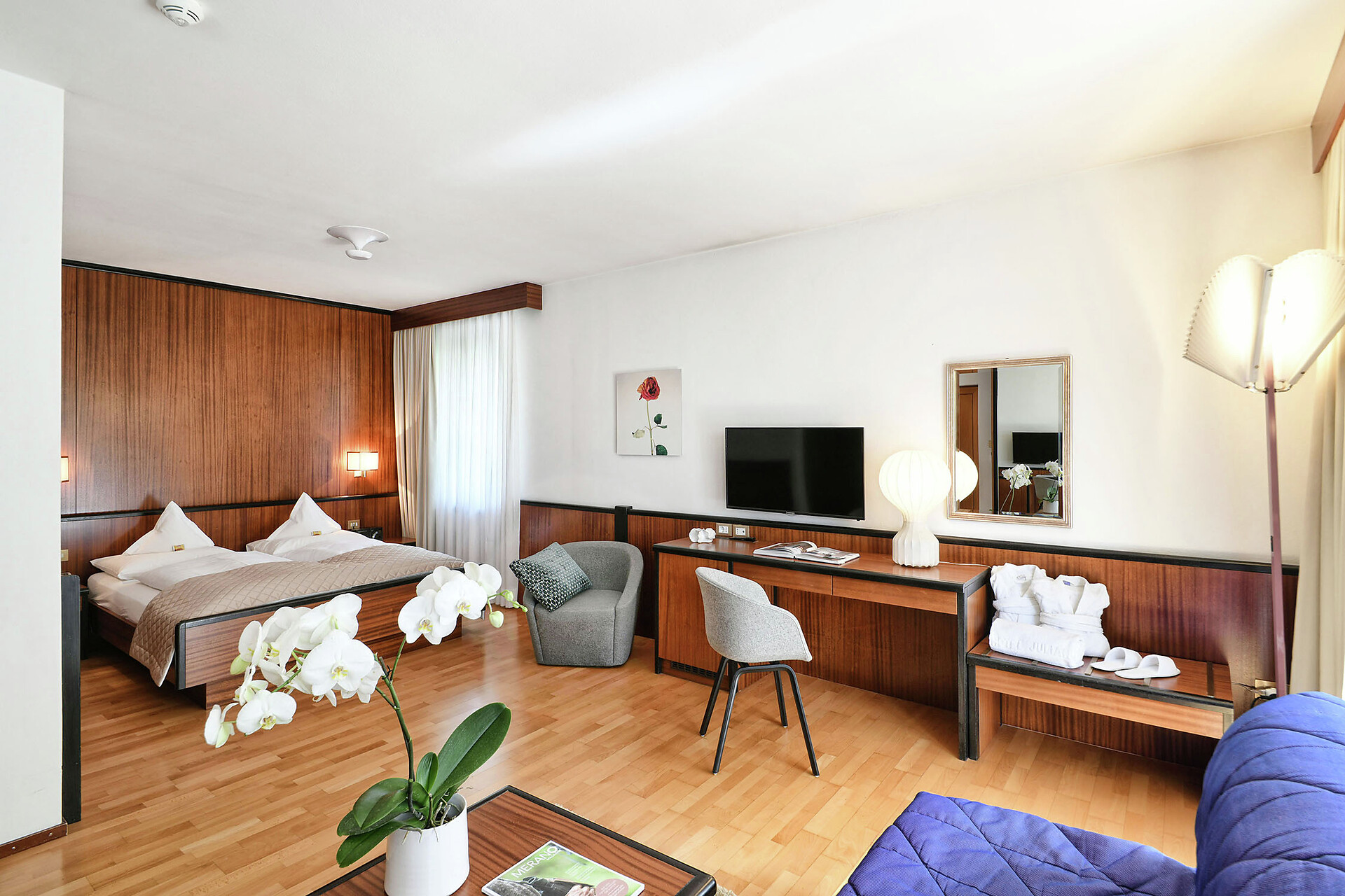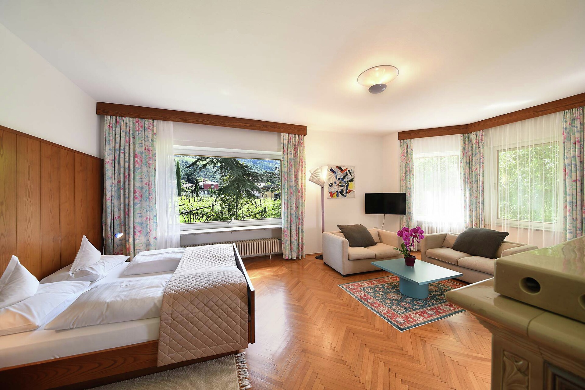 Die großen Superior Familienzimmer mit 36 m² bieten viel Platz zum Verweilen. Das Doppelbett ist in einer Nische untergebracht, sodass der Wohnbereich als eigener Raum wahrgenommen wird. Die Bäder sind großzügig und verfügen über eine Badewanne oder eine Dusche. Mit Holz-Parkett Böden ausgestattet bieten diese Zimmer Ausblicke nach zwei Gartenseiten und einen angenehm großen Balkon mit Blick auf unsere herrliche Parkanlage mit Pinien, Magnolien, dem Freibad und unserem hauseigenen Weinberg, in dem Vernatsch und Merlot Trauben wachsen. Das alles ist umrahmt von den Spitzen der Ultner Berge im Hintergrund.