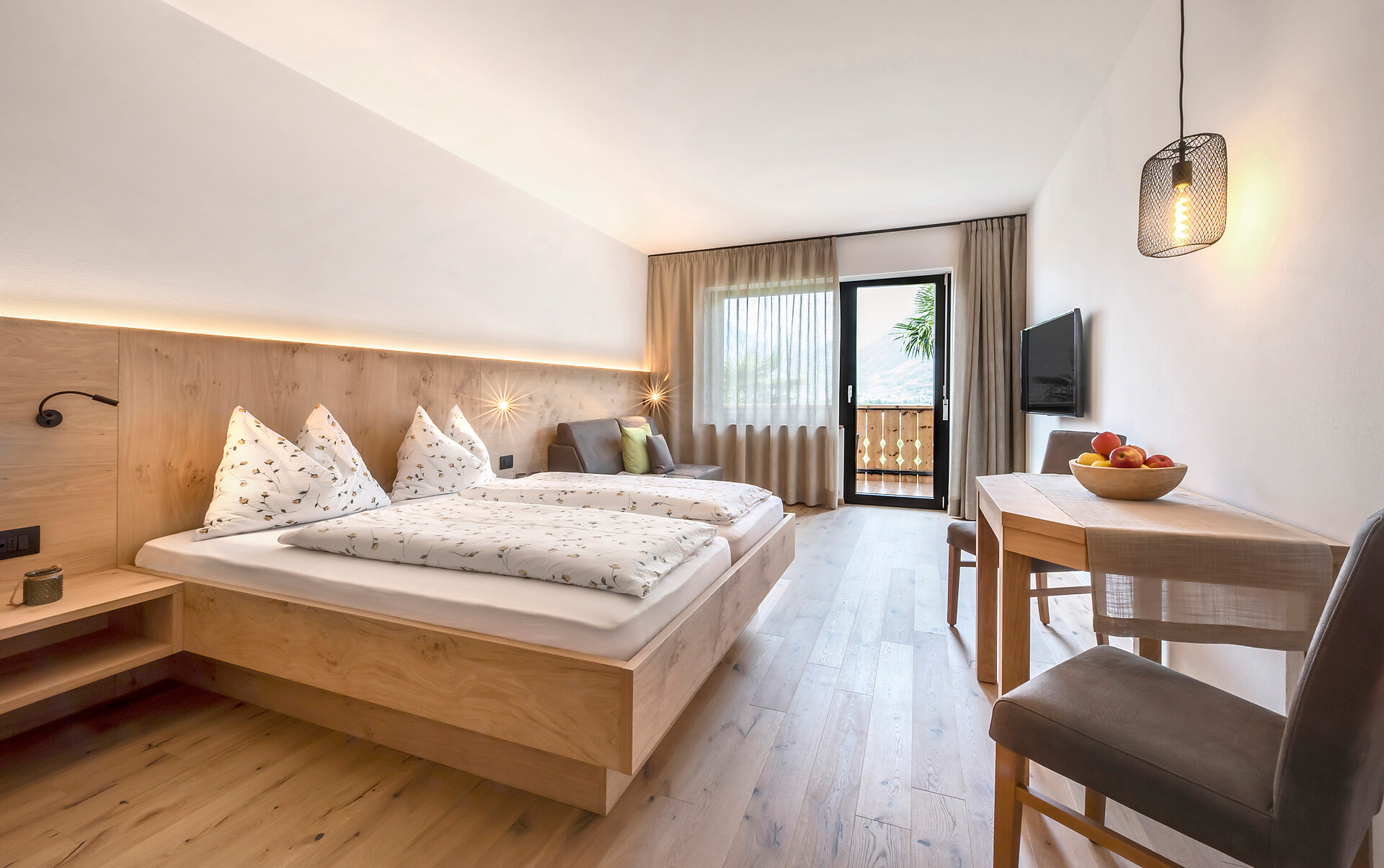 Doppelzimmer, Doppelbett, Bettsofa, Terrasse, Wohnecke, Kochgelegenheit, Barrierefrei, Safe, Kaffee-/Tee-Maschine, Nichtraucherzimmer, Dusche / Bad, Haarfön, TV, Satellit/Kabel, WLAN, Dependance, Südseite