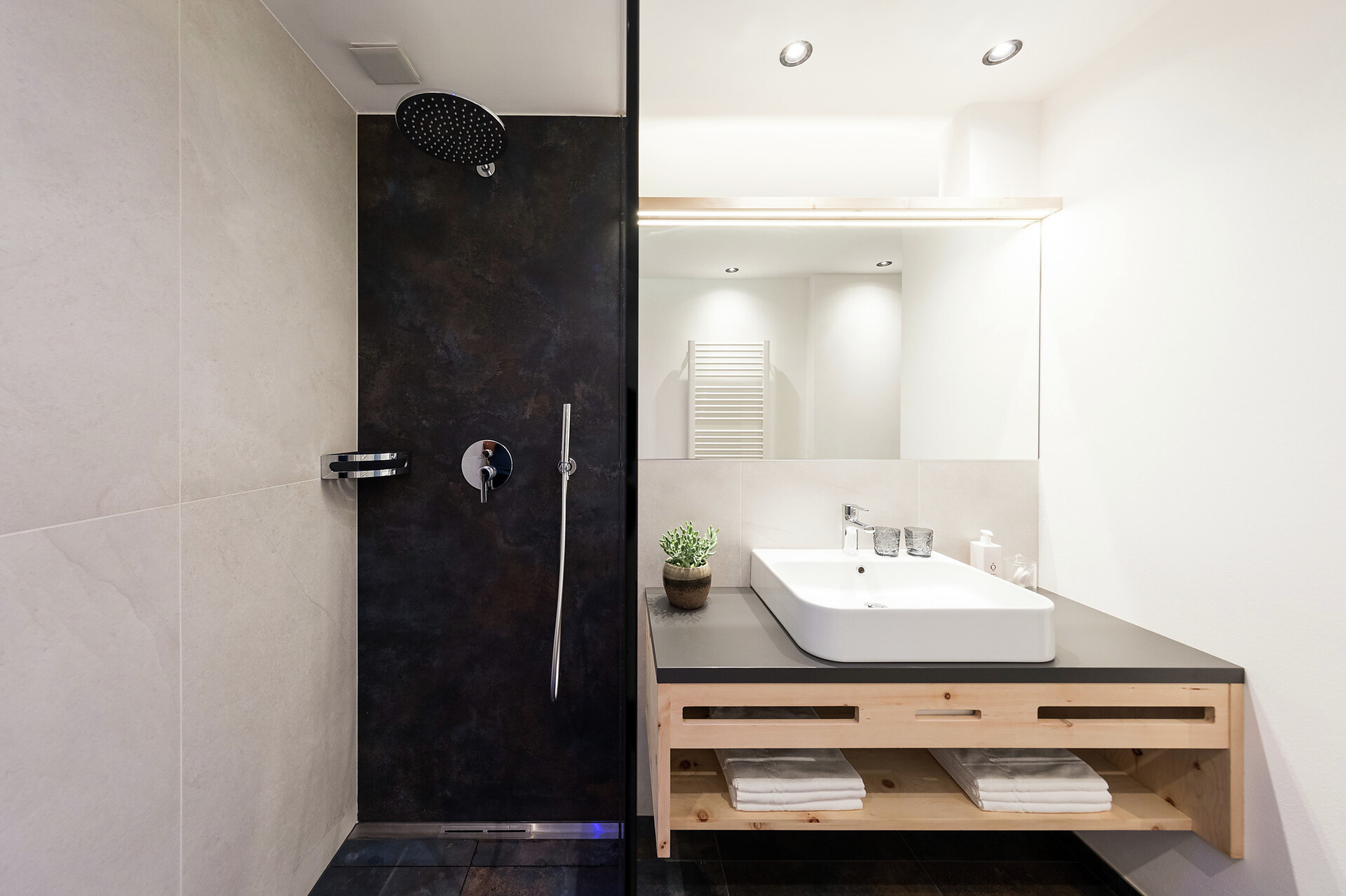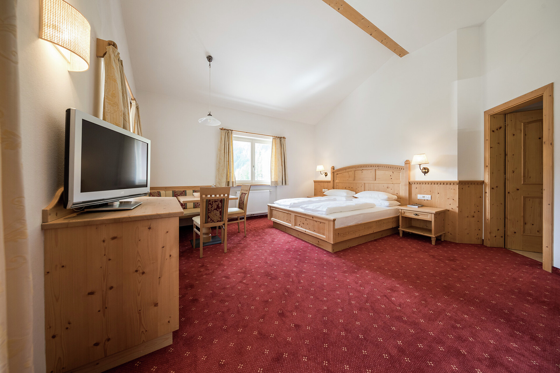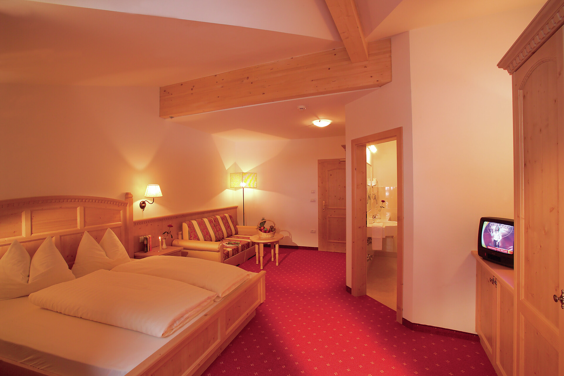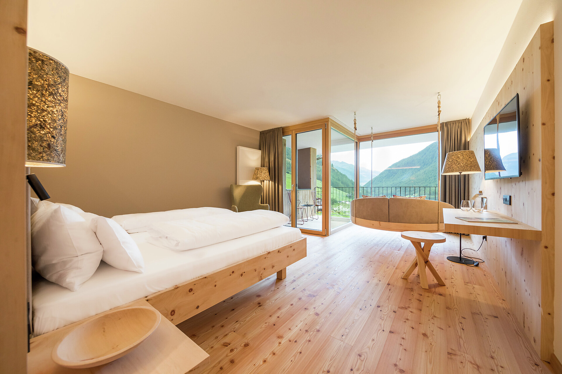 30 qm. Draußen der Wald, drinnen der Wald. Das LARIX ist ein Rund-um-Lärchenzimmer mit naturbelassenem Lärchenholzboden, Lärchenholzdecke und Balkon mit Blick zum Lärchenwald. Das Zimmer ist ausgestattet mit einem Schlaf-Wohnbereich, Sat-TV, einem Bad mit WC, Badewanne, Bidet und Pflegeset, sowie mit einem Wanderrucksack und einem Wellnesskorb mit Badetüchern und Bademantel.