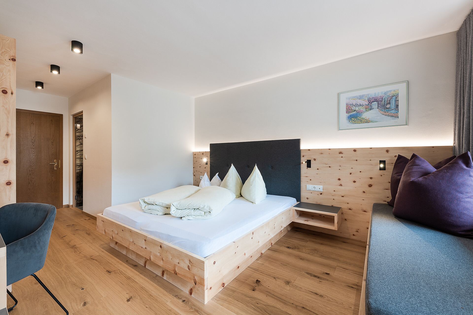 Zweibettzimmer, Doppelzimmer, Mehrbettzimmer, Doppelbett, Zustellbett, Babybett, Balkon, Terrasse, Zimmer mit Verbindungstür, Safe, Dusche / Bad, Bidet, Haarfön, TV, Satellit/Kabel, WLAN, Haupthaus, Panoramablick, Südseite
