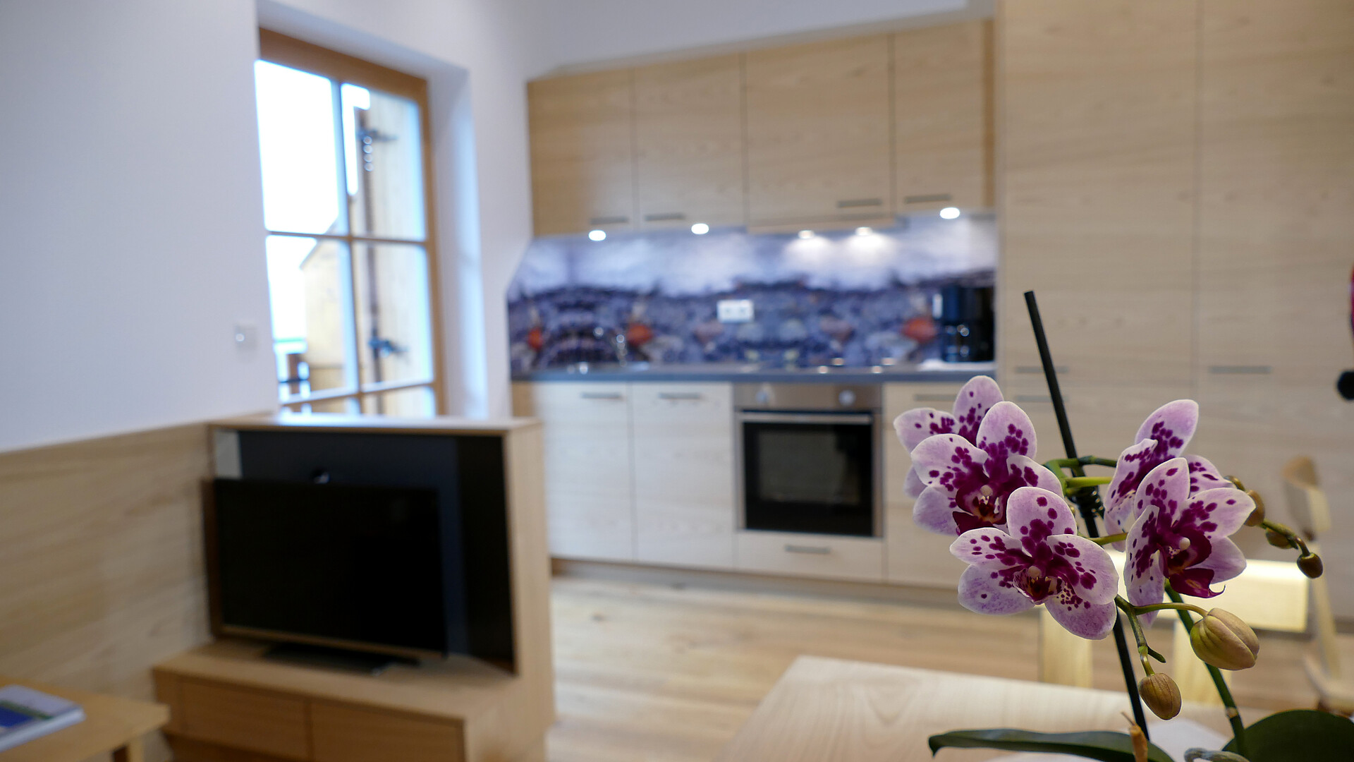 Einzelbett, Doppelbett, Doppelschlafcouch, Balkon, Separater Wohnraum, Bettwäsche vorhanden, Nichtraucher-Apartment, Wohnküche, Kaffeemaschine, Geschirrspülmaschine, Geschirrausstattung, Kochfeld, Backrohr, Dusche/Bad, Badetücher, TV, Satellit/Kabel, Reinigung auf Anfrage, Endreinigung inbegriffen, Haupthaus, Panoramablick, Südseite