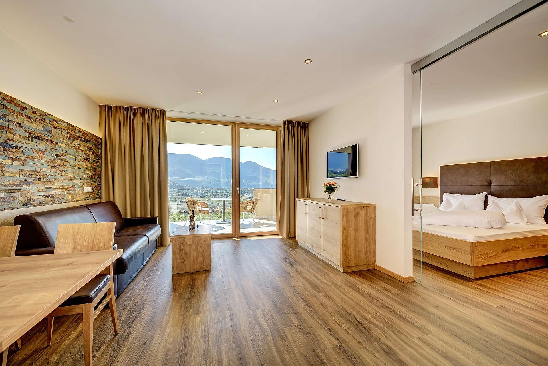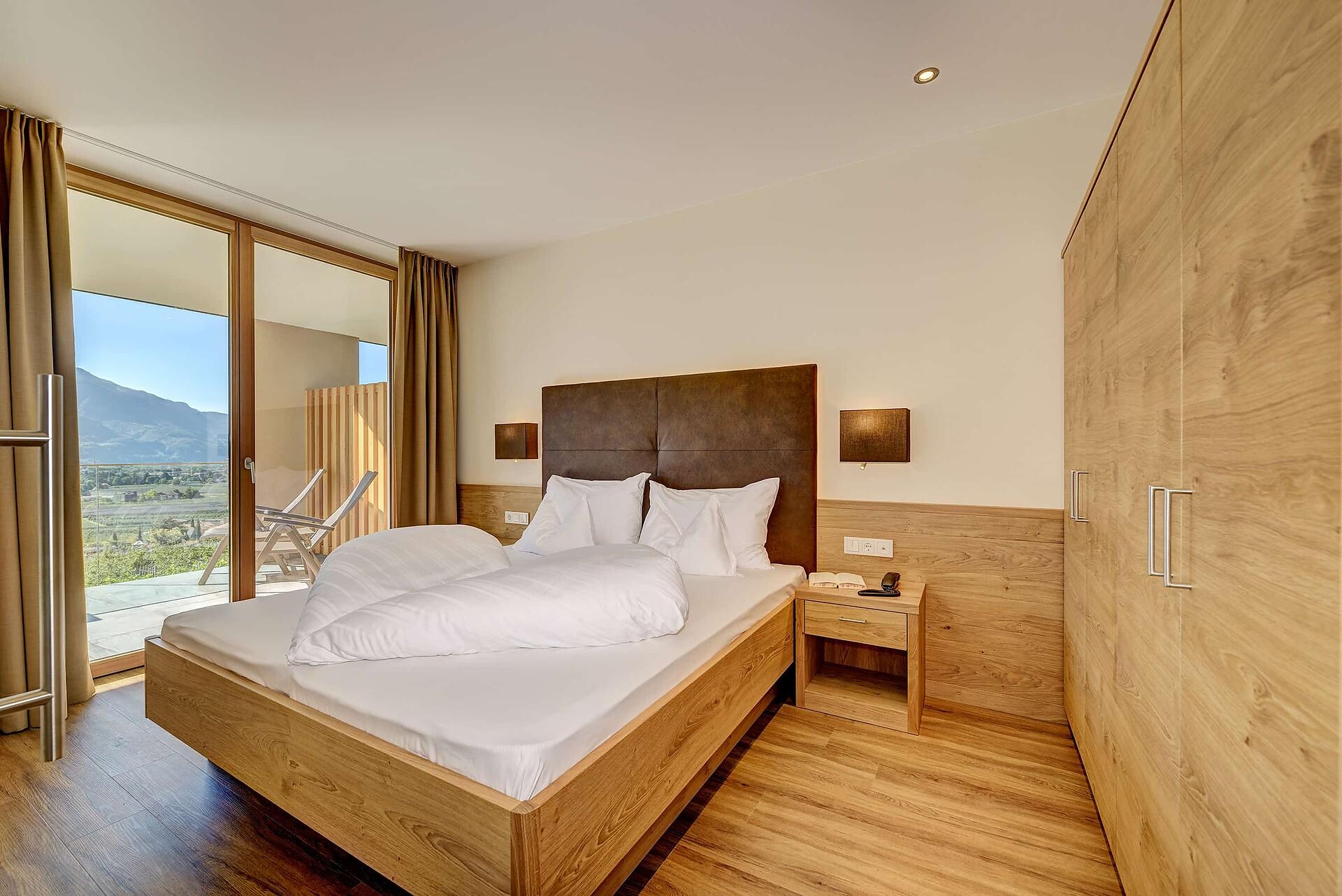 Unsere großzügigen Apartments und Suiten liegen in vollkommen ruhiger Lage, umgeben von eigenen Obst- und Weingärten, im Ortsteil Dorf, circa 15 Gehminuten vom Zentrum und drei Kilometer von der Kurstadt Meran entfernt.