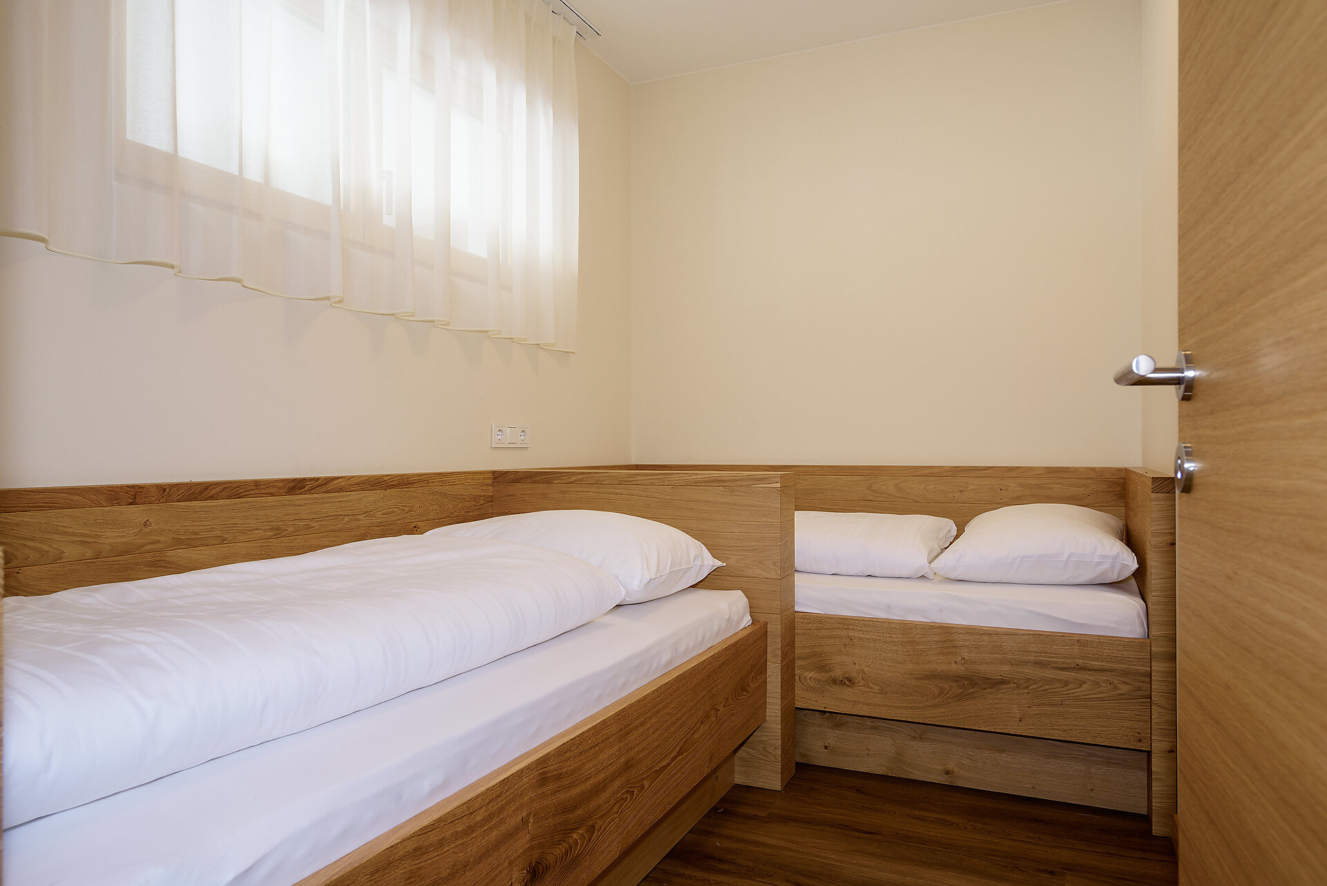 Unsere geräumige Familien-Ferienwohnung erstreckt sich über großzügige 57 m² und umfasst eine voll ausgestattete Küche, einen Wohnbereich mit einer komfortablen Schlafcouch und einem Flachbildfernseher mit Sat-TV. Des Weiteren bietet sie ein gemütliches Doppelzimmer sowie ein kleines Schlafzimmer mit zwei Einzelbetten, ein Badezimmer mit Dusche und separatem WC. Die edle Einrichtung und die warmen Naturtöne sorgen für Wohlbefinden und eine Atmosphäre zum Entspannen und Erholen.