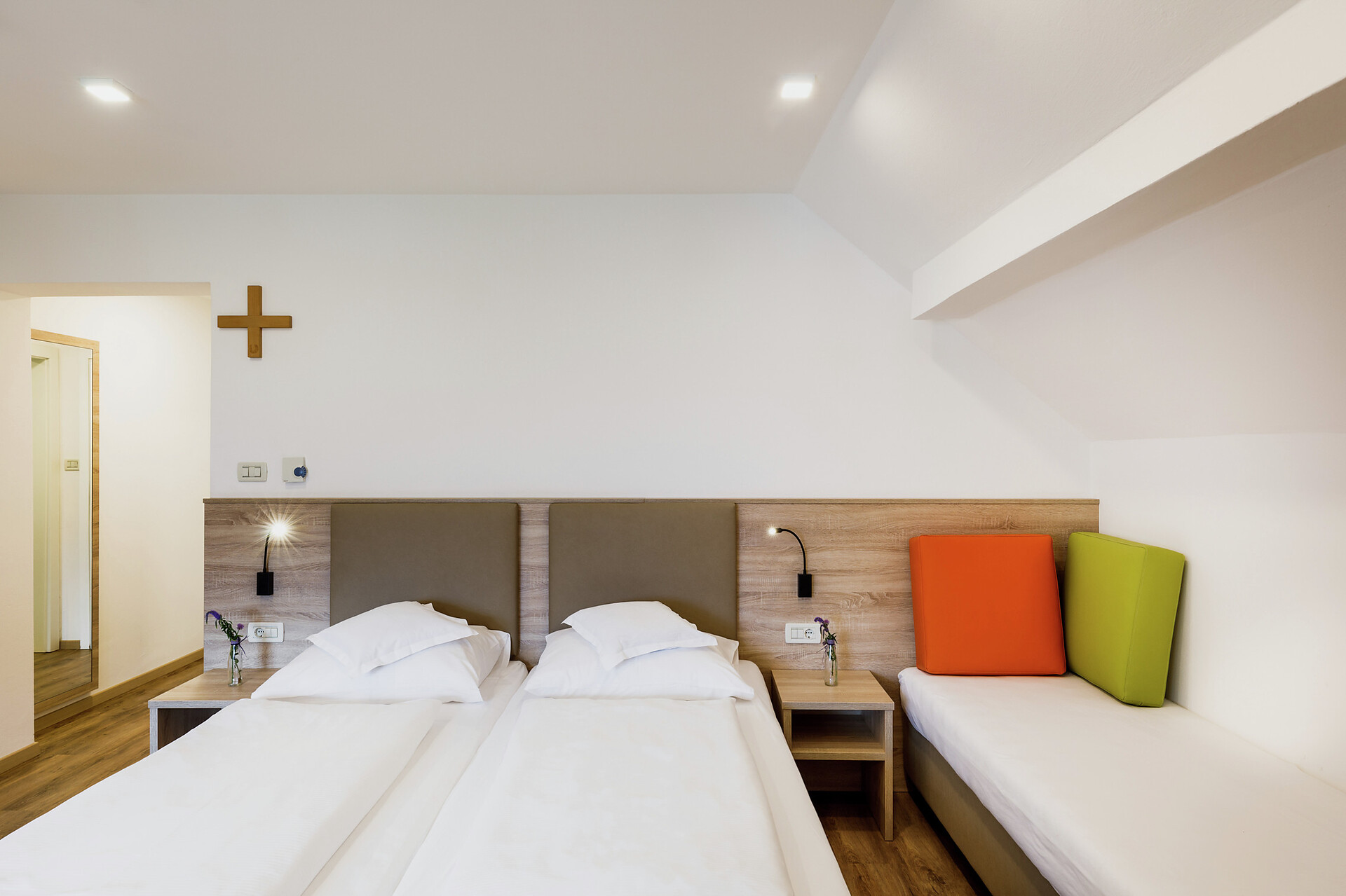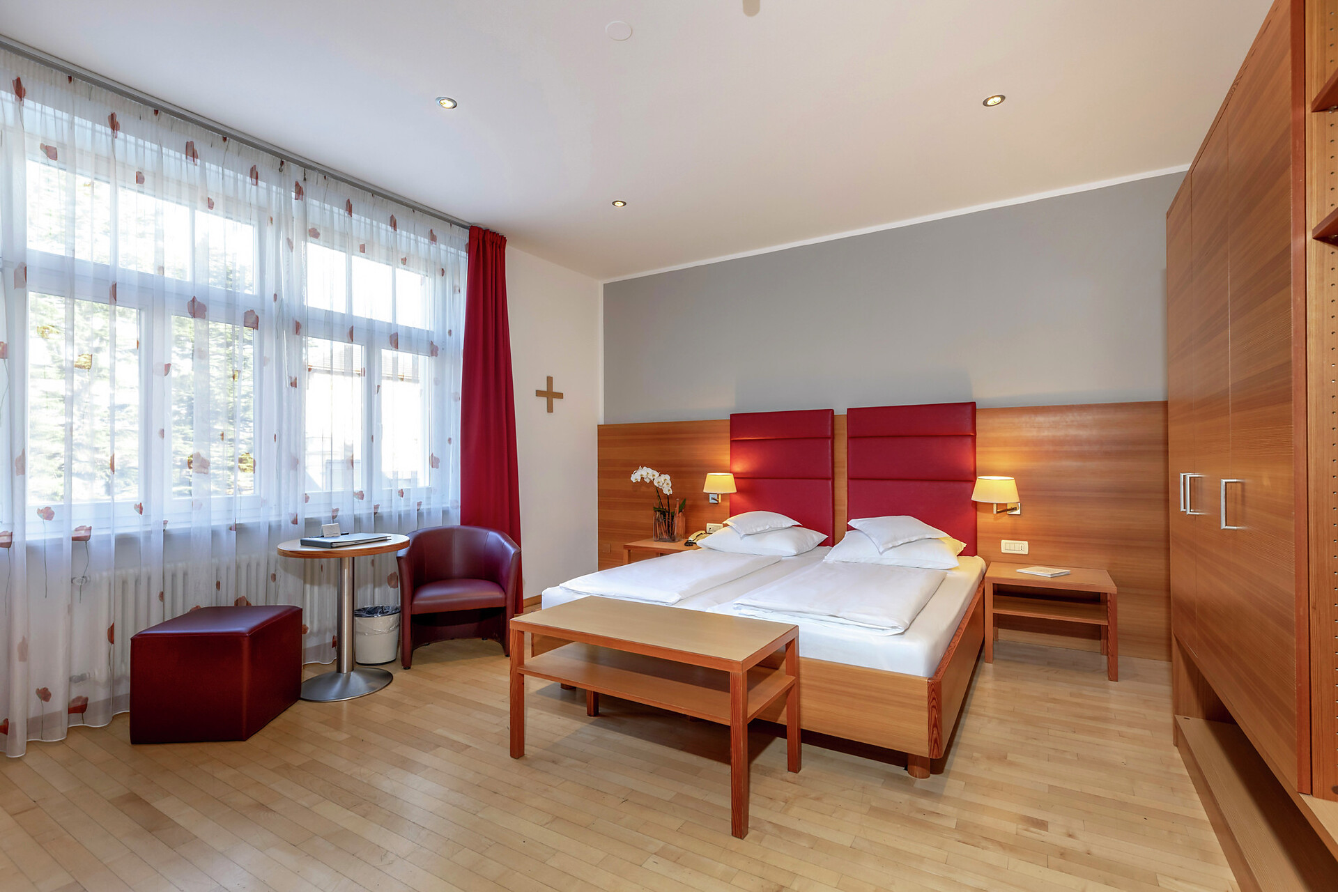 Die Gästezimmer liegen durchwegs auf der sonnigen Südseite und sind mit Dusche, WC, Fön, W-LAN, Telefon und TV ausgestattet. Das Hotel verfügt außerdem über ein Freibad, Aufenthalts- und Seminarräume, über ein Café & Bistro und eine Hauskapelle einem neuen SPA-Bereich mit finnischer Sauna, Dampfsauna, Whrilpool Eisbrunnen und Ruheräumen sowie einer Dachterrasse mit Ausblick.