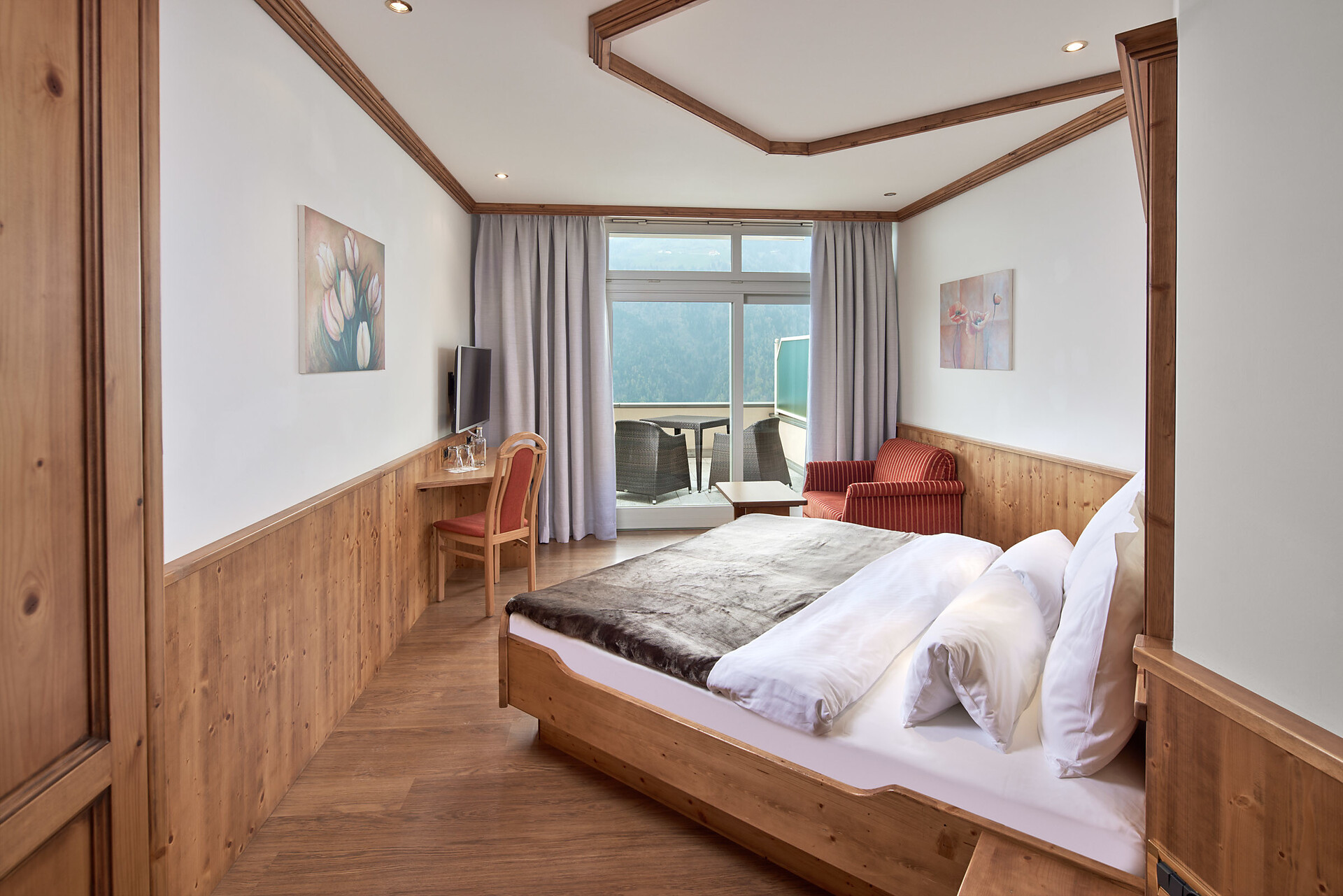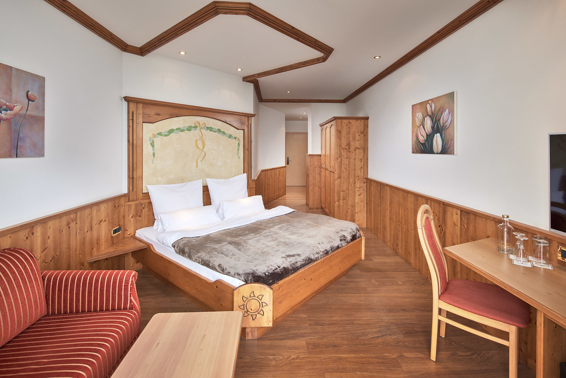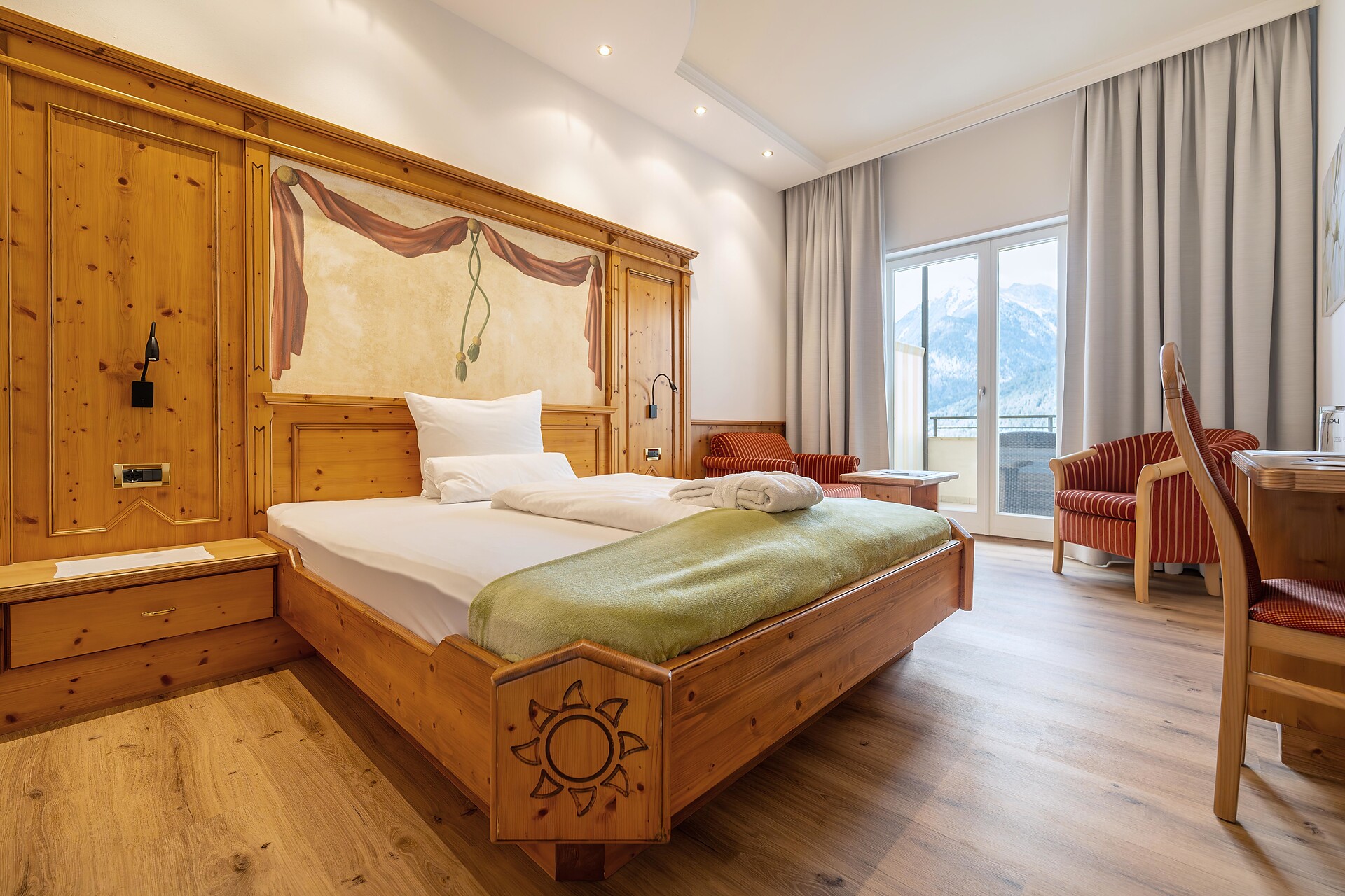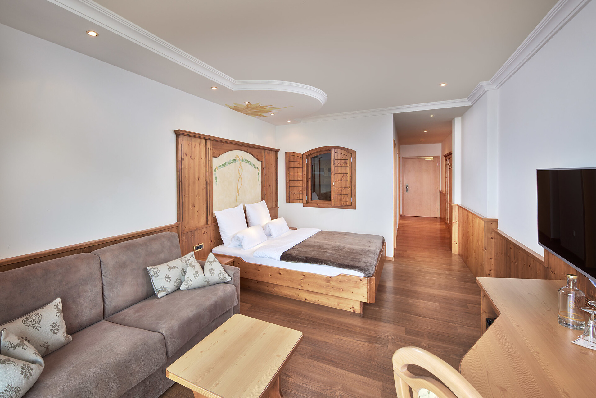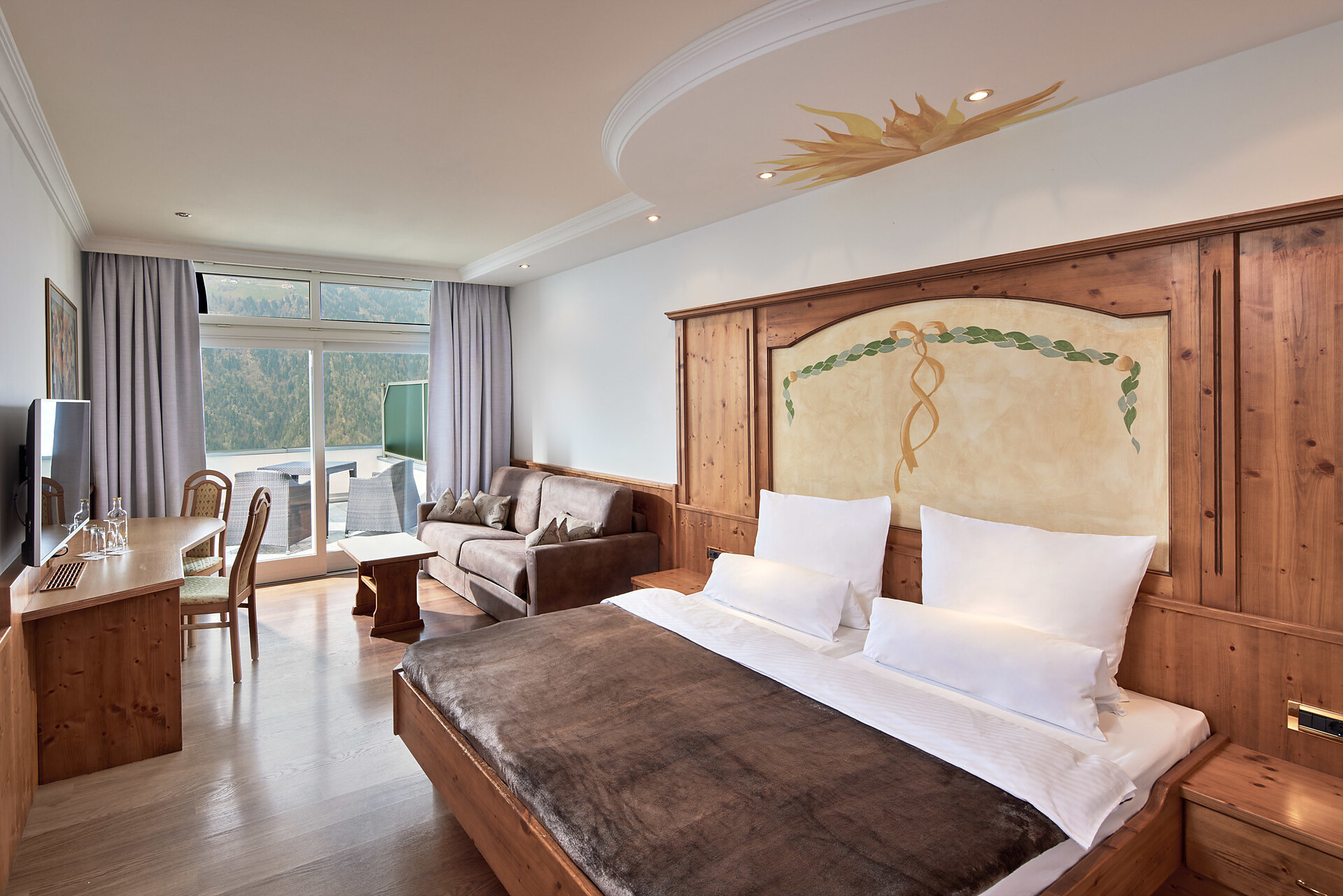 Suite "Sonnentraum Wellness & Spa" (ca. 36m²), nichtraucher, im alpinen Style eingerichtet, mit elegantem Altholz, Schlaf-Wohnraum, große Fensterfront zur Südseite, mit traumhaftem Ausblick, klimatisiert, Physiotherm Infrarotkabine, Bad, Dusche, Badewanne, getrenntes WC & Bidet, Kosmetikspiegel, Haarfoen, Flachbild-SAT-TV, Frigobar, WLAN, Tel, Safe, Südbalkon mit Sitzgarnitur, Dachgarten mit Liegen, Finnische Panoramasauna und exklusivem Whirlpool (der Whirlpool ist von 09.00 Uhr bis 22.00 Uhr nutzbar). Hunde nicht erlaubt. Tiefgaragenstellplatz inklusive.