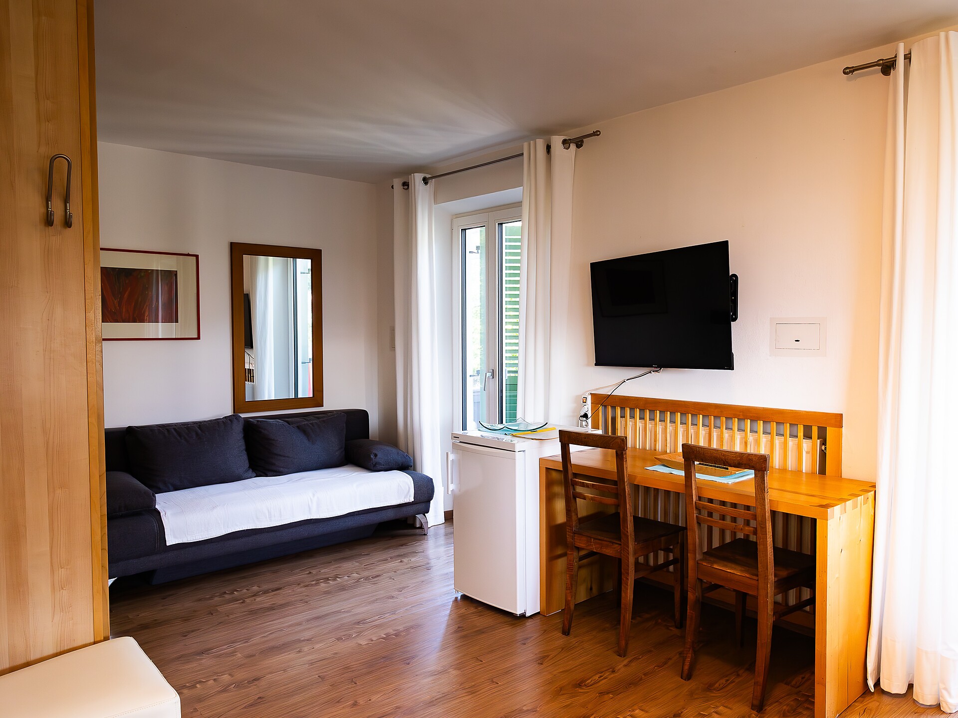 Die 2-Zimmer-Ferienwohnungen befinden sich im 1. und 2. Stock. Für 2 - 4 Personen geeignet. Schlafzimmer mit Doppelbett und Safe. Kleine Diele. Separate Dusche/ WC mit Fenster. Das Wohnzimmer ist mit Eckbank, TV-Gerät, Radio, und Schlafsofa eingerichtet. Südbalkon. Die im Wohnzimmer befindliche Einbau-Küche ist komplett mit Kühlschrank, Herd, Kaffeemaschine und Geschirr ausgestattet.
