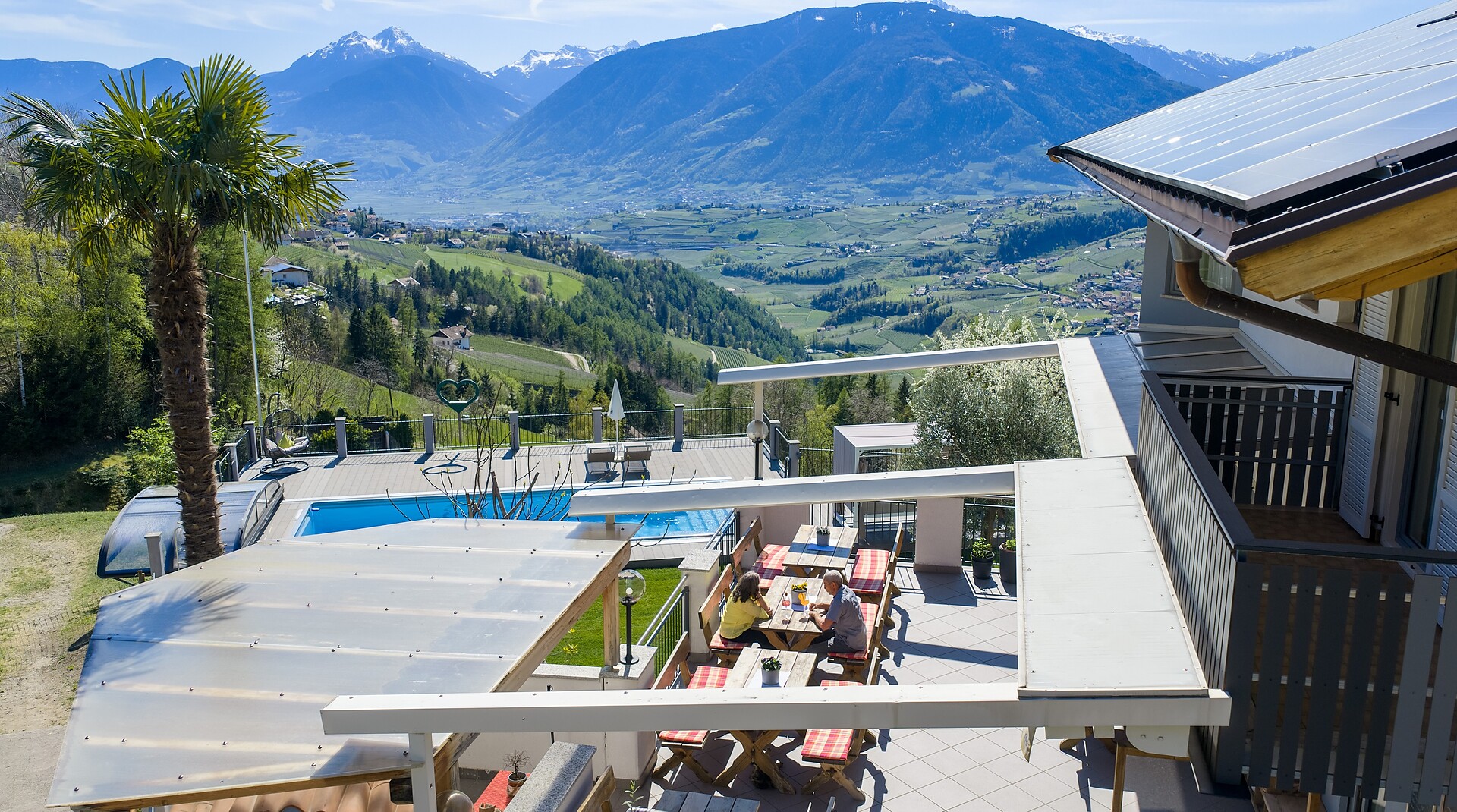 Verbringen Sie gemütliche Stunden auf unserer Panorama-Terrasse mit einem "Guten Tropfen" oder einem "Bier" begleitet mit schmackhaften Südtiroler Spezialitäten. Große Liegewiese mit beheiztem Freibad, Kinderspielplatz, großer Parkplatz am Hause.