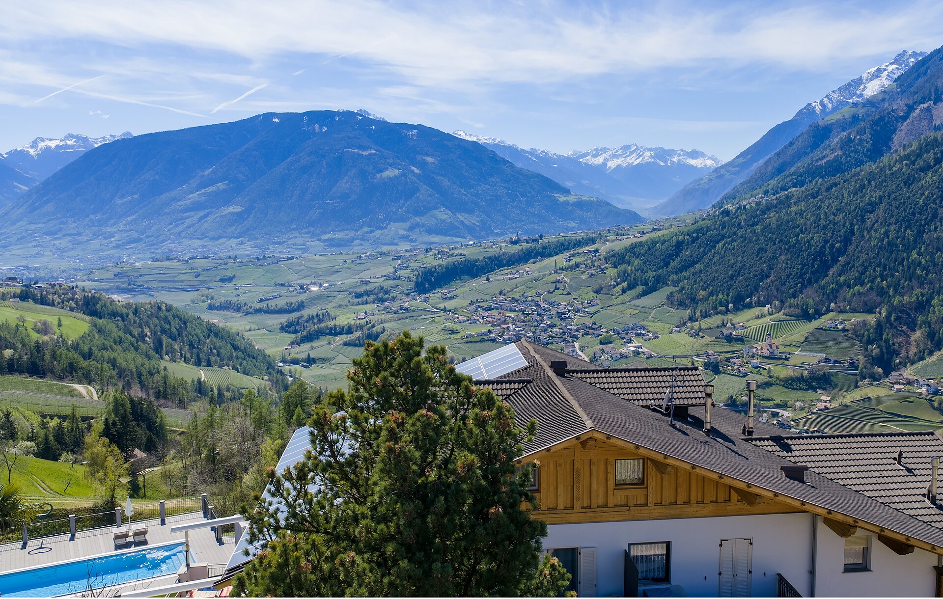 Blick über den Meraner Talkessel und das gesamte Burggrafenamt bis tief in den Vischgau zum Ortler u. Texelgruppe.