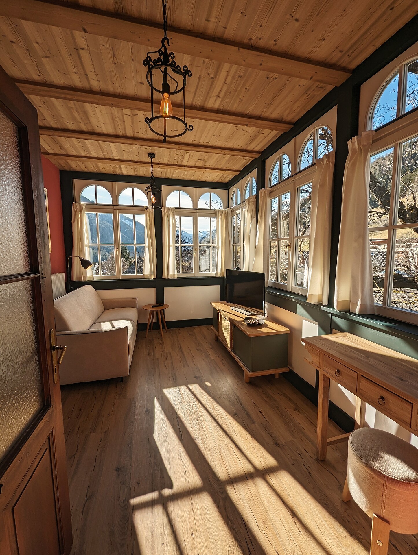 Wohnen im Jahrhunderwendeflair. Die frisch renovierte Ferienwohnung bietet dem Gast vollen Komfort und gemütliche Ecken zum Entspannen. Nimmer müde wird man von der Aussicht auf der Veranda.