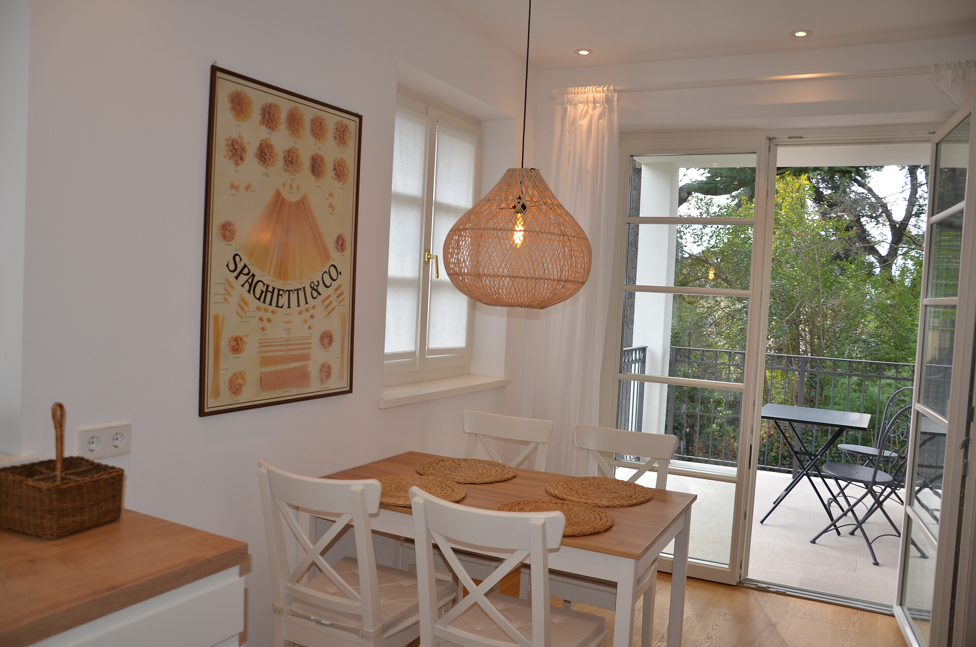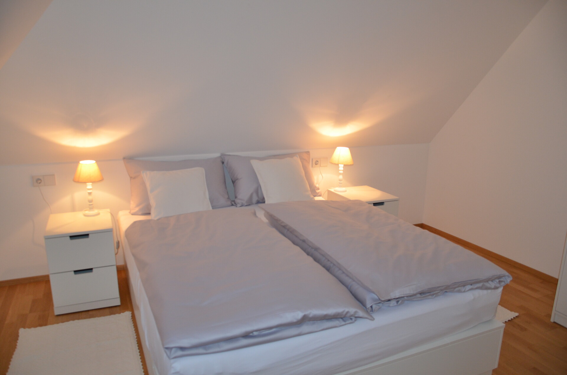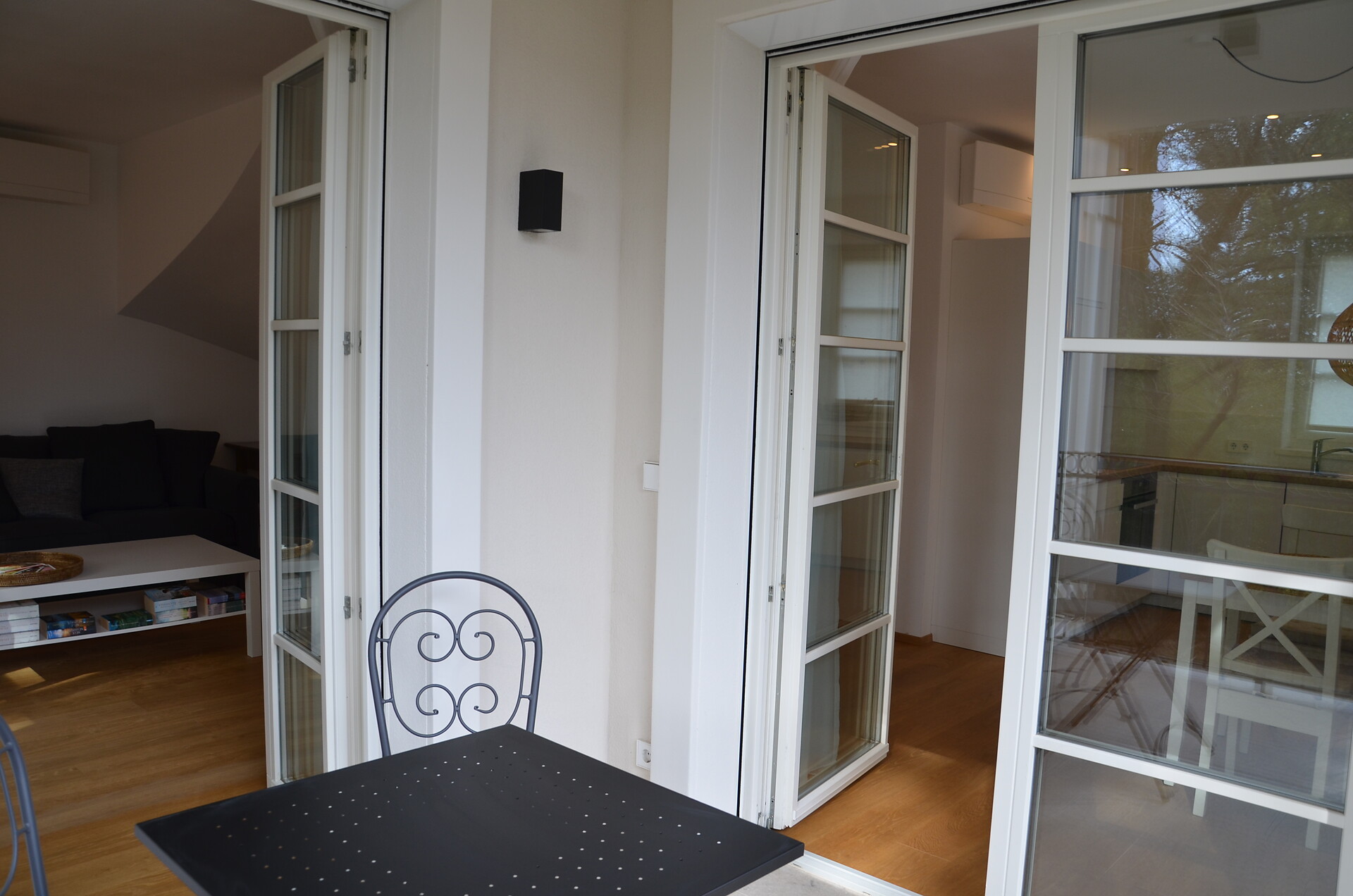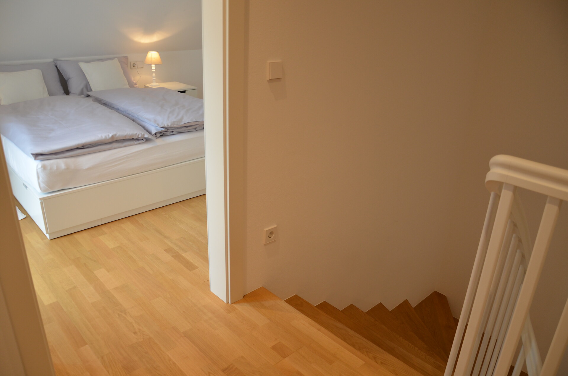 Das Apartment befindet sich im ersten Stock und ist über eine Außentreppe zu erreichen. Im ersten Stock finden Sie eine gut ausgestattete Küche, ein geräumiges Wohnzimmer mit einem gemütlichen Balkon sowie ein WC vor. Eine Holztreppe führt Sie zu den beiden behaglichen Schlafzimmern, die ebenfalls über einen Balkon verfügen und zu einem Badezimmer. Eines der Zimmer ist mit einem Bürotisch ausgestattet, um Ihren Aufenthalt so produktiv wie möglich zu gestalten.