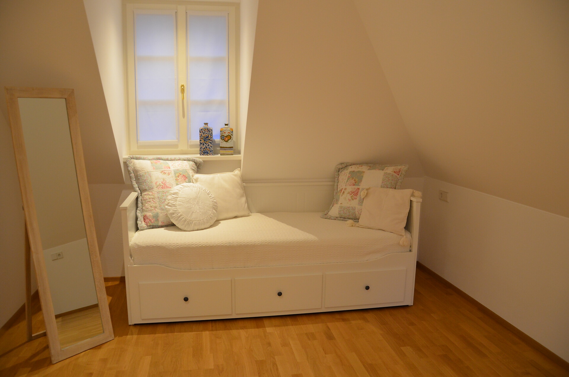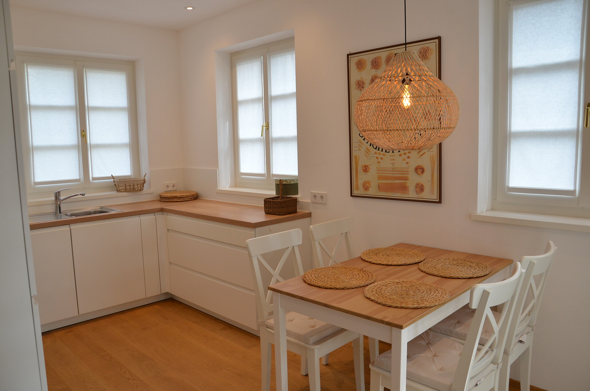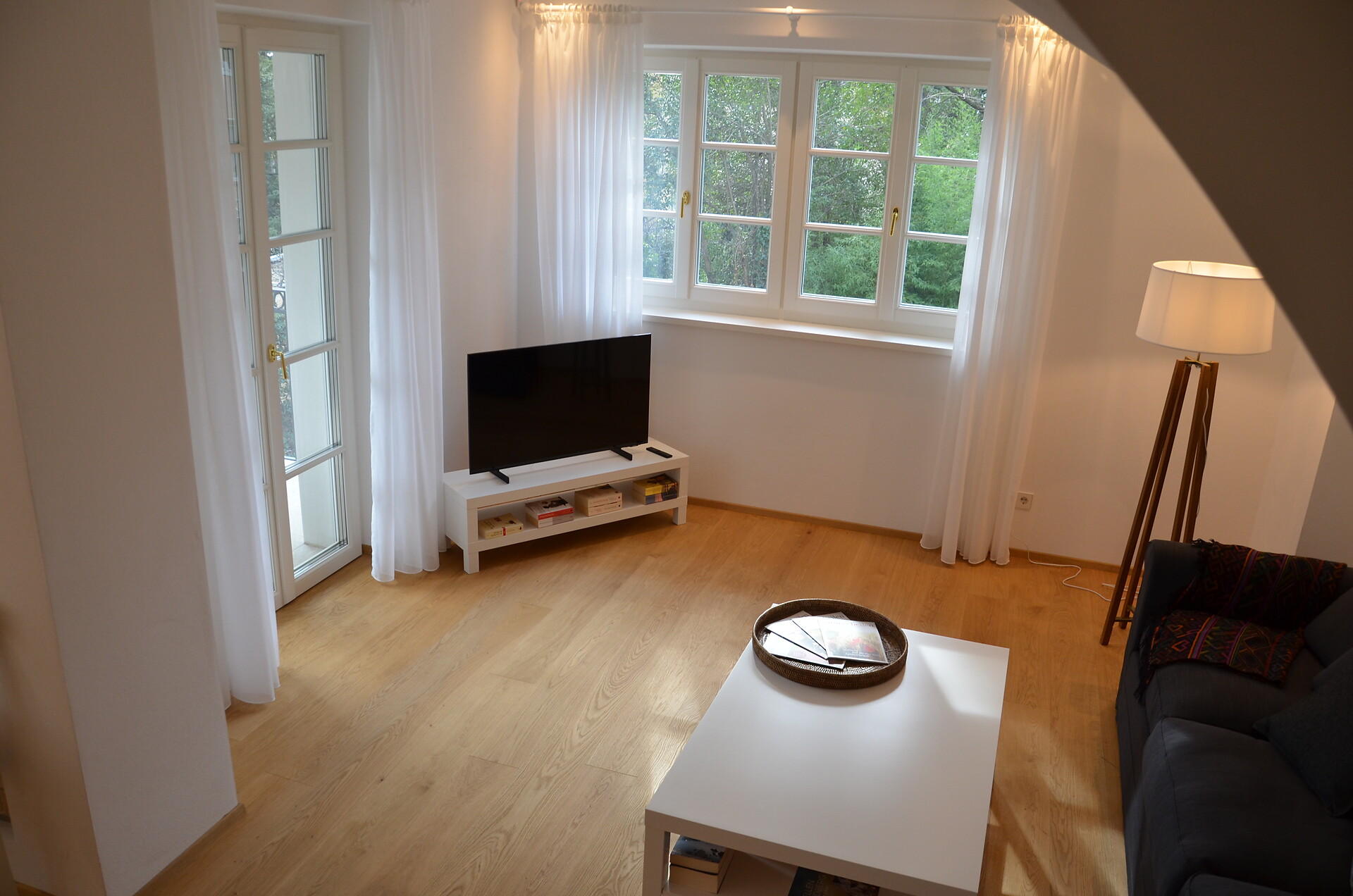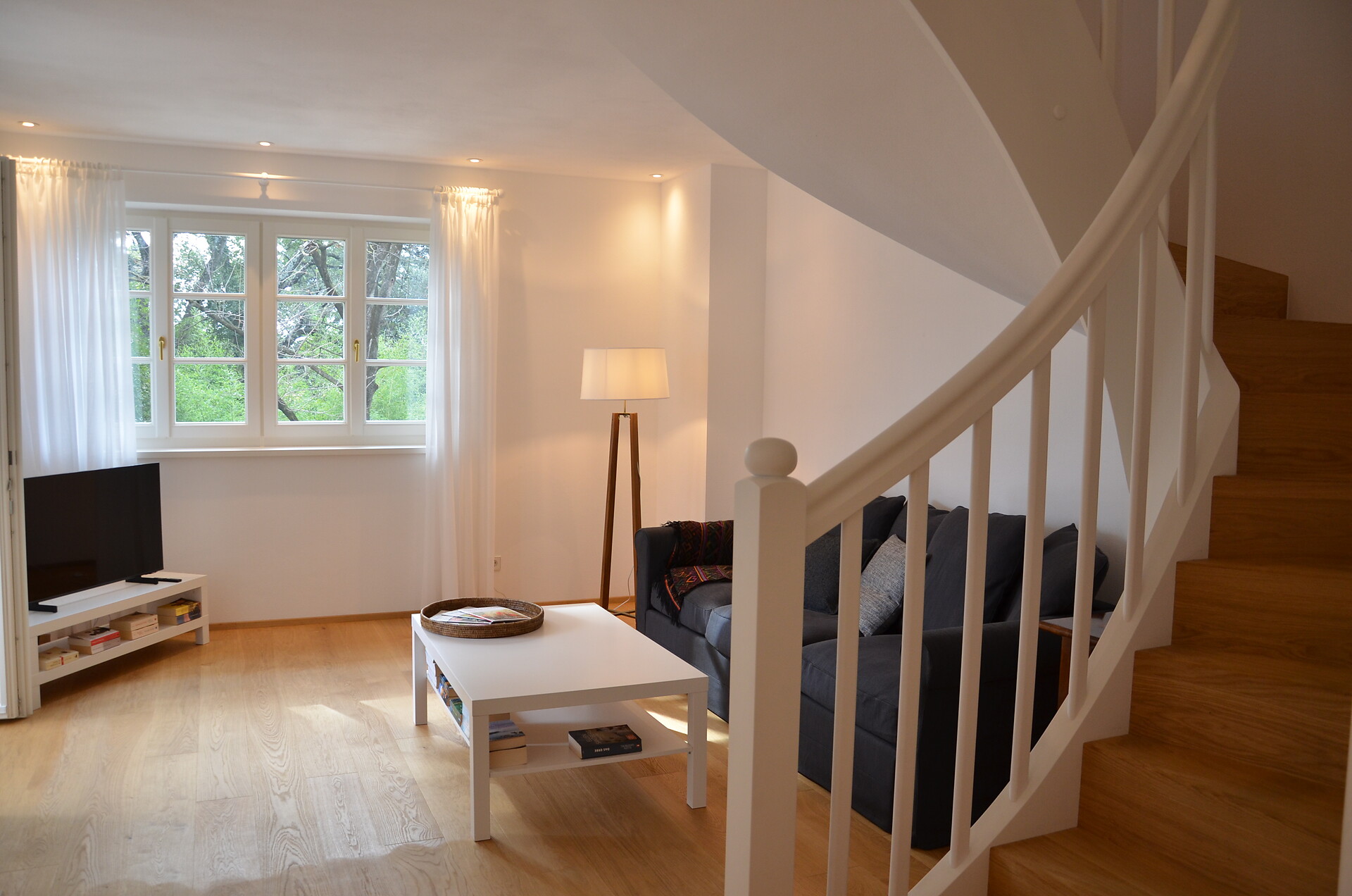 Das Apartment befindet sich im ersten Stock und ist über eine Außentreppe zu erreichen. Im ersten Stock finden Sie eine gut ausgestattete Küche, ein geräumiges Wohnzimmer mit einem gemütlichen Balkon sowie ein WC vor. Eine Holztreppe führt Sie zu den beiden behaglichen Schlafzimmern, die ebenfalls über einen Balkon verfügen und zu einem Badezimmer. Eines der Zimmer ist mit einem Bürotisch ausgestattet, um Ihren Aufenthalt so produktiv wie möglich zu gestalten.