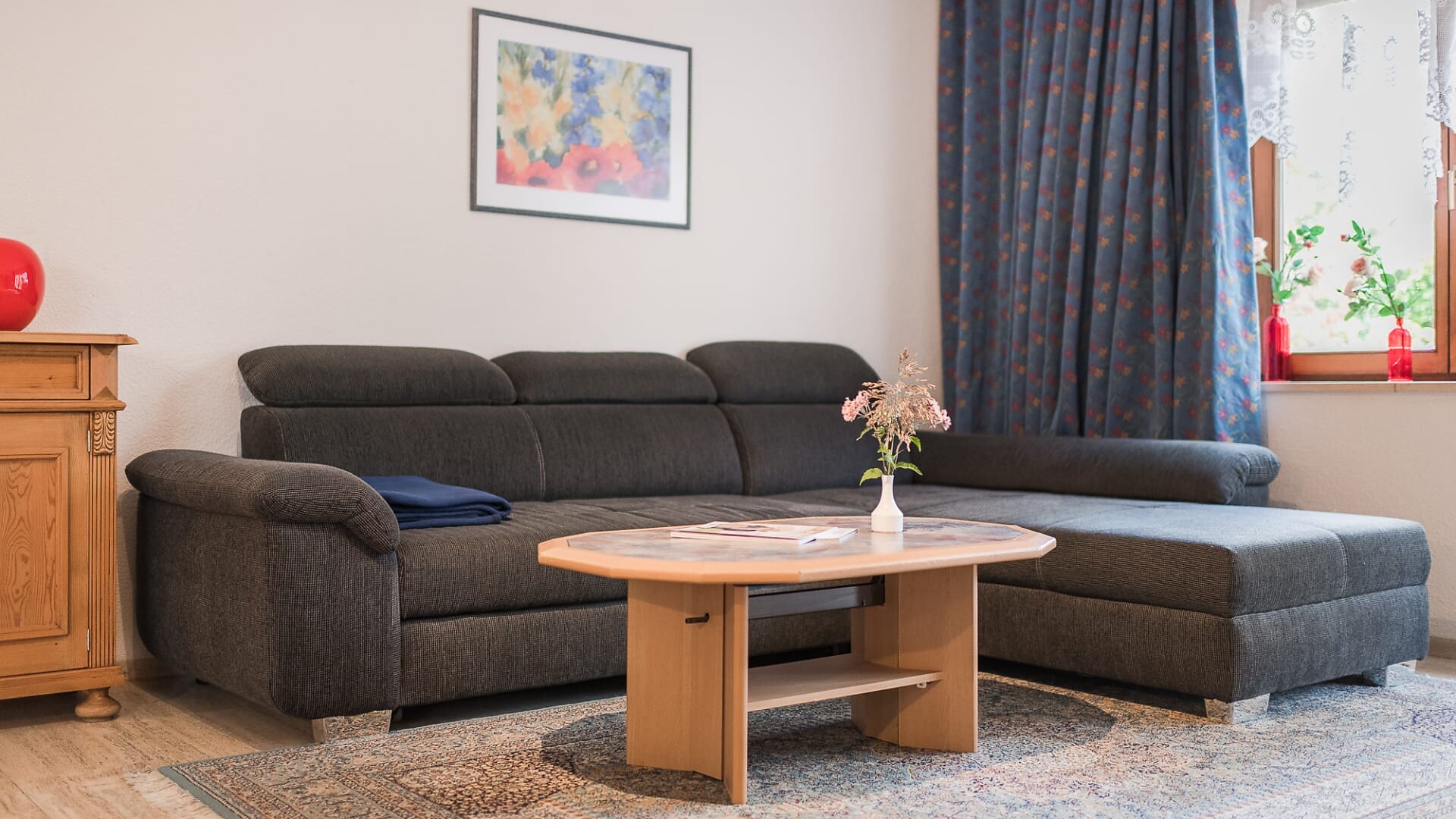 Schlafbereich mit Doppelbett und Wohnbereich mit Erker-Sitzecke, Doppelschlafcouch und Küchenzeile (Elektroherd, Kaffeemaschine und Zubehör inkl. Küchentücher – Benützung extra 35,00€/einmalig), Teppich- und Holzboden. Flat-TV, Telefon, kostenloses W-LAN, Safe und Kühlschrank.
