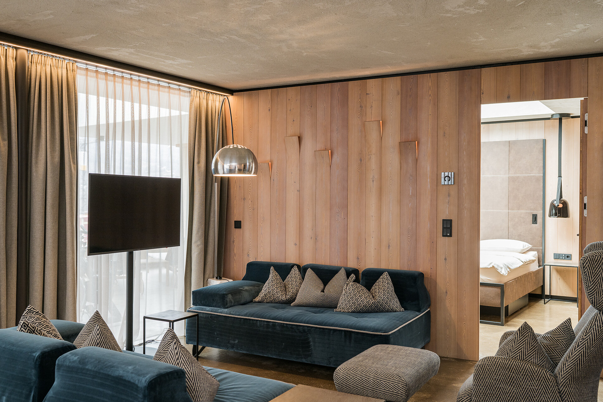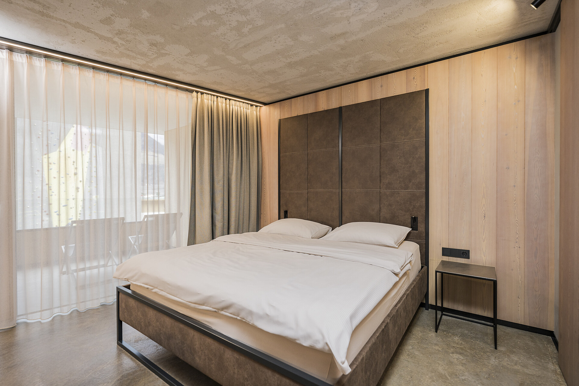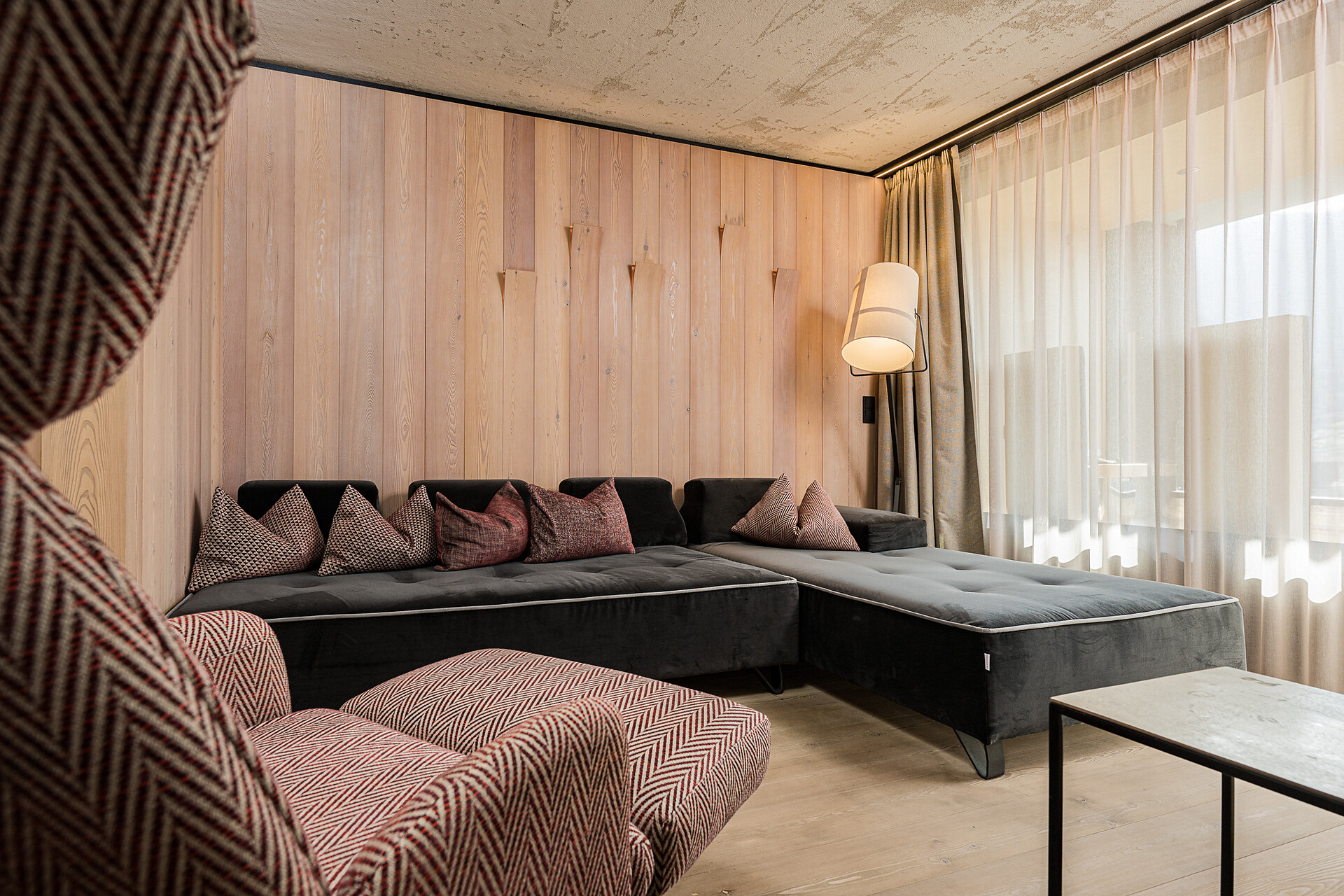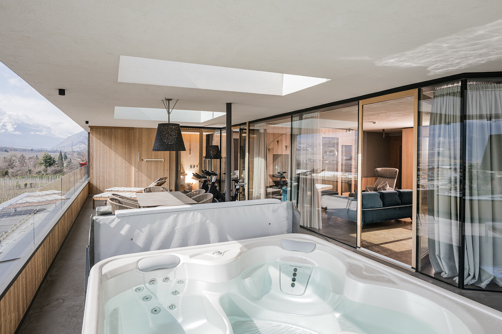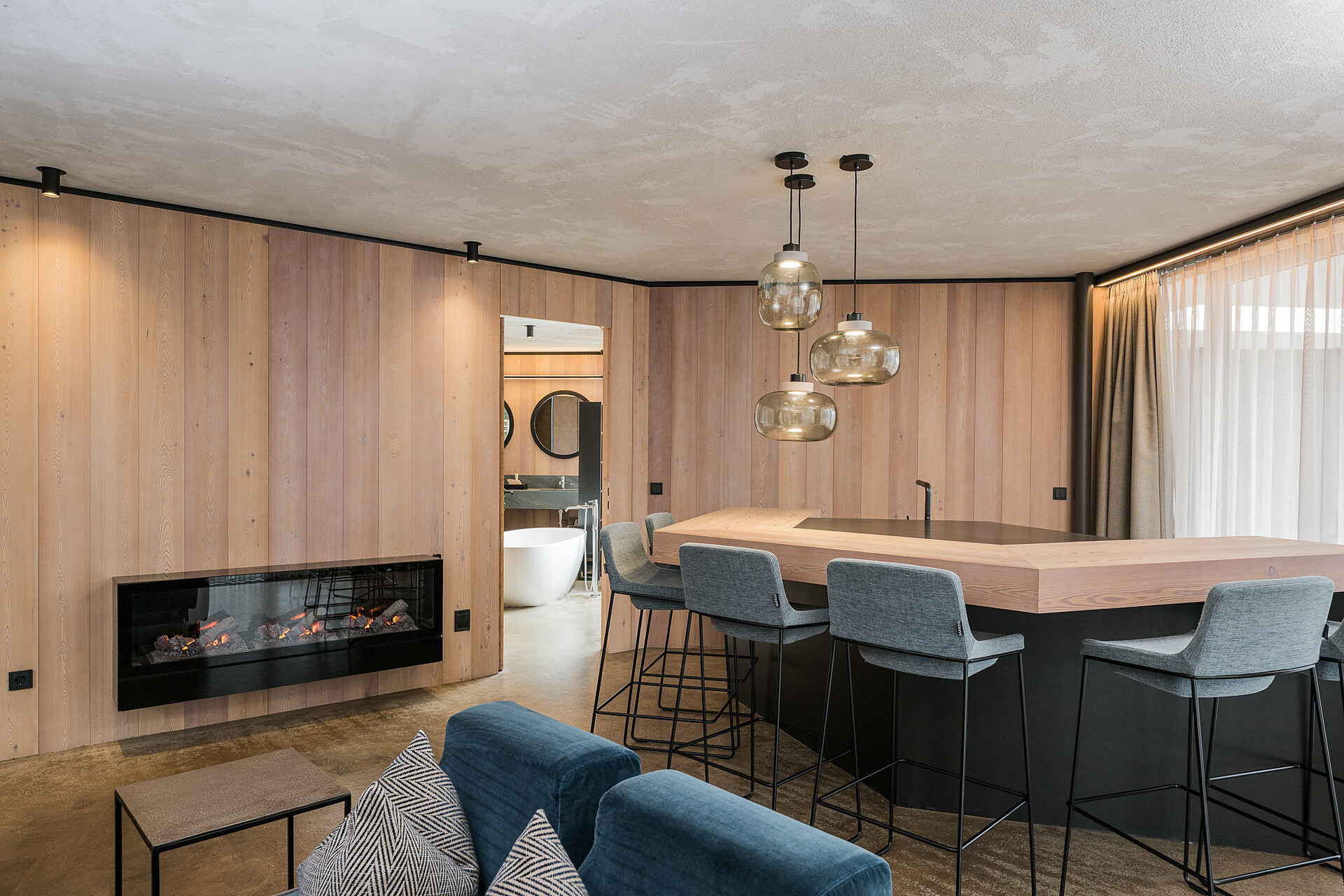Black & White Suite (70 m², 2-4 Personen): Luxussuite im 5. Stock, geräumiger Wohn-Schlafraum, luxuriöse Couch, Sitzecke, Massagestuhl, abgetrenntes Kinderschlafzimmer mit Stockbetten, Marmorboden, Bad mit Dusche und Badewanne, separates-WC, Flat-TV, gratis W-Lan, Minibar, Safe, offener Kamin, Süd-Ost Terrasse von 40m² mit Panorama-Bio-& Finnische Sauna, Tauchbecken, Kuschelliege, Garage