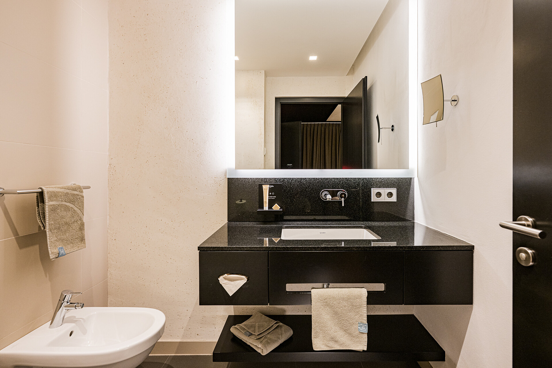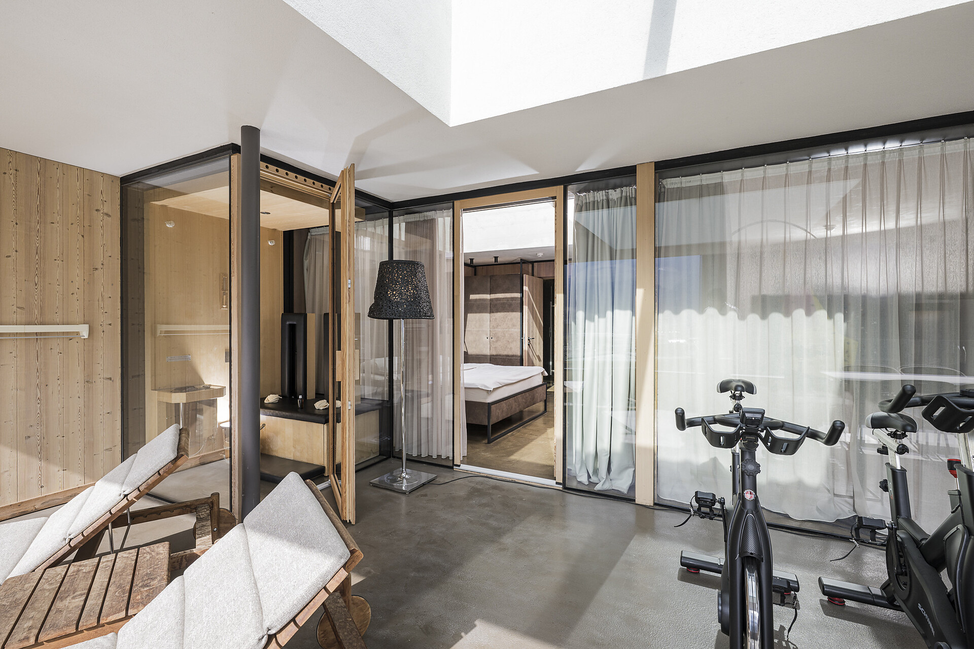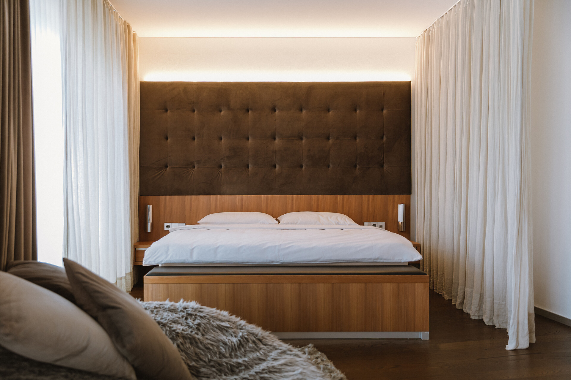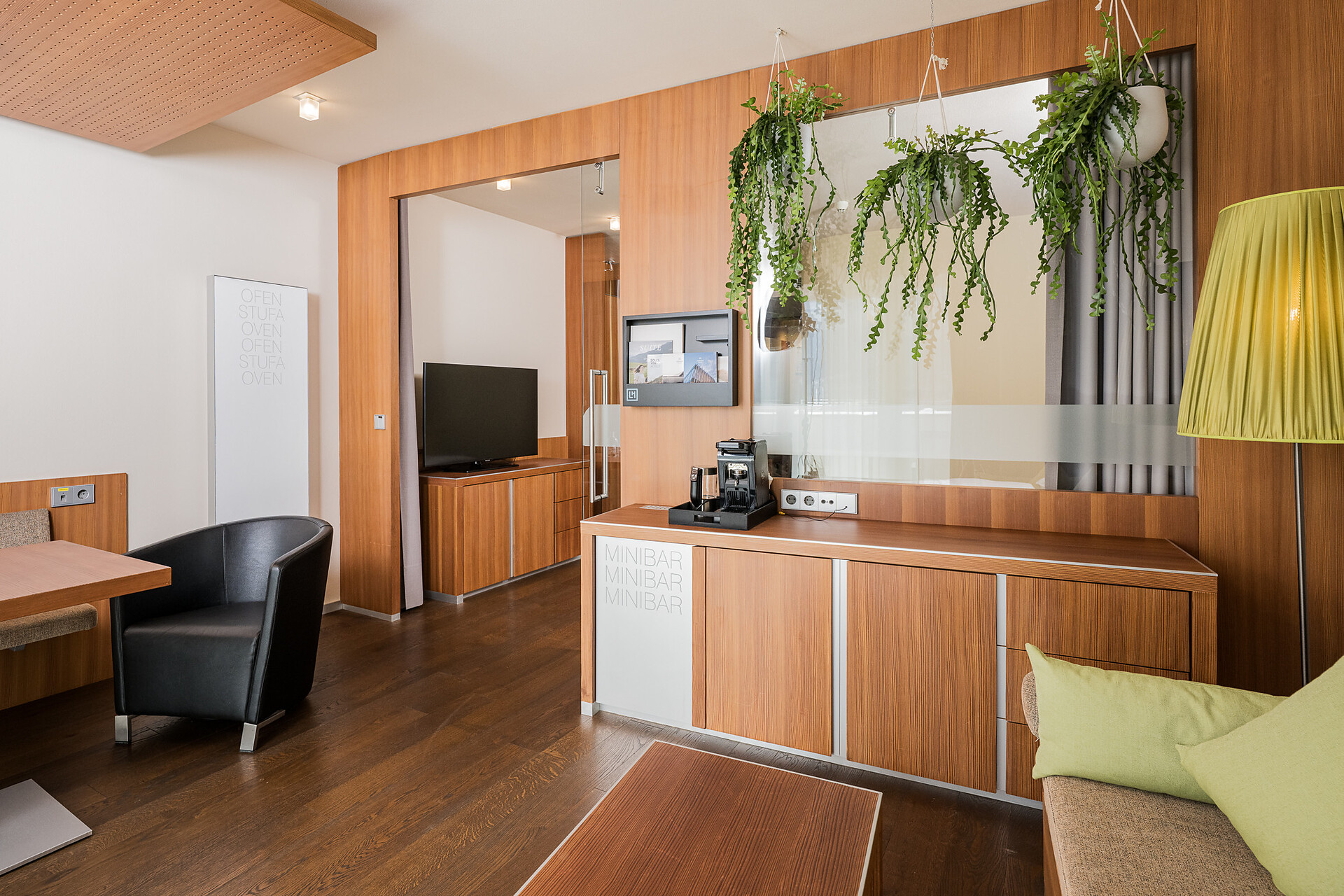 Black & White Suite (70 m², 2-4 Personen): Luxussuite im 5. Stock, geräumiger Wohn-Schlafraum, luxuriöse Couch, Sitzecke, Massagestuhl, abgetrenntes Kinderschlafzimmer mit Stockbetten, Marmorboden, Bad mit Dusche und Badewanne, separates-WC, Flat-TV, gratis W-Lan, Minibar, Safe, offener Kamin, Süd-Ost Terrasse von 40m² mit Panorama-Bio-& Finnische Sauna, Tauchbecken, Kuschelliege, Garage