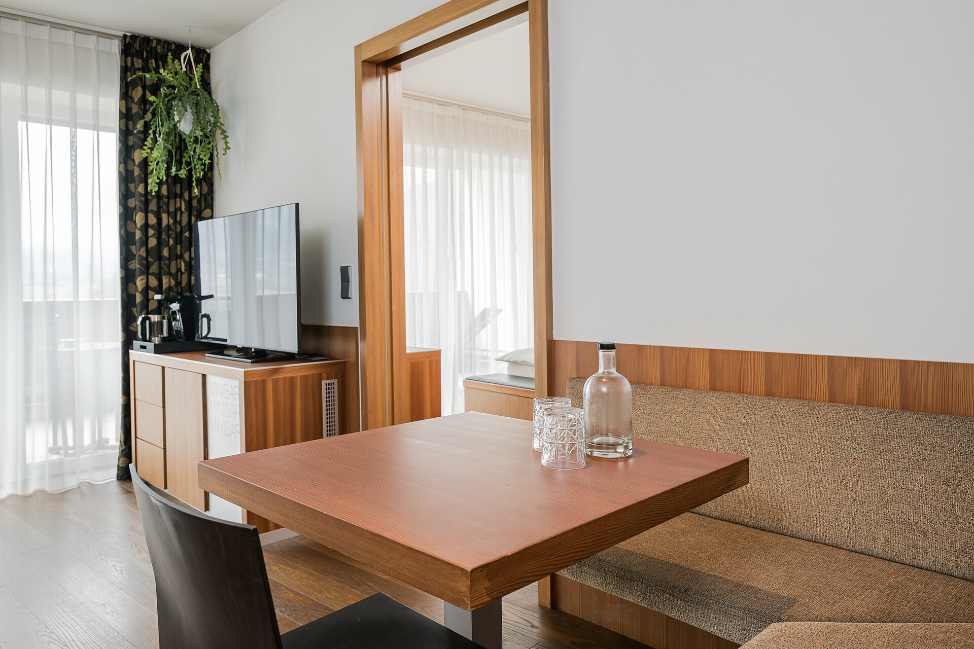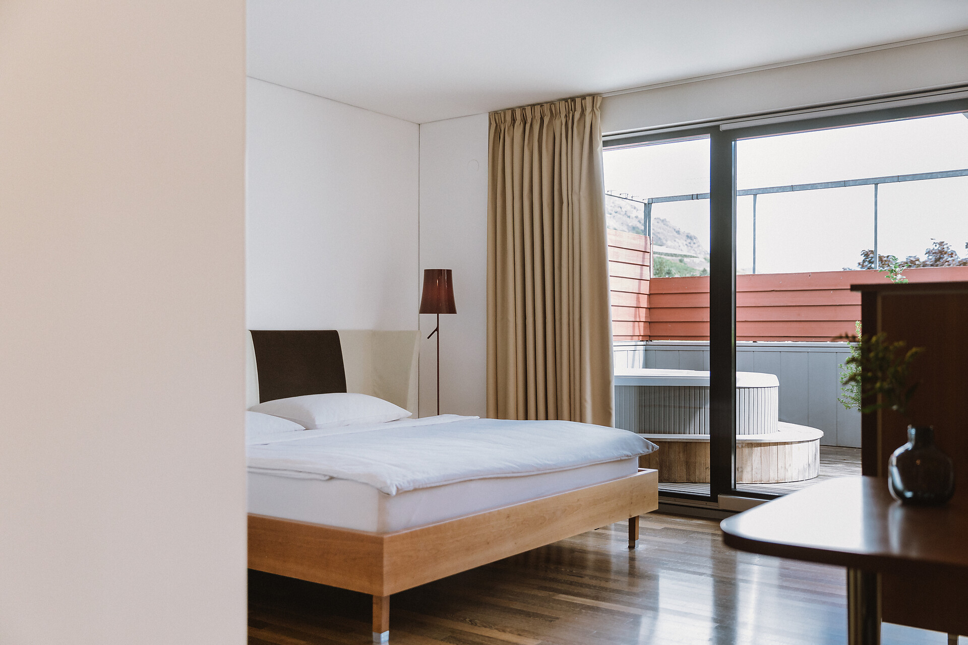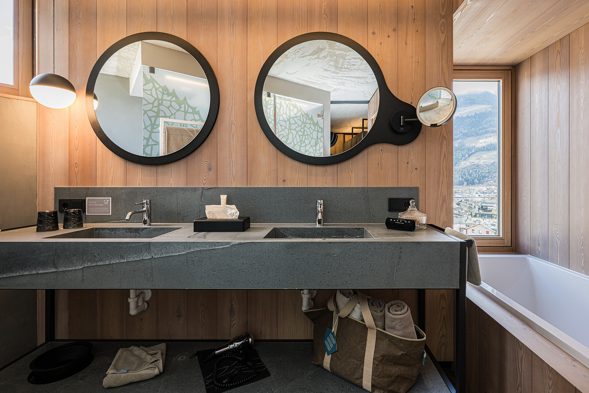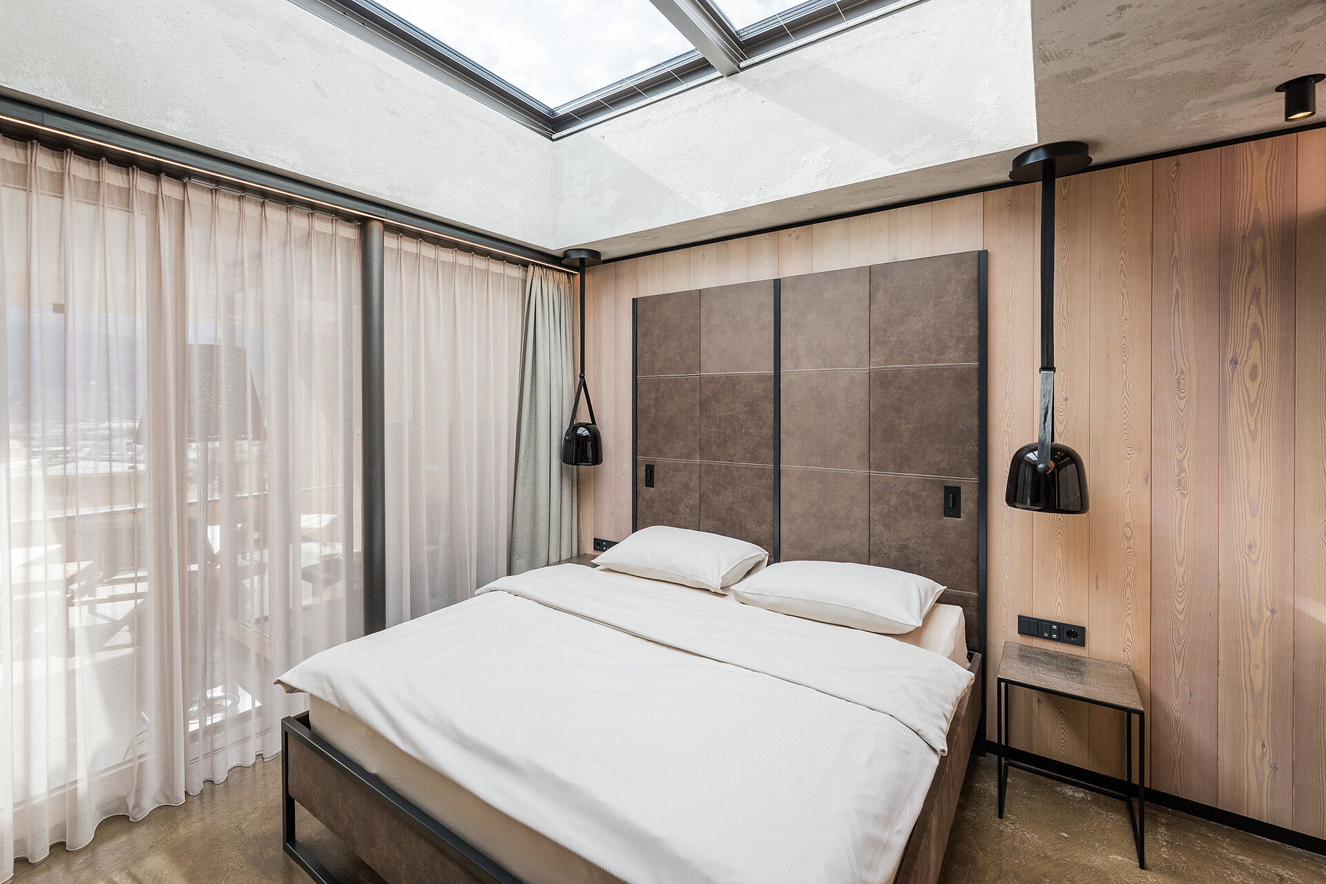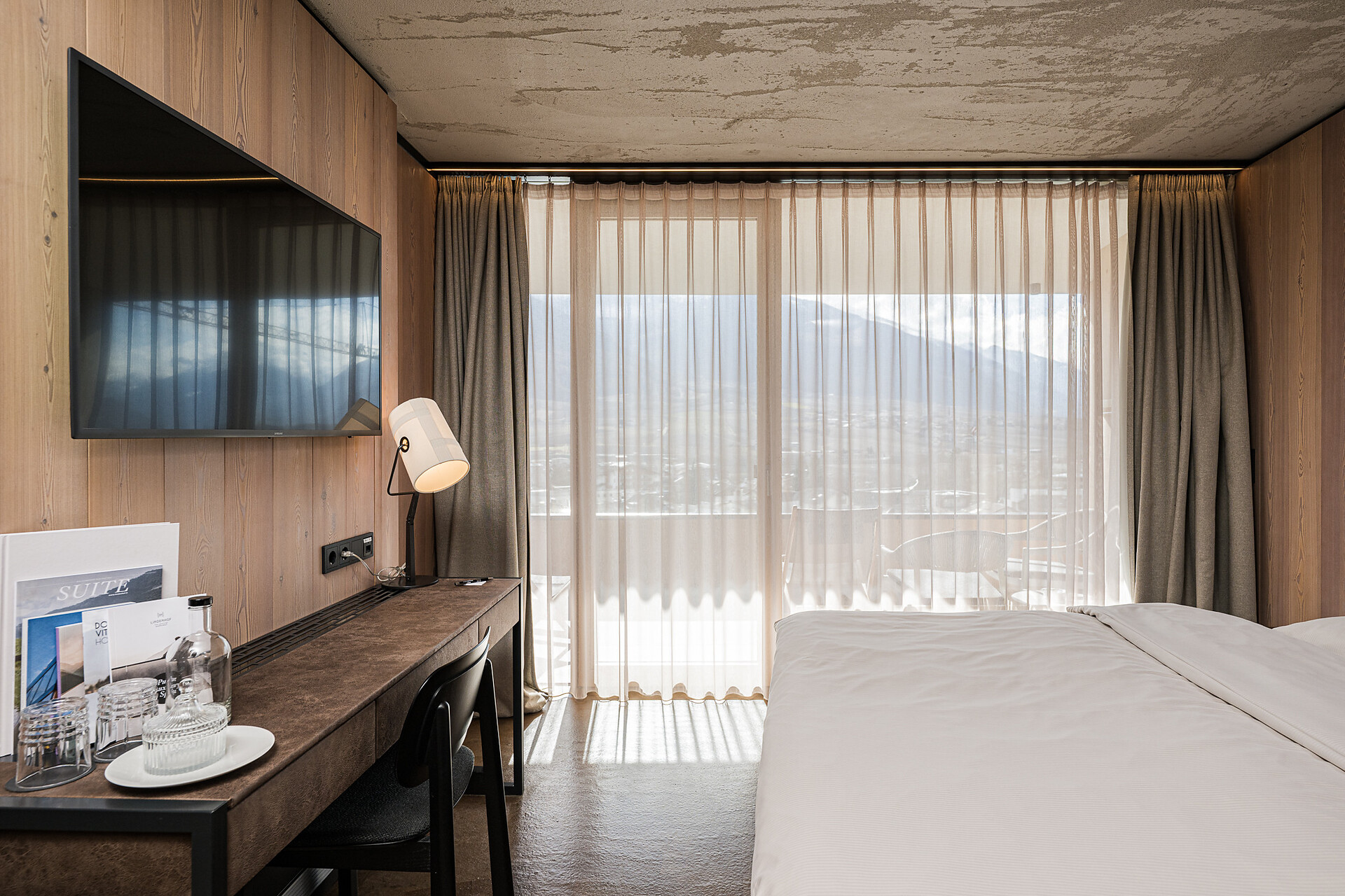 Black & White Suite (70 m², 2-4 Personen): Luxussuite im 5. Stock, geräumiger Wohn-Schlafraum, luxuriöse Couch, Sitzecke, Massagestuhl, abgetrenntes Kinderschlafzimmer mit Stockbetten, Marmorboden, Bad mit Dusche und Badewanne, separates-WC, Flat-TV, gratis W-Lan, Minibar, Safe, offener Kamin, Süd-Ost Terrasse von 40m² mit Panorama-Bio-& Finnische Sauna, Tauchbecken, Kuschelliege, Garage